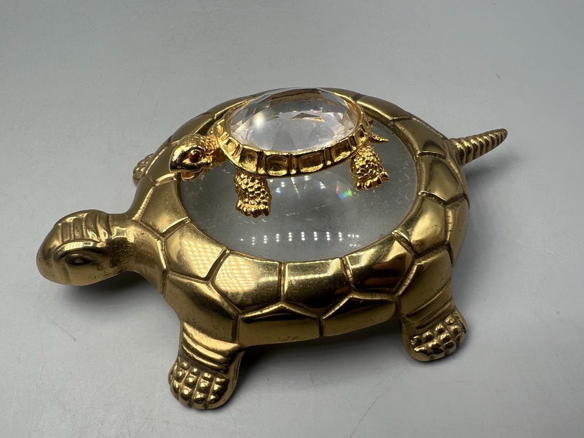Gold Metal Tortoise Desktop Magnifying Glass & Small Turtle Faux Clear Jewel Trinket Piece