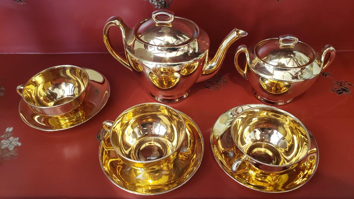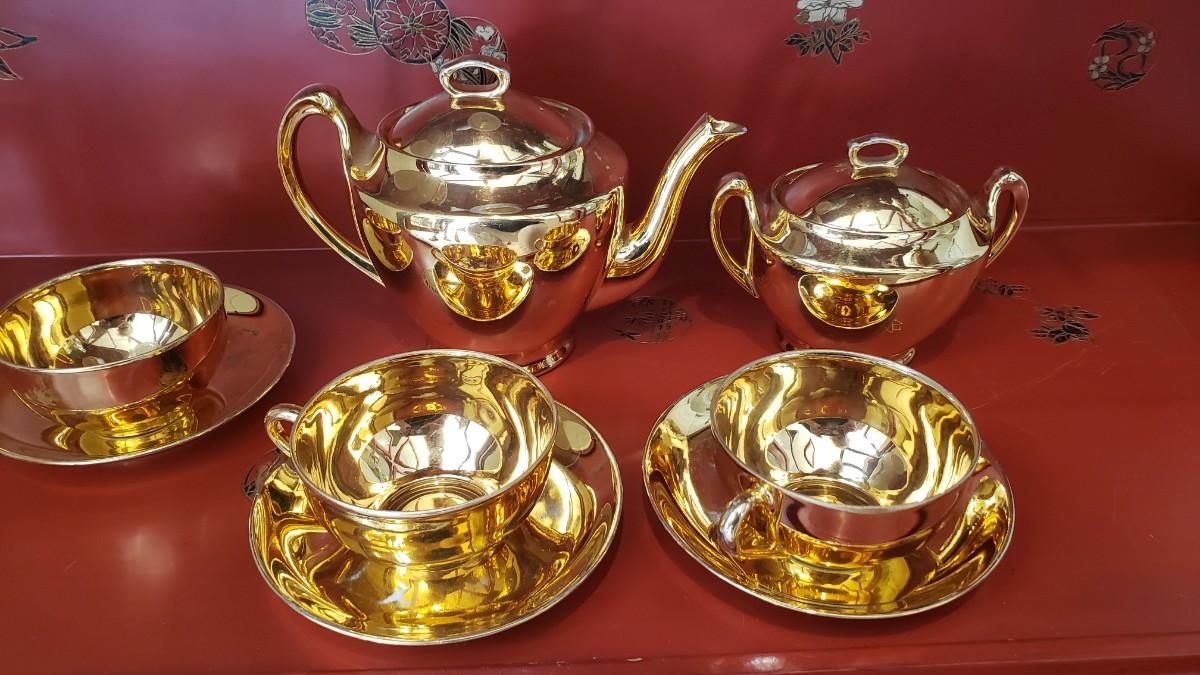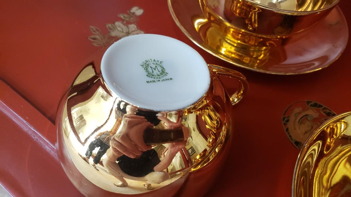 Gold Noritake small teapot three cups and saucers and the Sugar Bowl some of the gold is worn in places