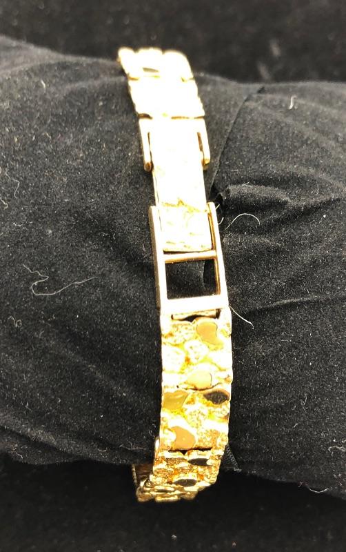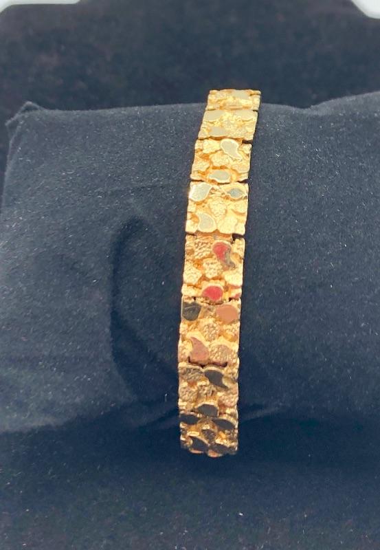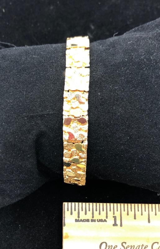 Gold Nugget style link bracelet. Heavy. No mark found but tested at 14k. 3/8' wide & 7" length.