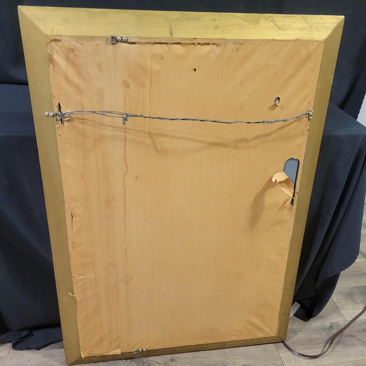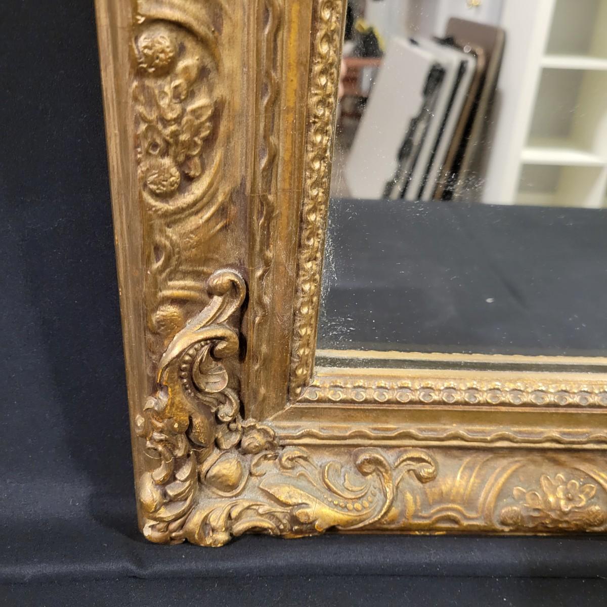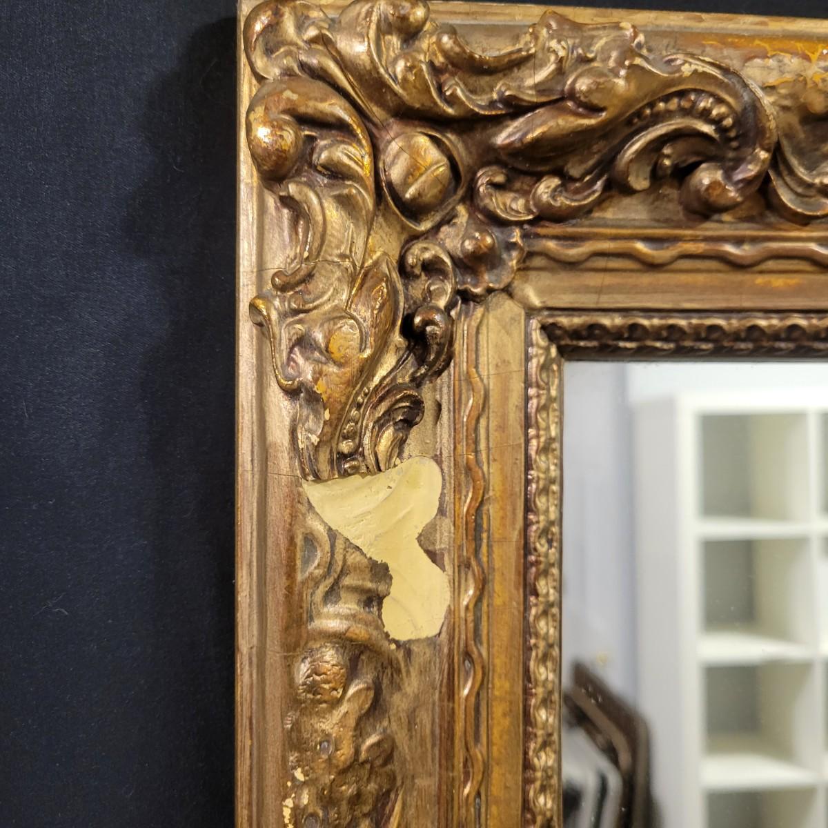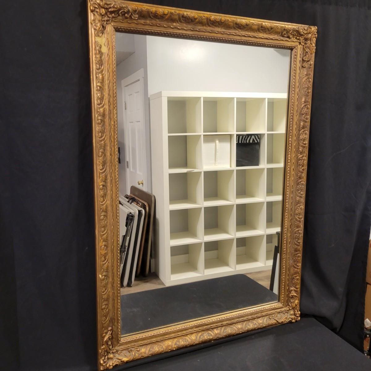 A flat mirror in an ornate gold frame. The frame is made of wood with plaster mold details with an antiqued gold finish. It measures approximately 29" x 1" x 41.5"H. Some damage seen on the decoration; please see photos. Local pickup only.