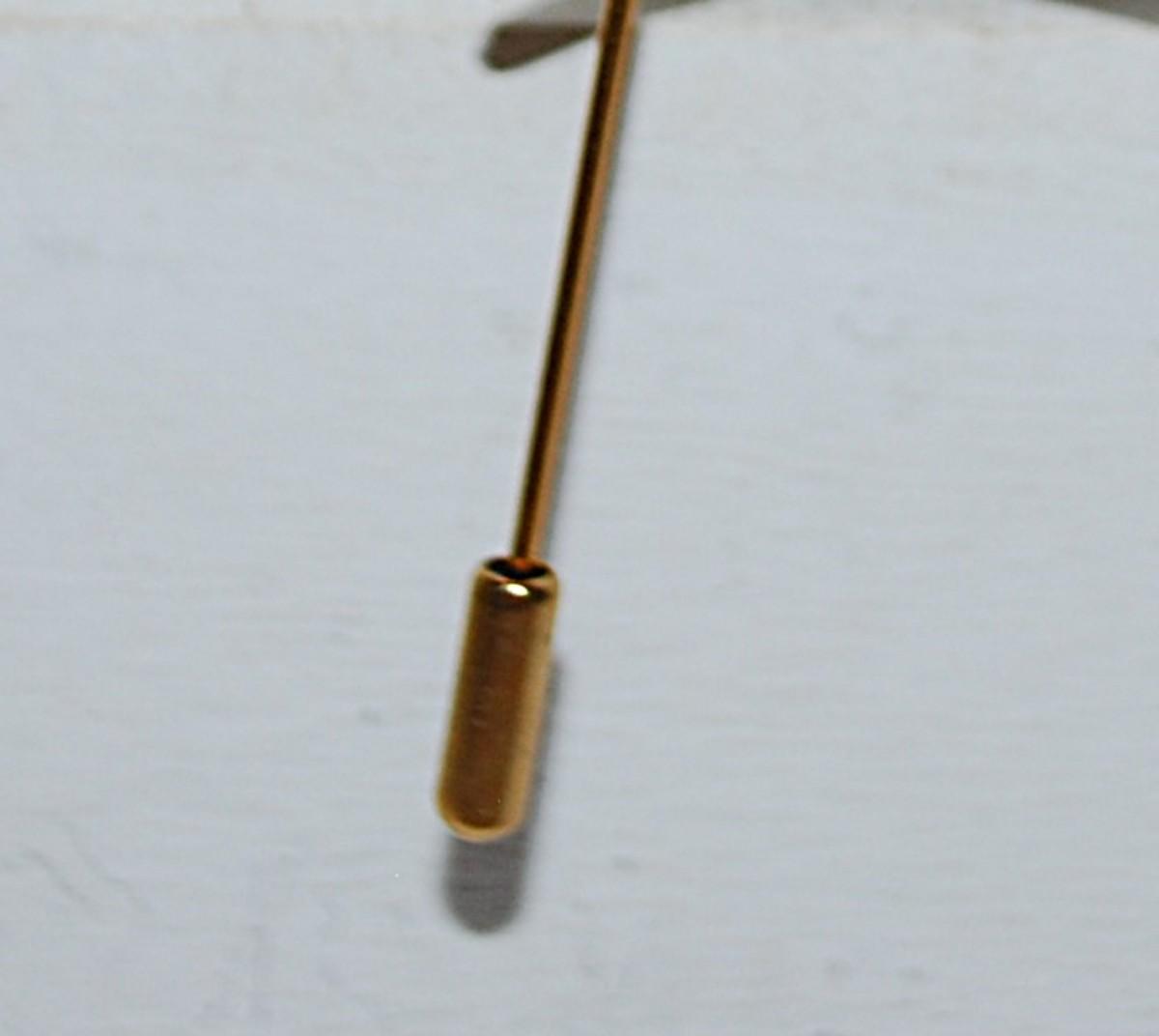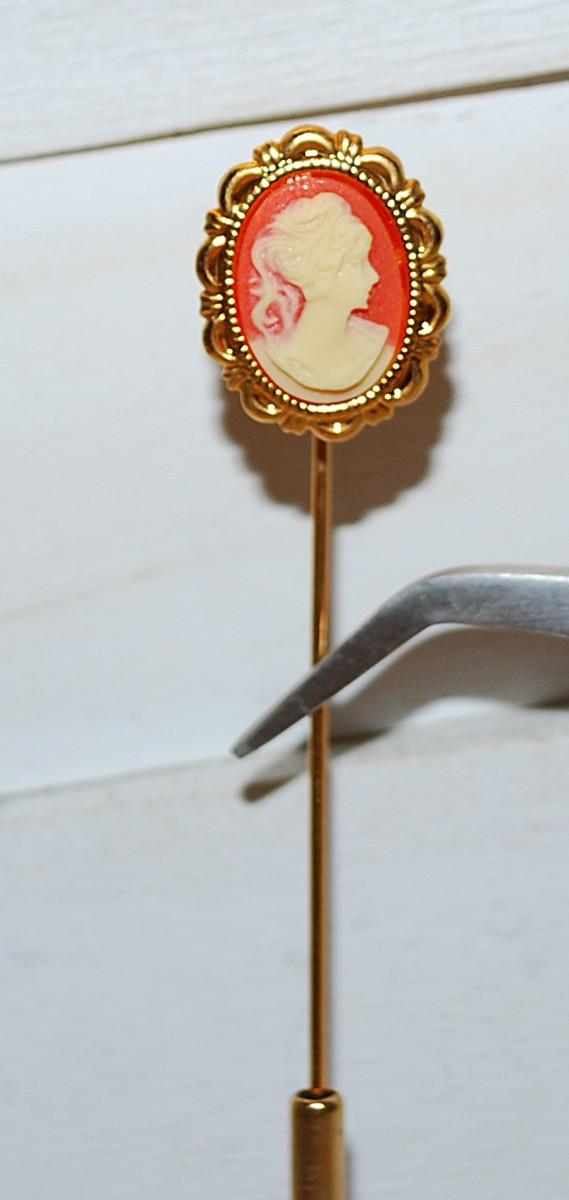Gold Oval Perimeter Red & White CAMEO HAT PIN (4" L) with Screw-on Security Clasp