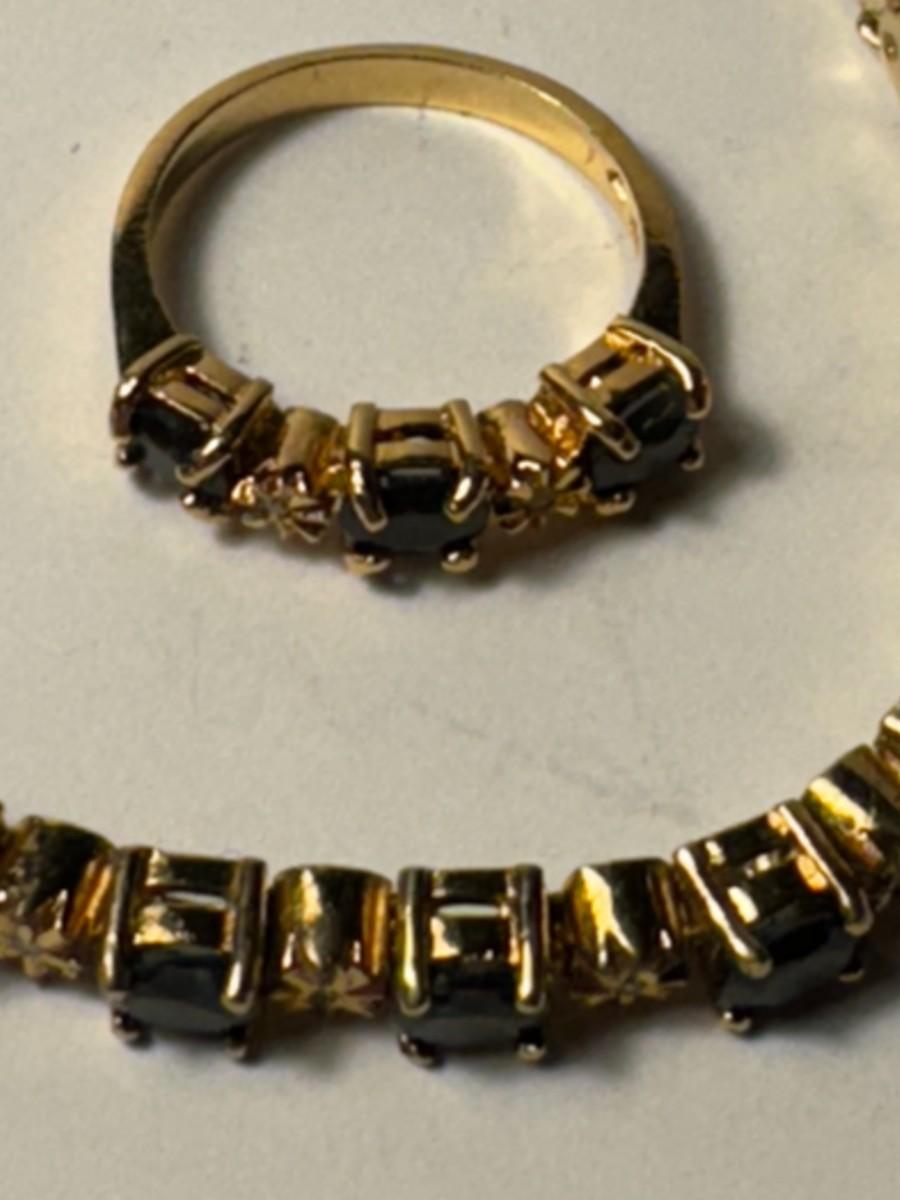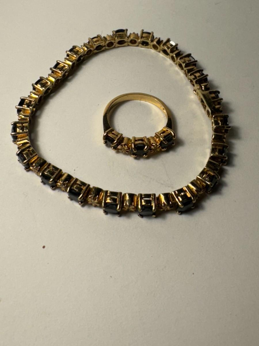 Bracelet and a matching ring, both adorned with what appear to be dark, possibly black or deep blue, gemstones. These are gold over .925 silver pieces, possibly featuring sapphires or black spinel gemstones.