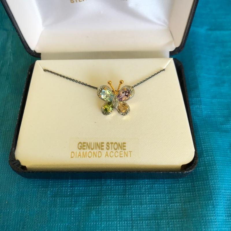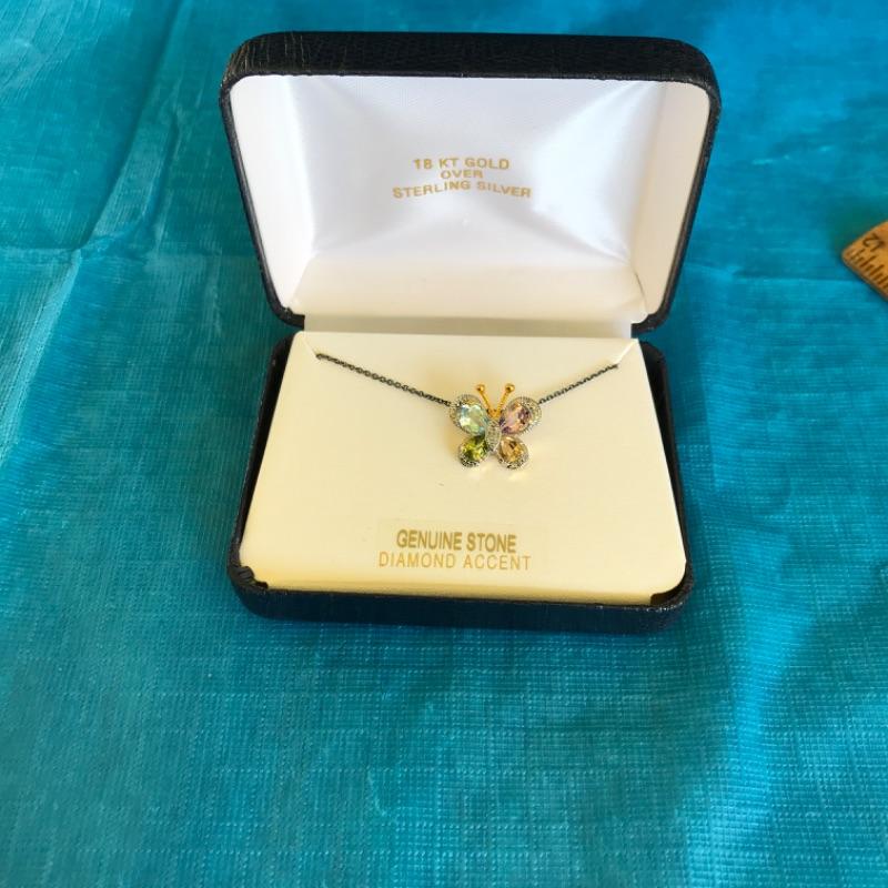 Cute multi-colored stone Butterfly necklace. Genuine stones with small diamond accents. 18k gold plate. The necklace has discolored from age. It comes in the gift box.