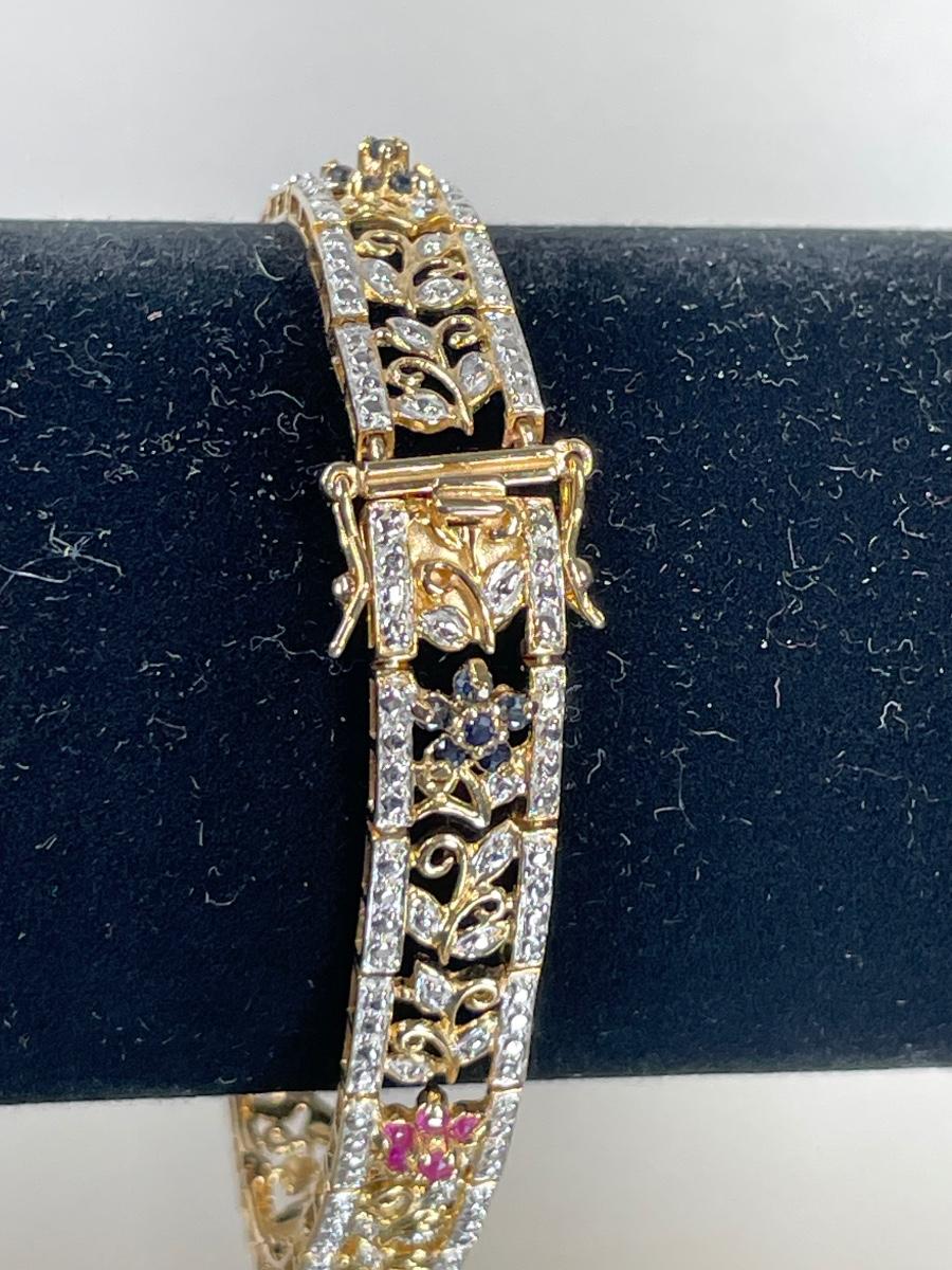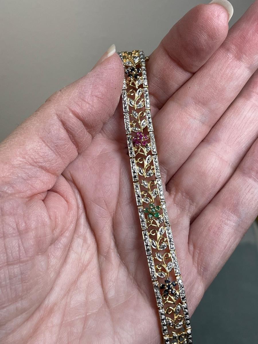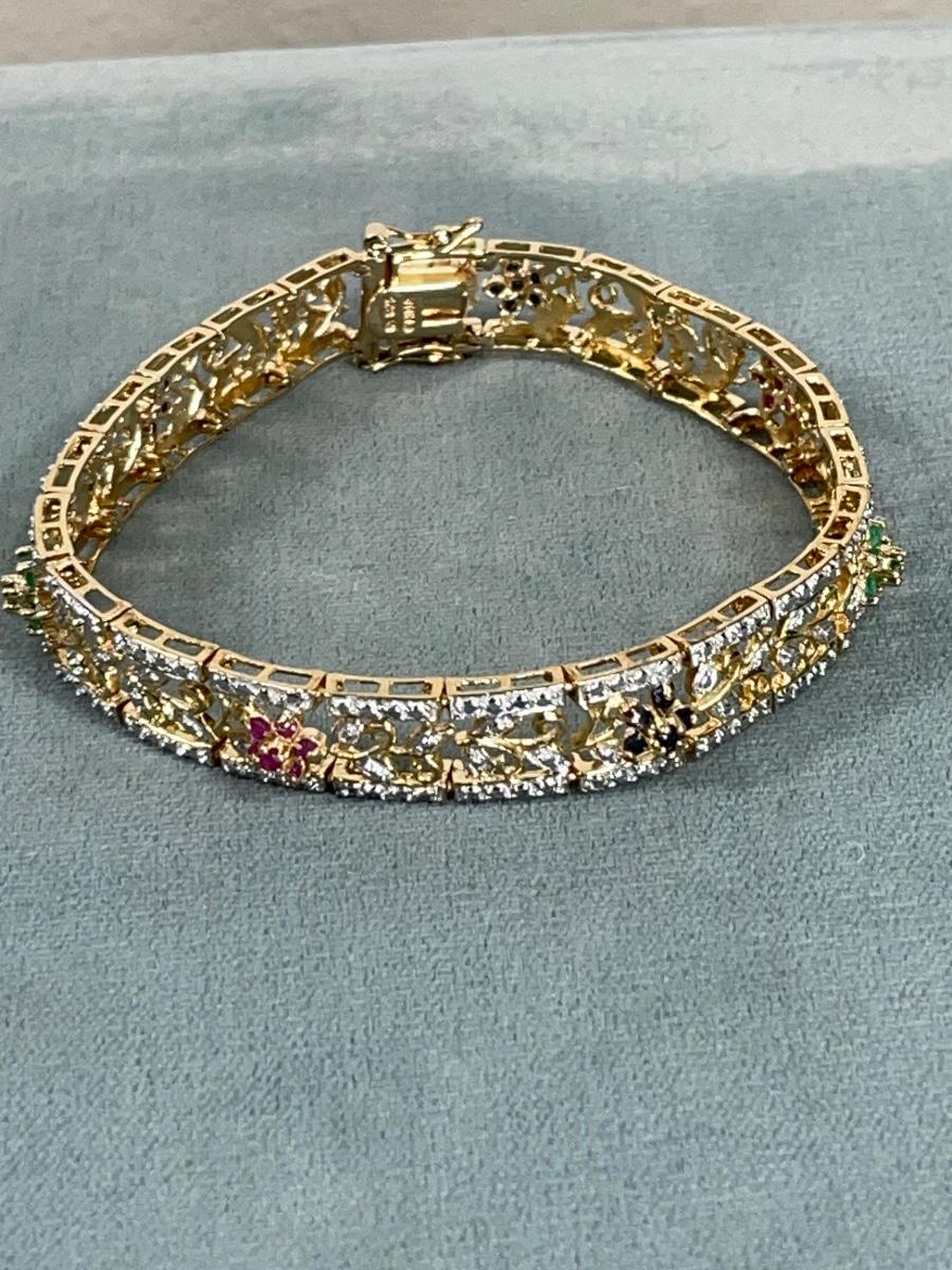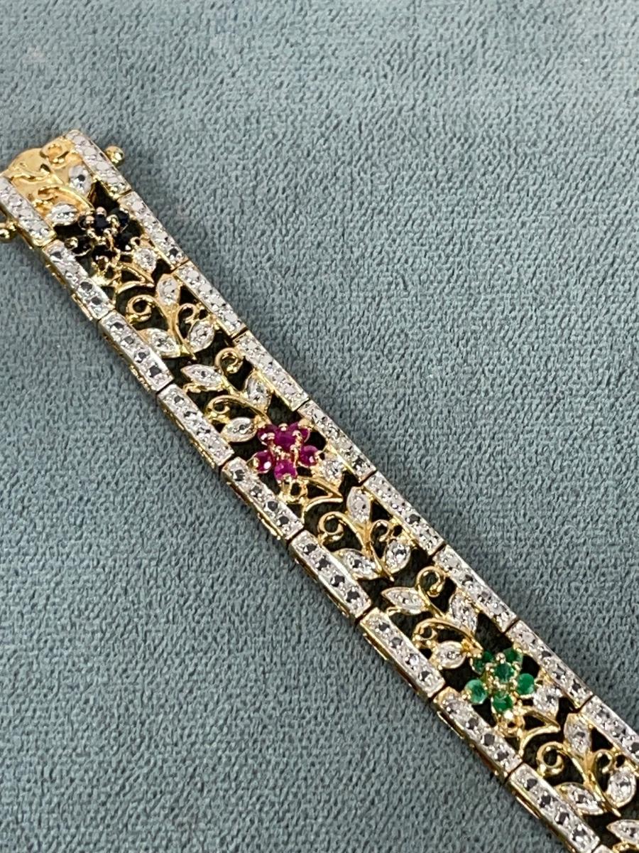 With sapphire, ruby and emerald accents. 7 1/4” long with secure clasp. Excellent condition.