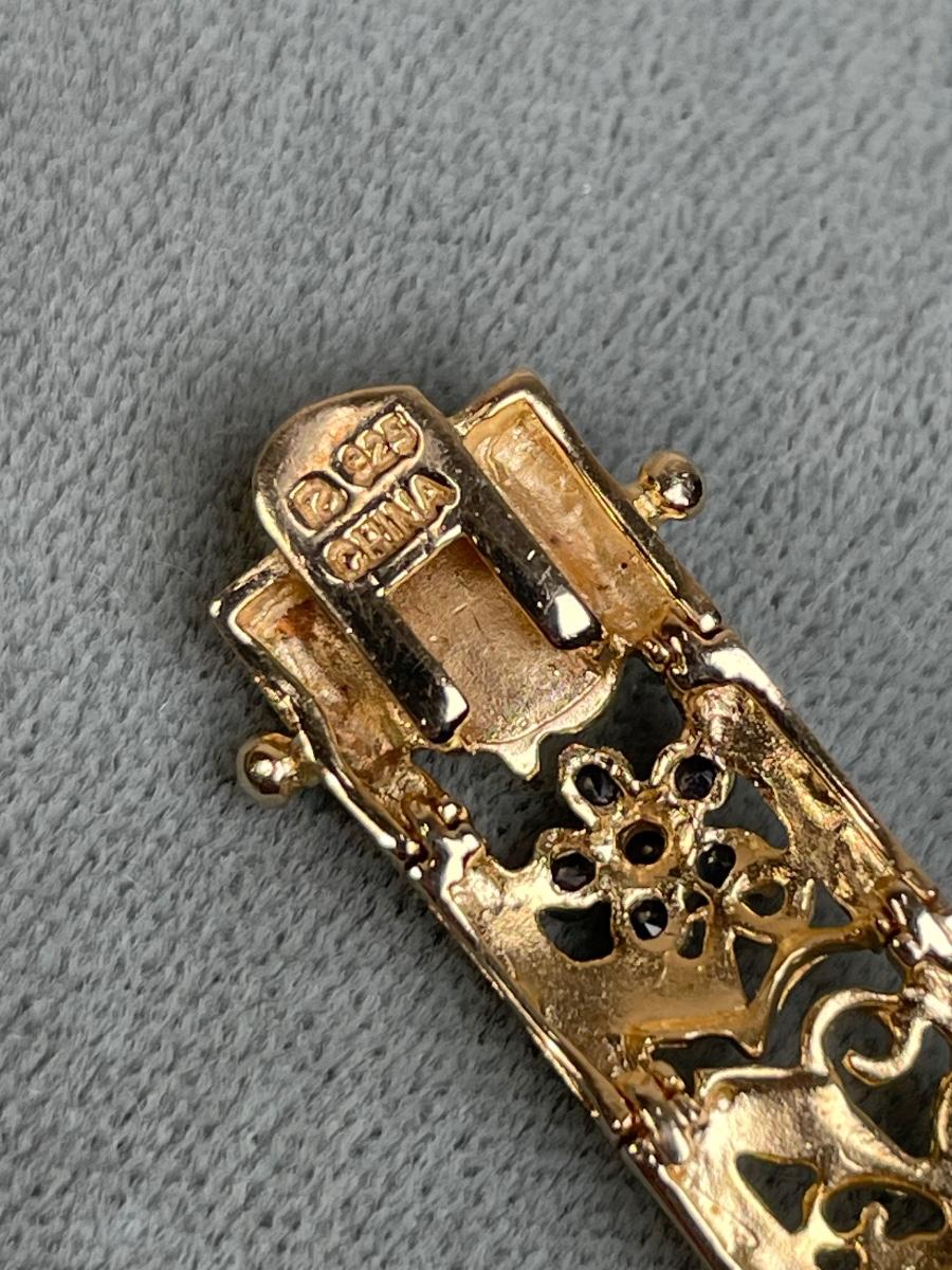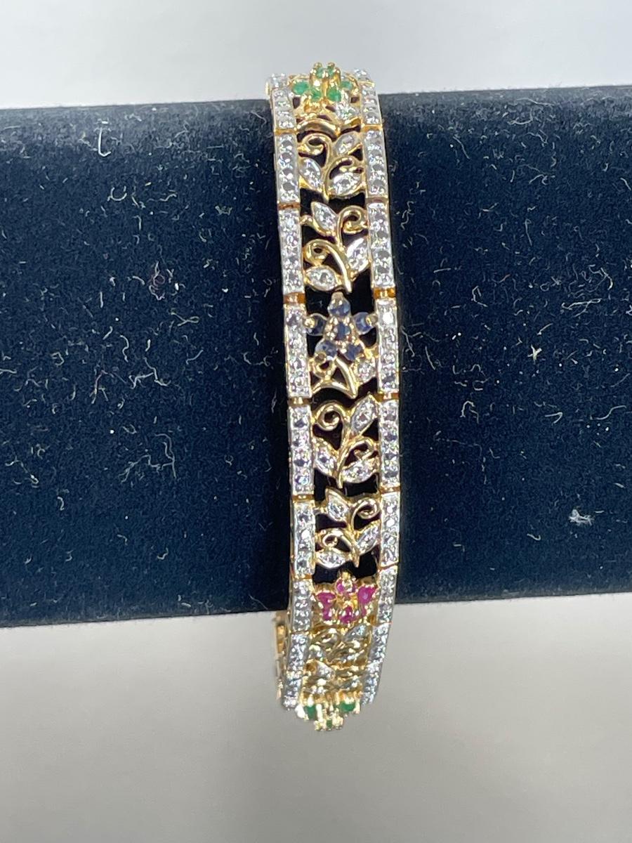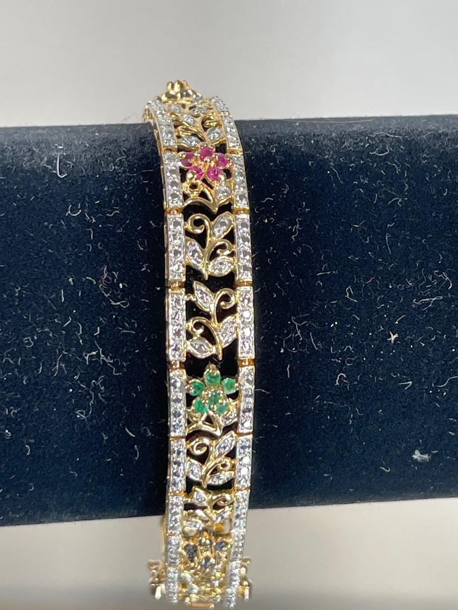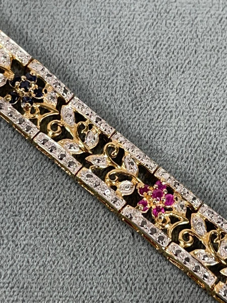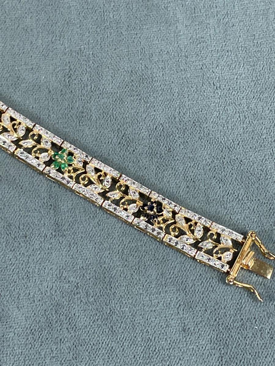With sapphire, ruby and emerald accents. 7 1/4” long with secure clasp. Excellent condition.