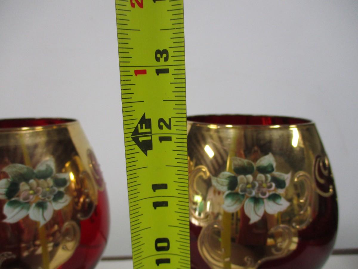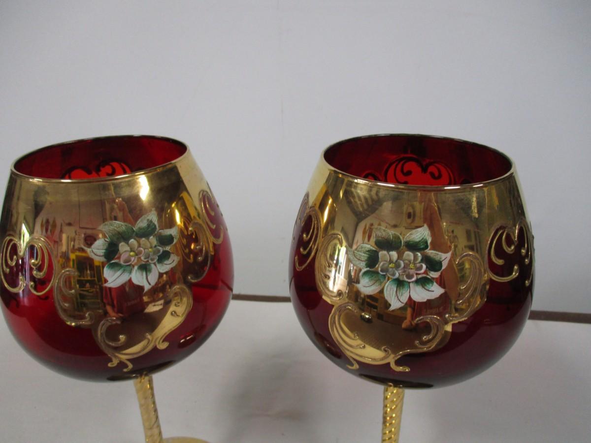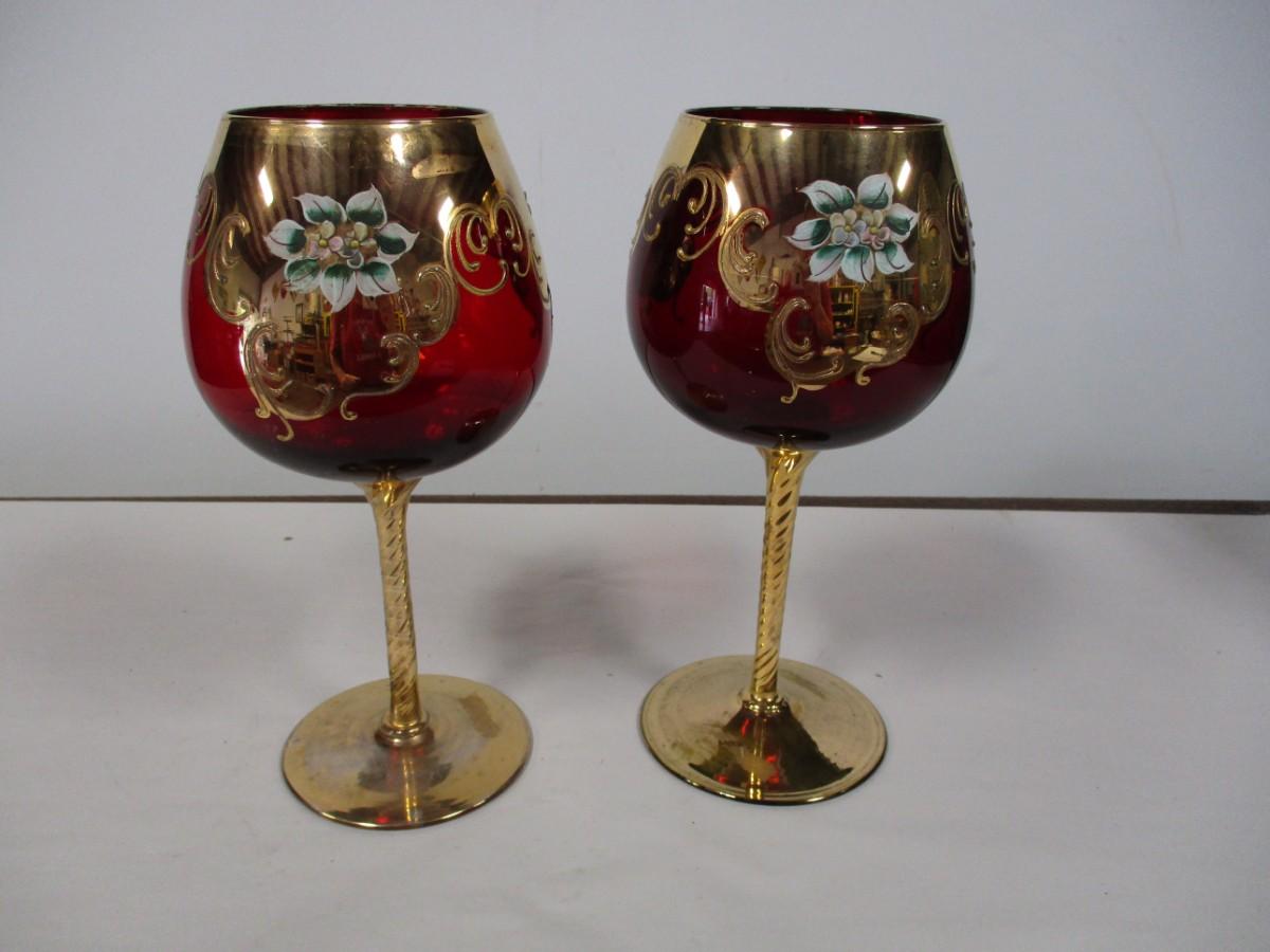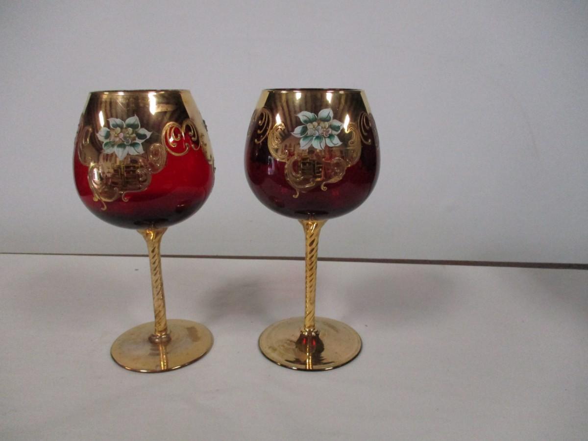Gold Overlay Cranberry Bohemian Glass Wine Goblets