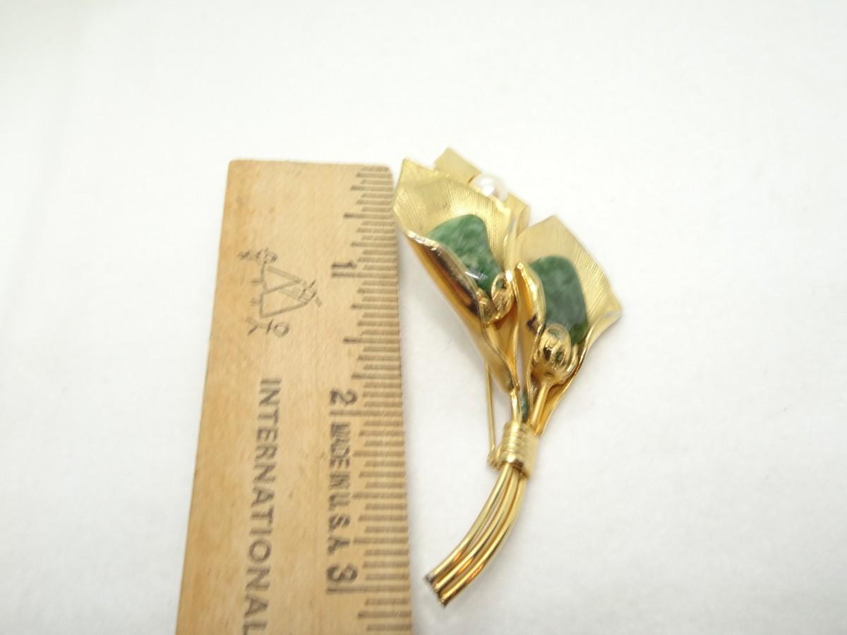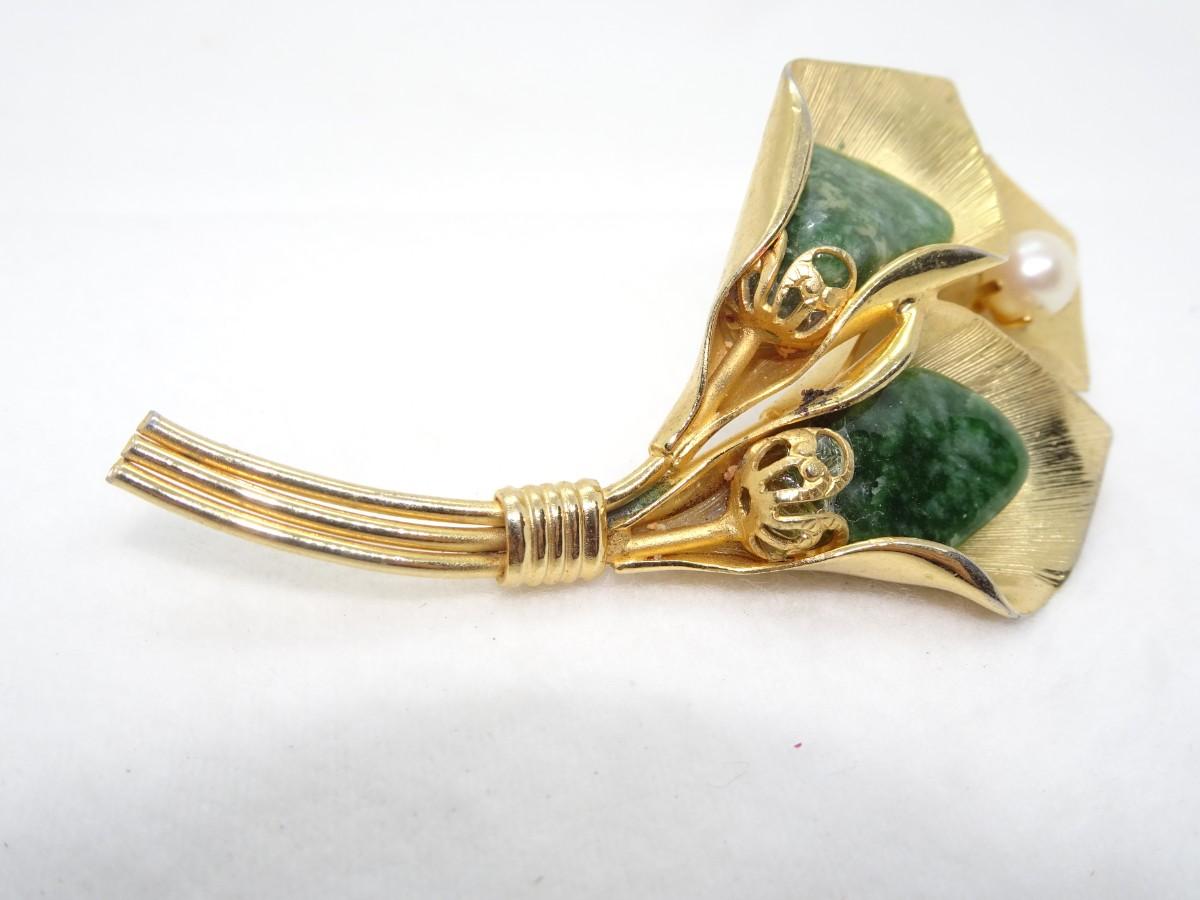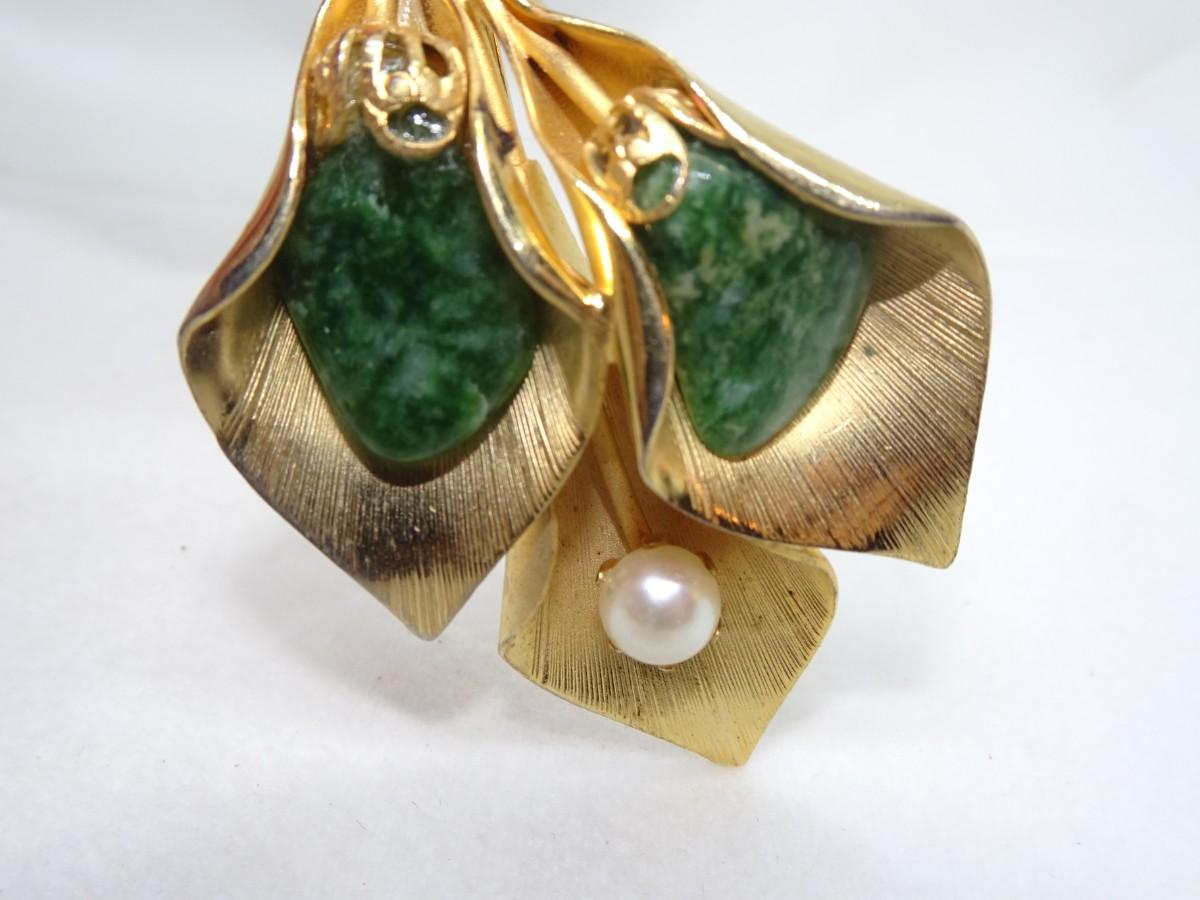 Gold Overlay, Triple Lily Pin, Jasper & Pearl - Mid Century