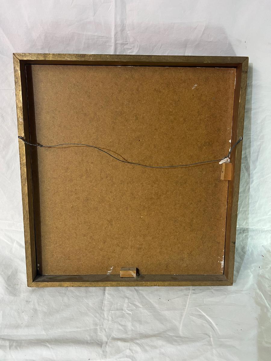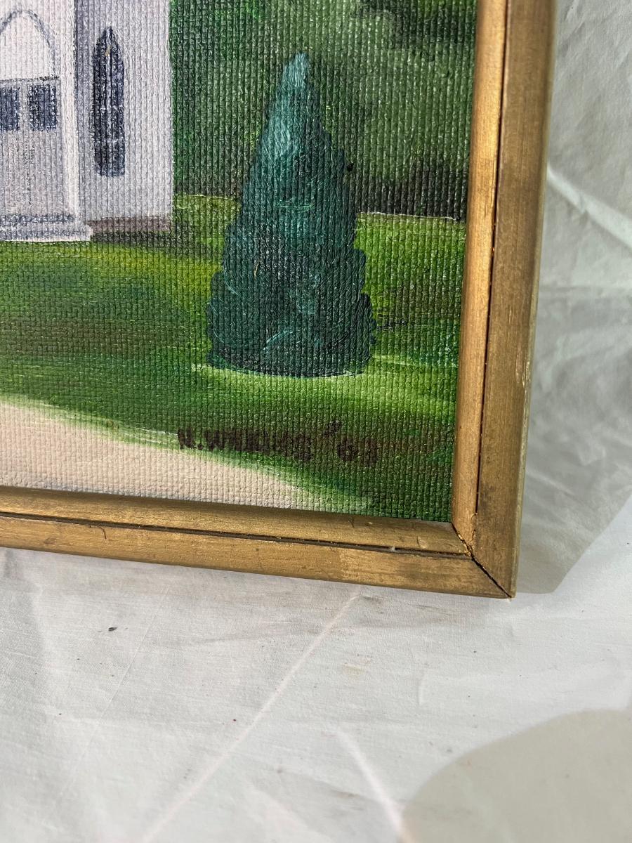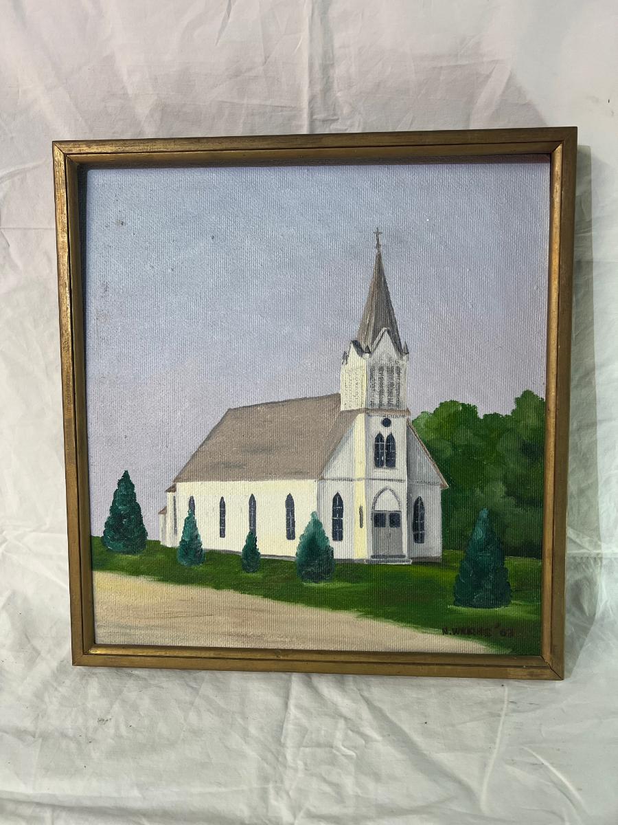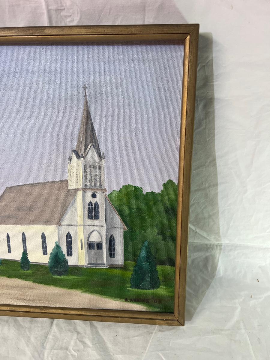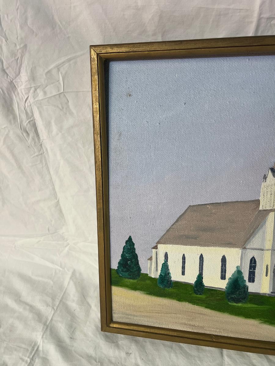 Gold Painted Wood Frame of Painted Church dated '63 with signature at bottom. Dimensions 16" x 17"