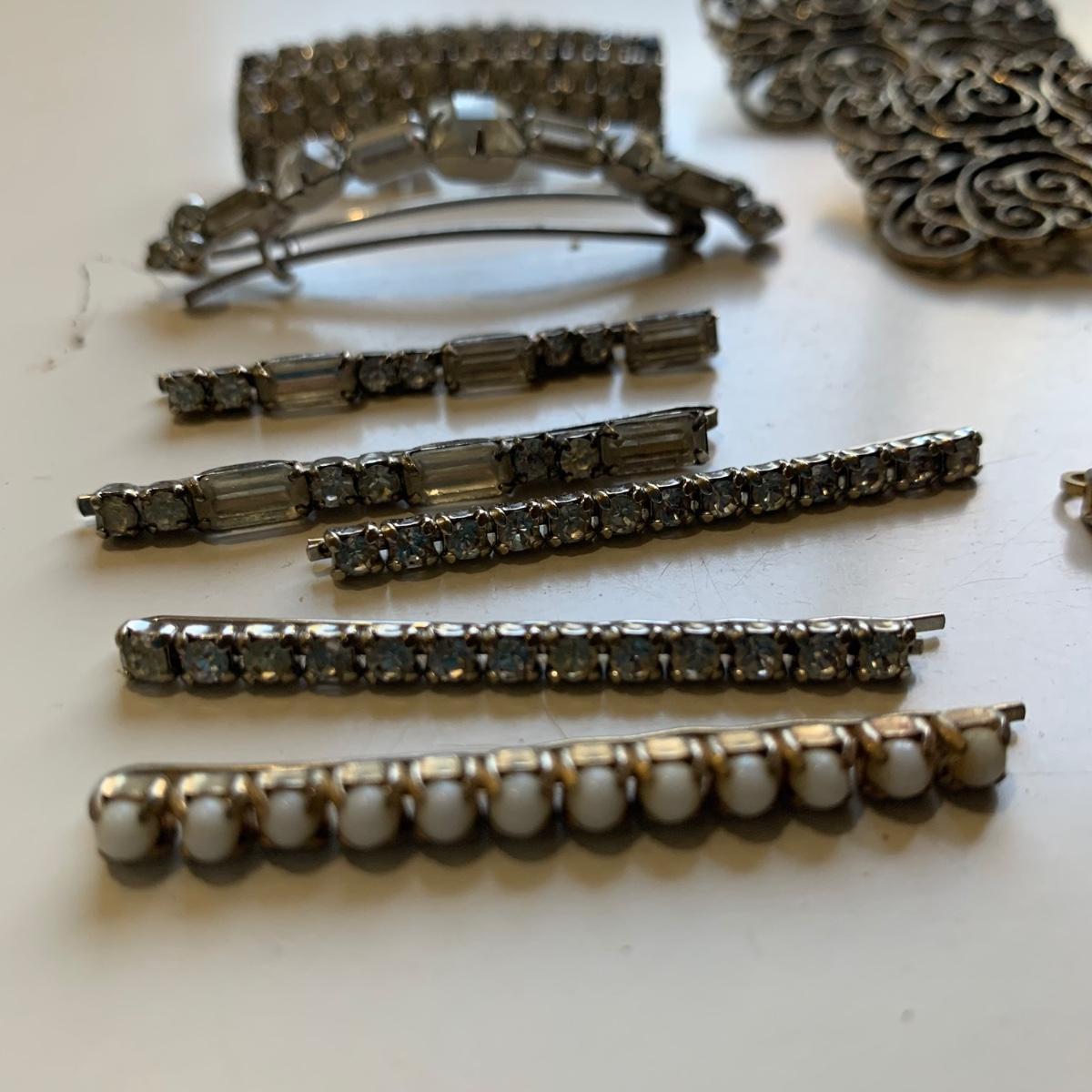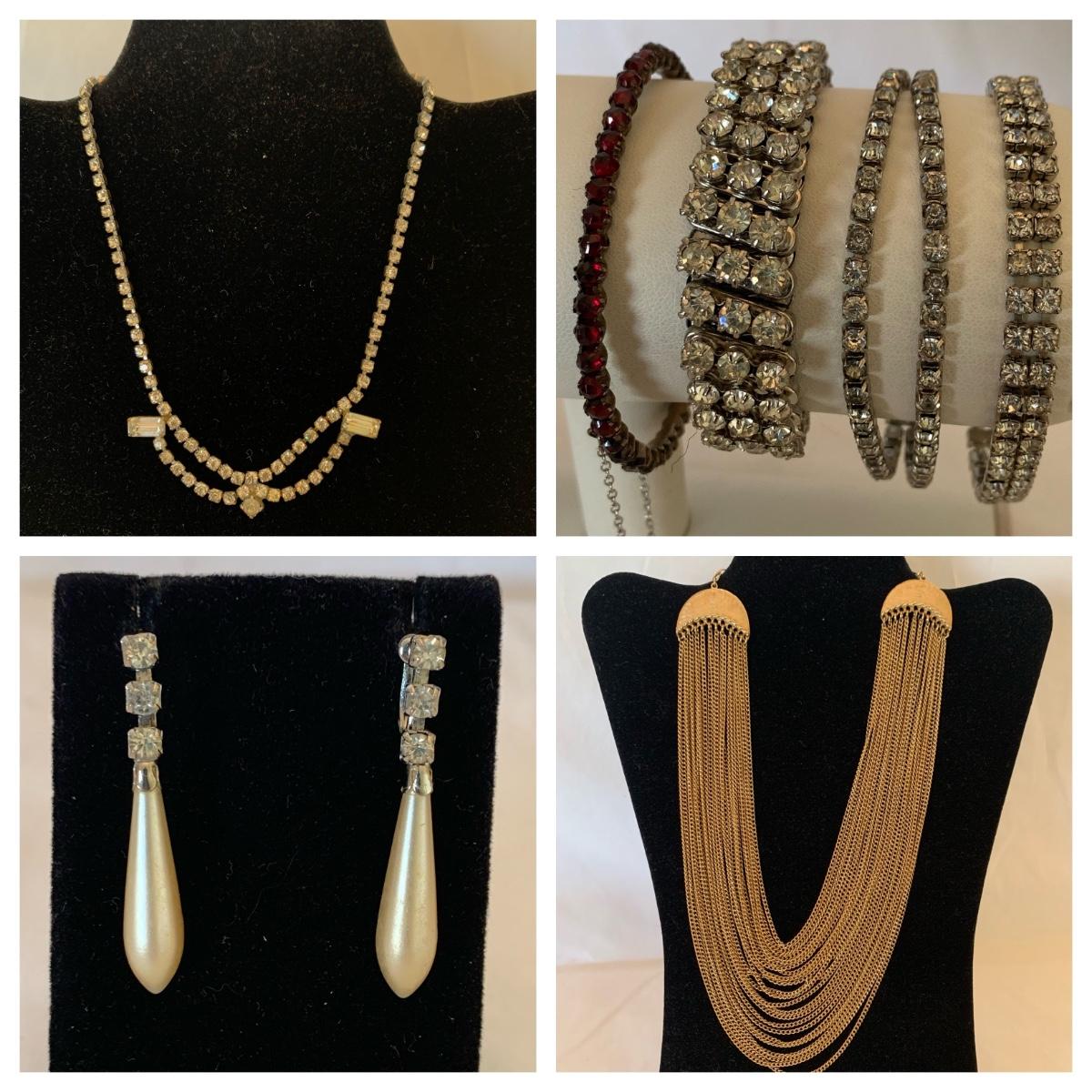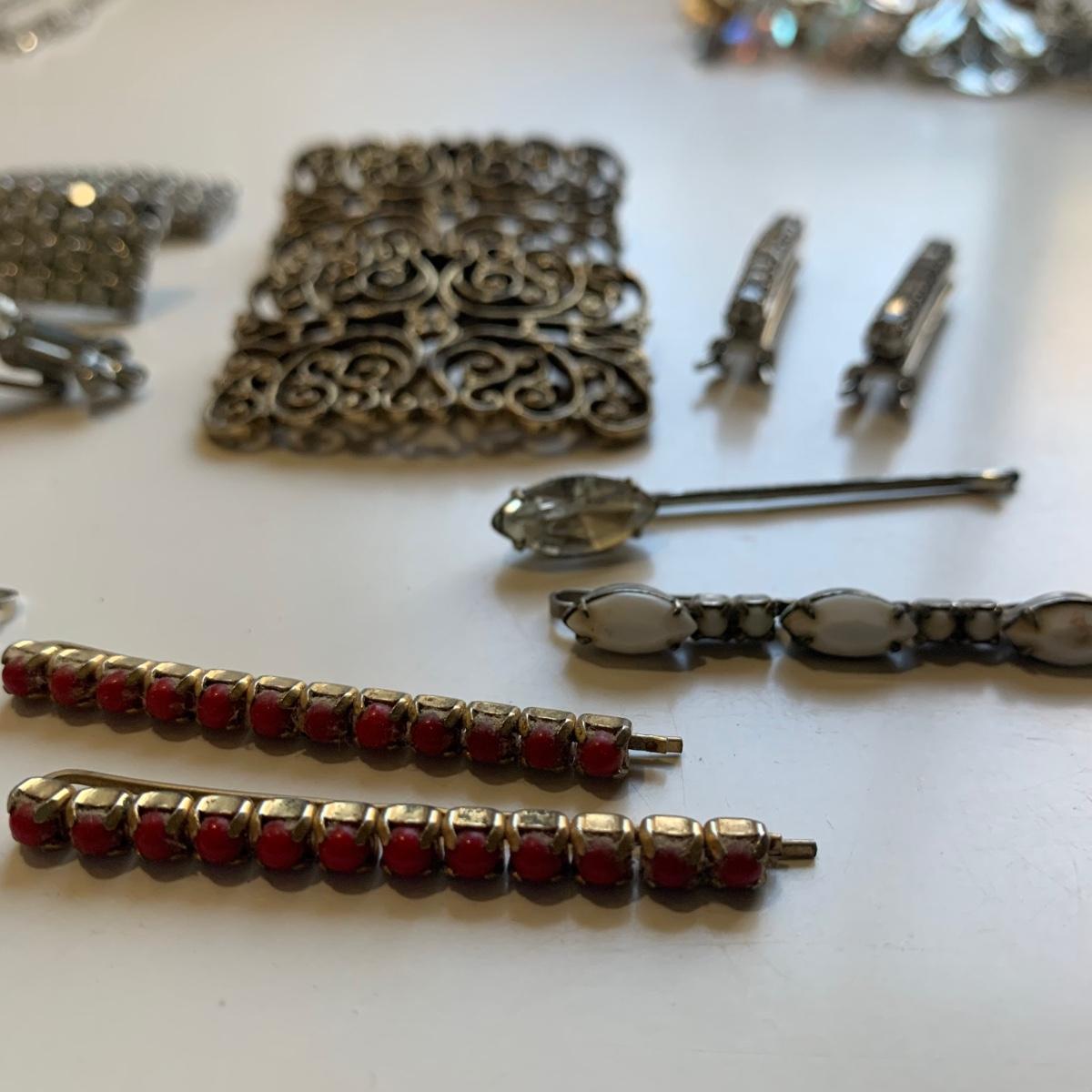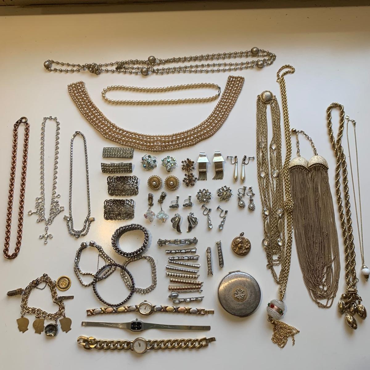 A collection of vintage style jewelry featuring gold and silver metals, Pearl-like beads, sparking stones, and more. There are 11 necklaces, five bracelets, three watches, a variety of hair clips, a locket, 10 pairs of clip/screw earrings, two matching pins, and a vintage Avon compact. The watches are: Jules Jurgensen, Timex, and Avon brands. None are currently ticking. They all have tiny gemstones on the watch face. The necklaces range in length from 14.5” to 60”. Please see photos for inventory. Any found markings are photographed.