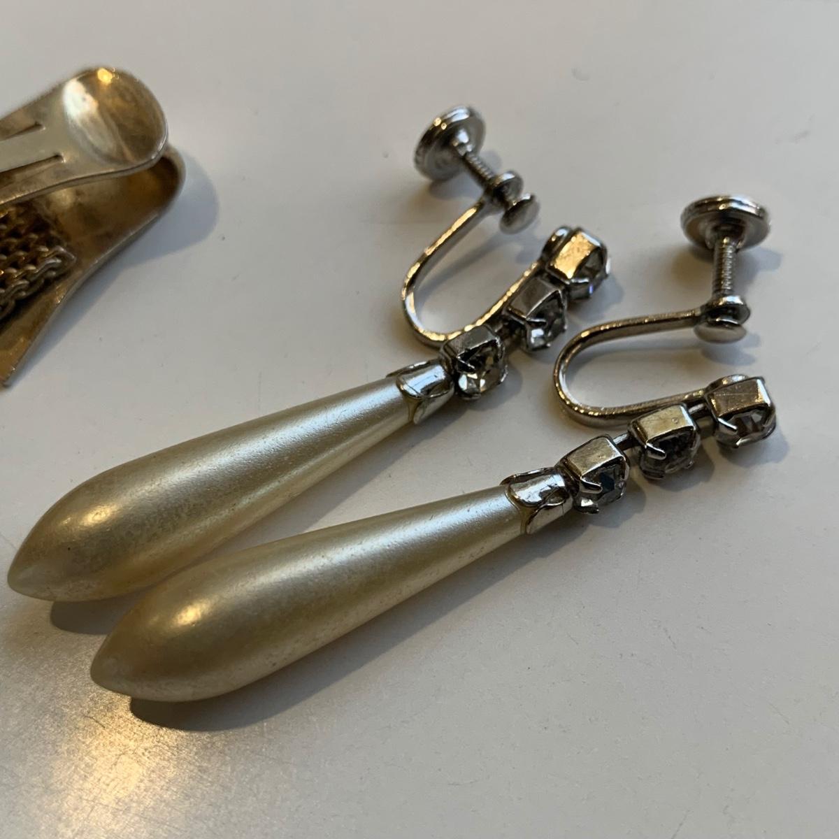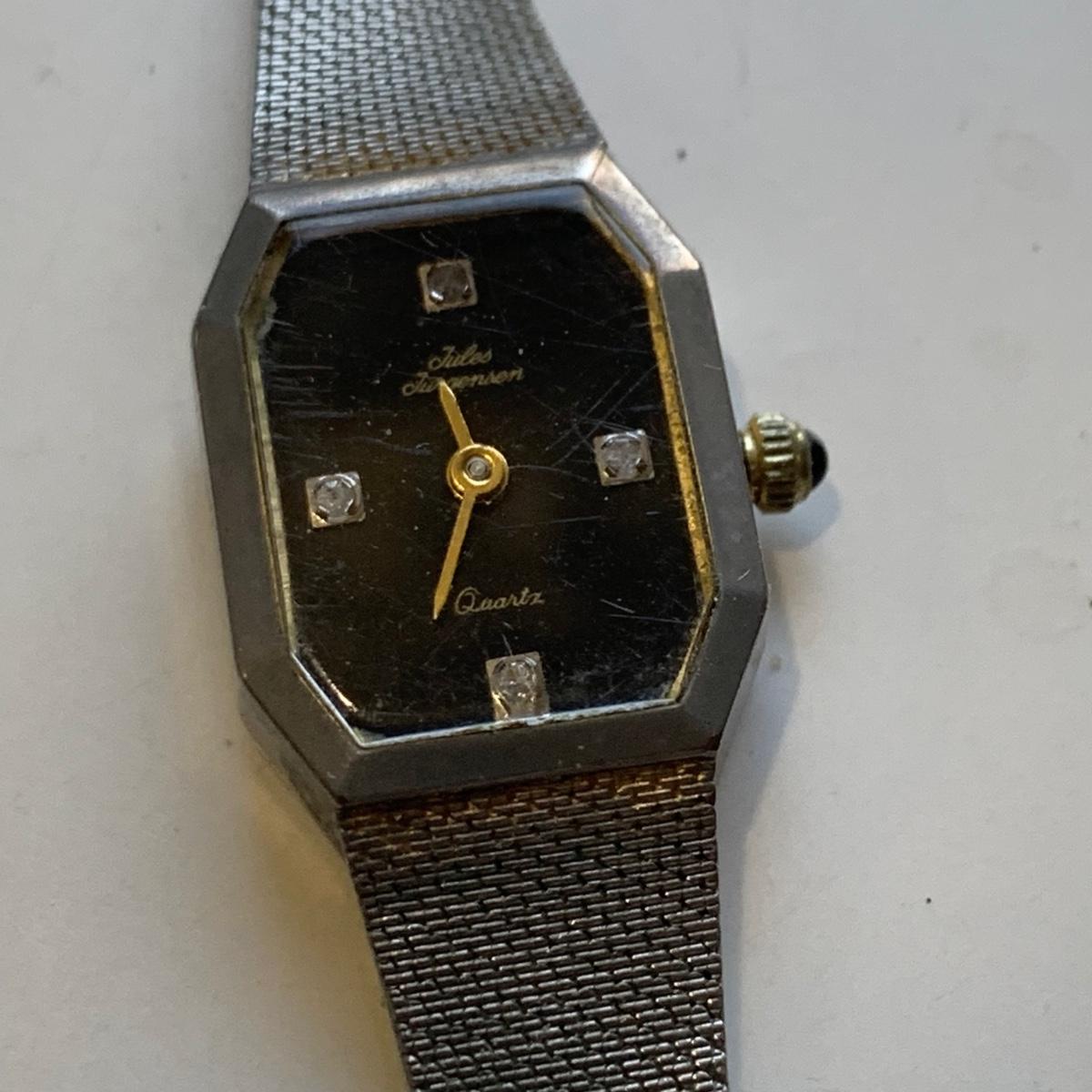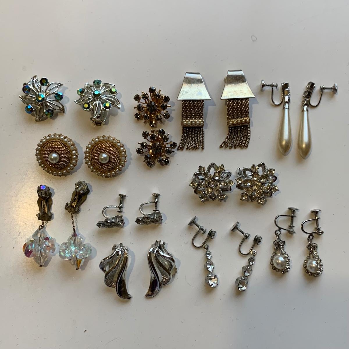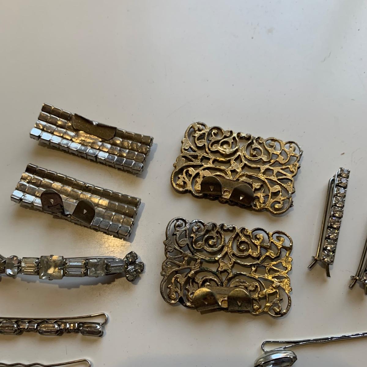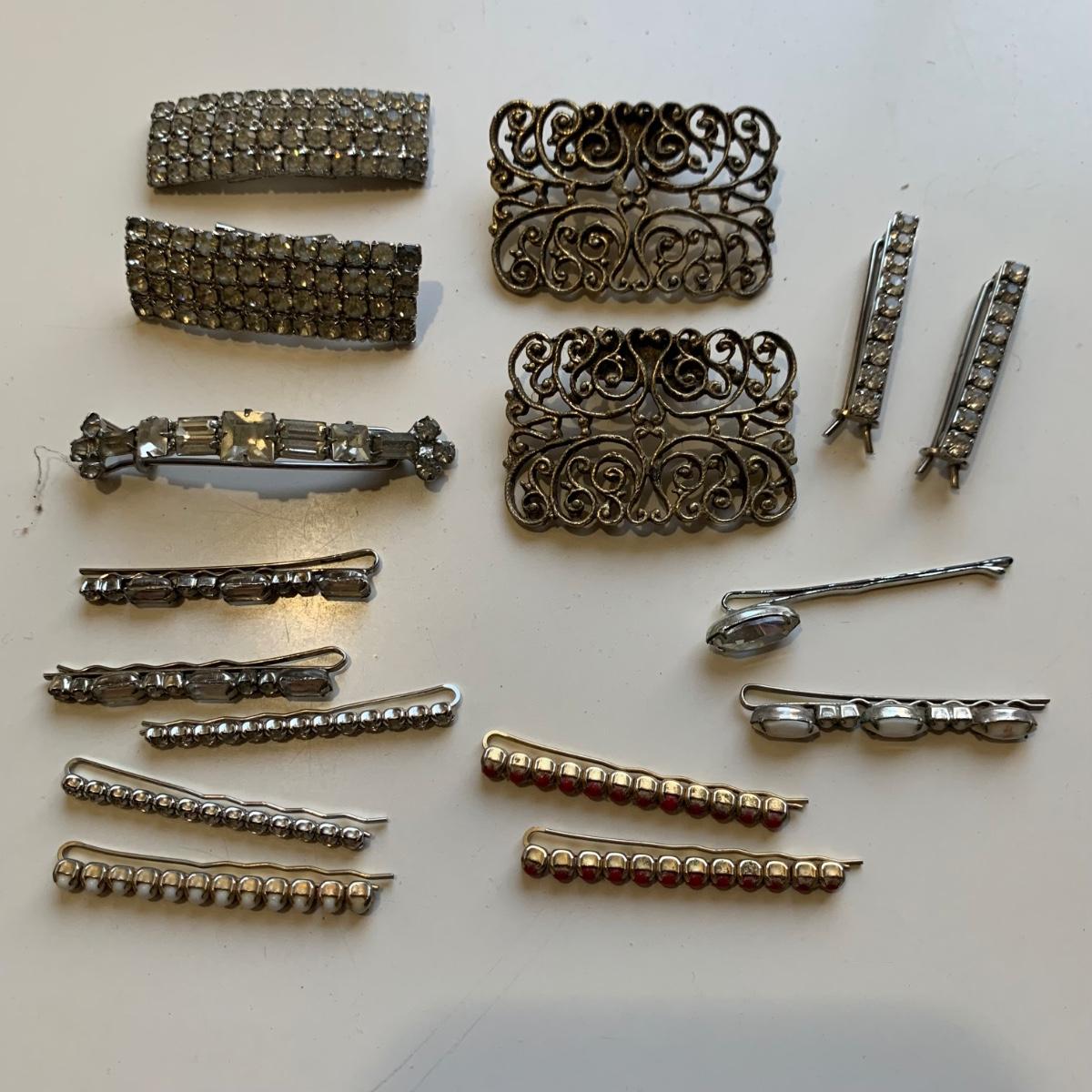 A collection of vintage style jewelry featuring gold and silver metals, Pearl-like beads, sparking stones, and more. There are 11 necklaces, five bracelets, three watches, a variety of hair clips, a locket, 10 pairs of clip/screw earrings, two matching pins, and a vintage Avon compact. The watches are: Jules Jurgensen, Timex, and Avon brands. None are currently ticking. They all have tiny gemstones on the watch face. The necklaces range in length from 14.5” to 60”. Please see photos for inventory. Any found markings are photographed.
