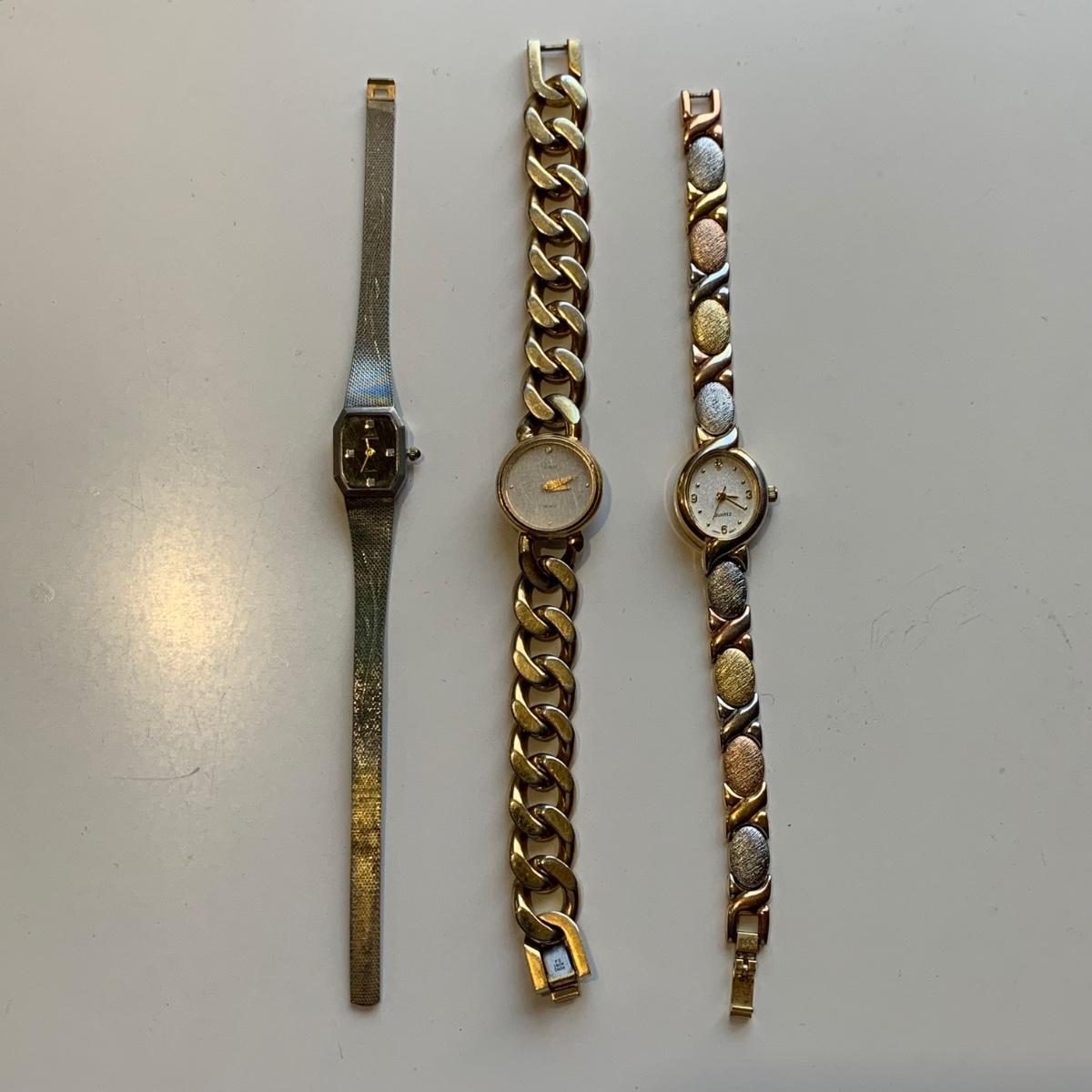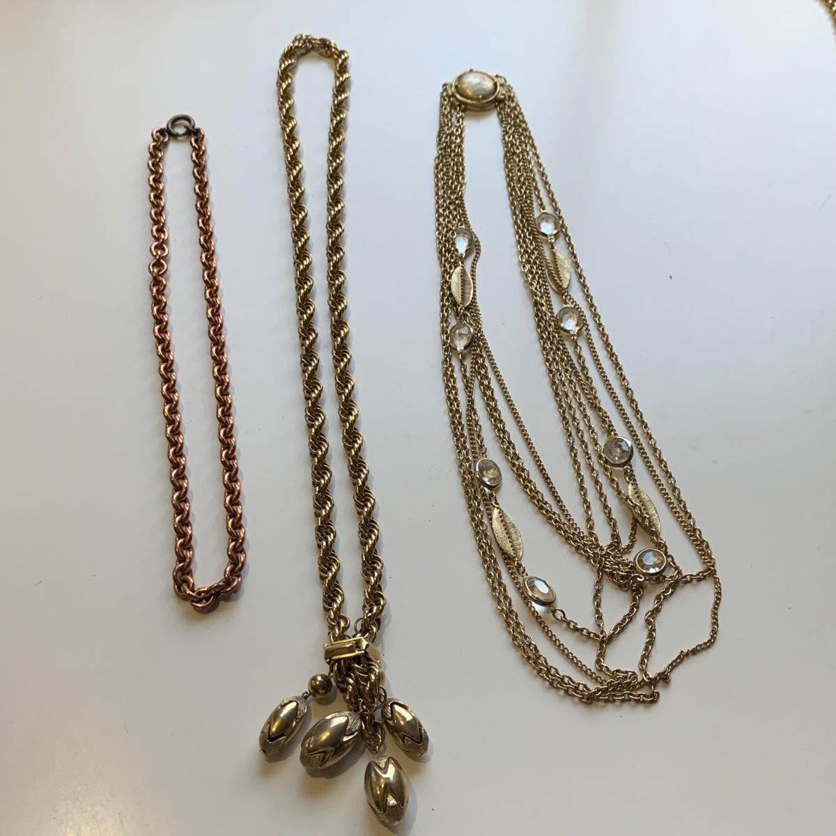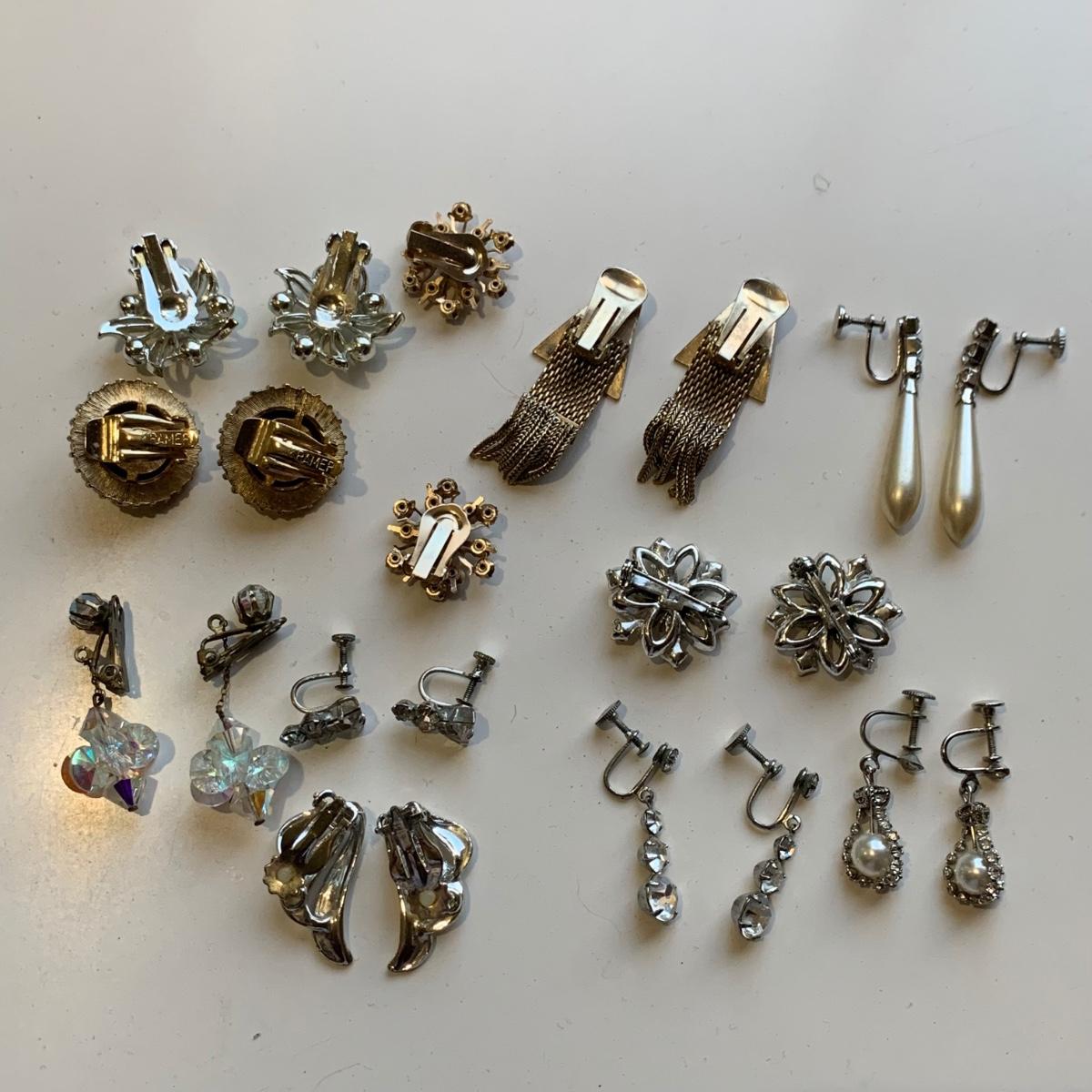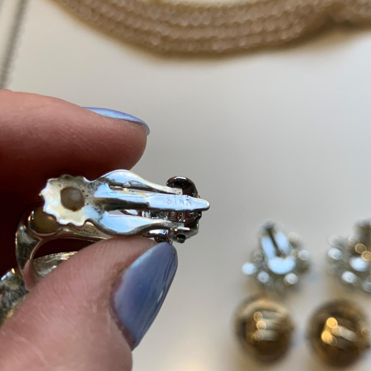 A collection of vintage style jewelry featuring gold and silver metals, Pearl-like beads, sparking stones, and more. There are 11 necklaces, five bracelets, three watches, a variety of hair clips, a locket, 10 pairs of clip/screw earrings, two matching pins, and a vintage Avon compact. The watches are: Jules Jurgensen, Timex, and Avon brands. None are currently ticking. They all have tiny gemstones on the watch face. The necklaces range in length from 14.5” to 60”. Please see photos for inventory. Any found markings are photographed.