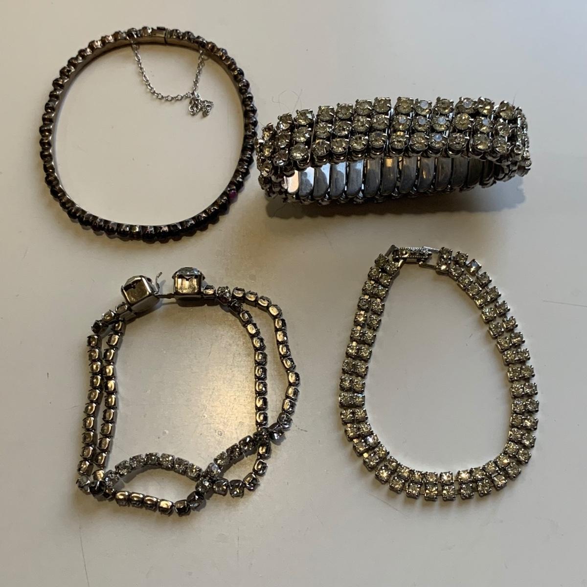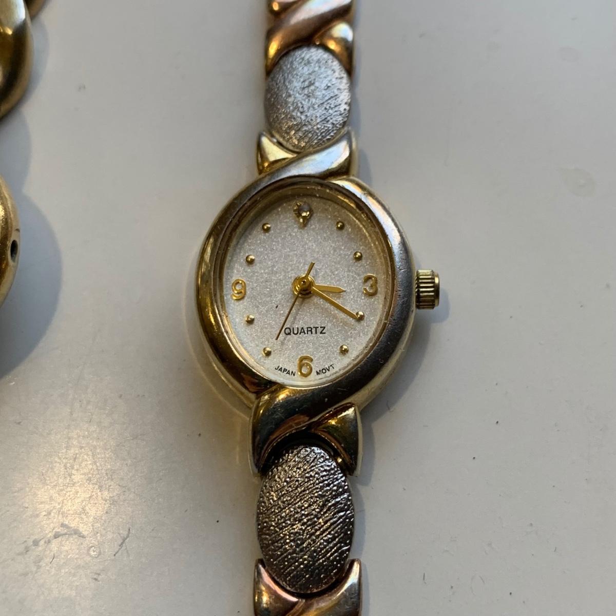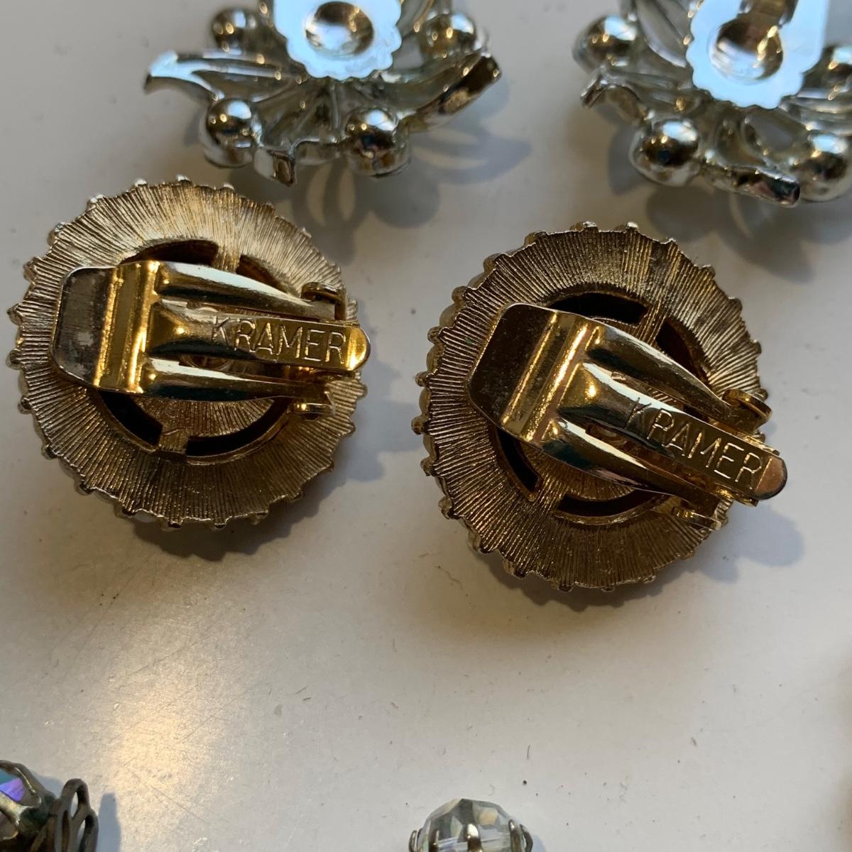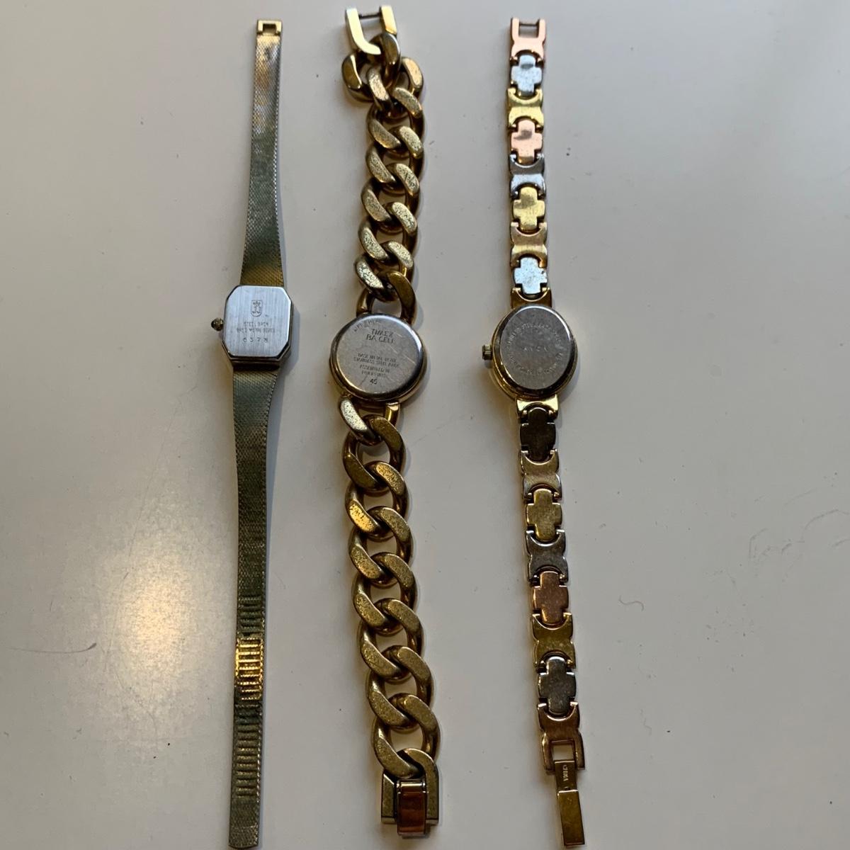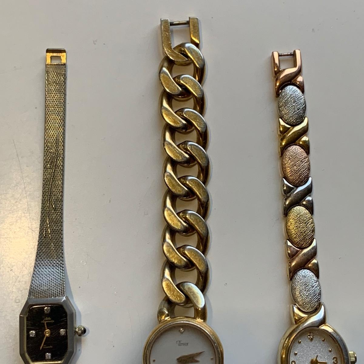 A collection of vintage style jewelry featuring gold and silver metals, Pearl-like beads, sparking stones, and more. There are 11 necklaces, five bracelets, three watches, a variety of hair clips, a locket, 10 pairs of clip/screw earrings, two matching pins, and a vintage Avon compact. The watches are: Jules Jurgensen, Timex, and Avon brands. None are currently ticking. They all have tiny gemstones on the watch face. The necklaces range in length from 14.5” to 60”. Please see photos for inventory. Any found markings are photographed.