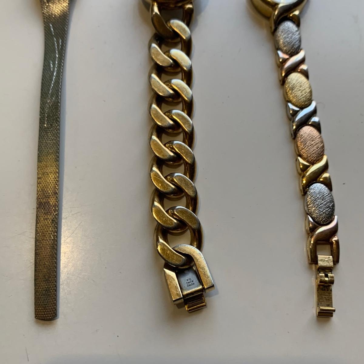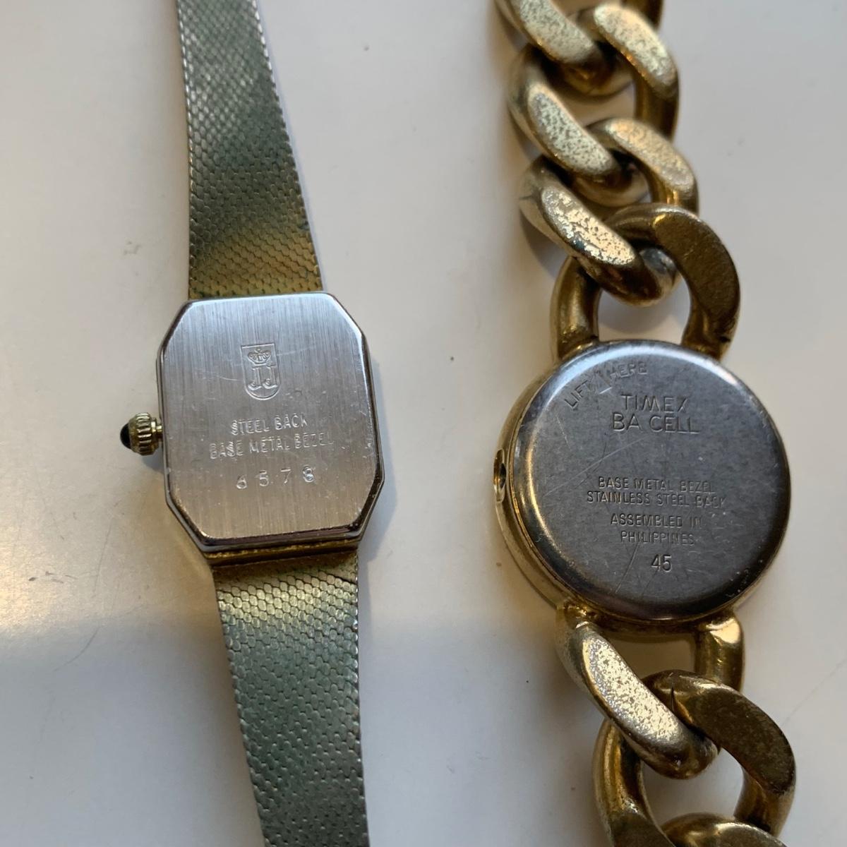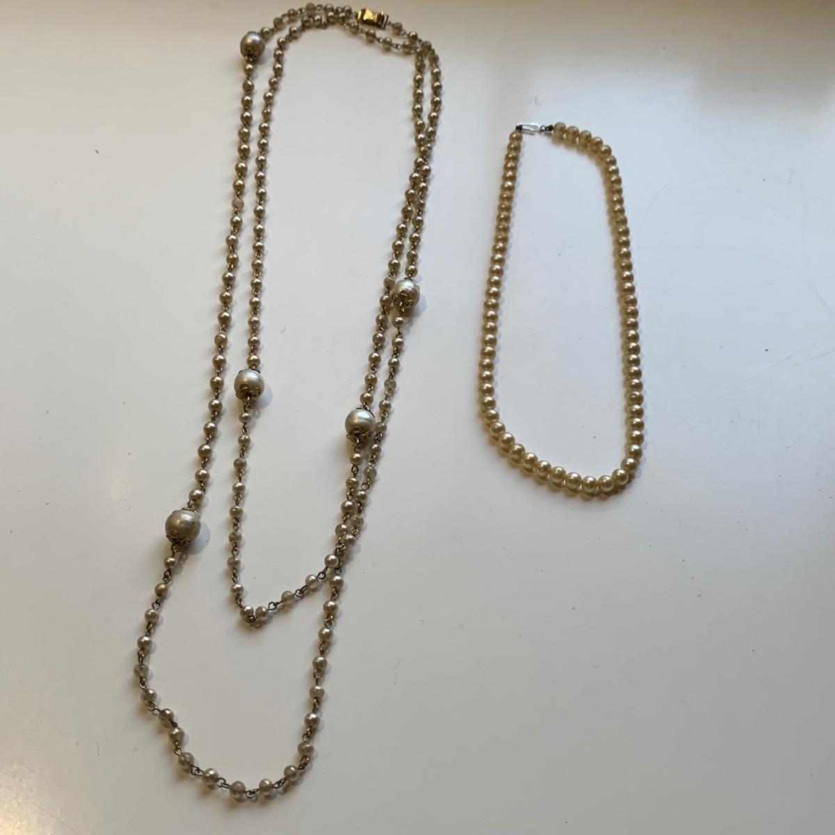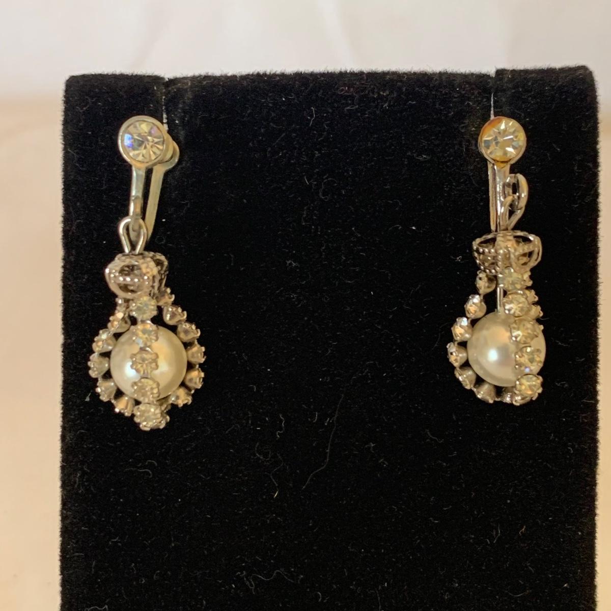 A collection of vintage style jewelry featuring gold and silver metals, Pearl-like beads, sparking stones, and more. There are 11 necklaces, five bracelets, three watches, a variety of hair clips, a locket, 10 pairs of clip/screw earrings, two matching pins, and a vintage Avon compact. The watches are: Jules Jurgensen, Timex, and Avon brands. None are currently ticking. They all have tiny gemstones on the watch face. The necklaces range in length from 14.5” to 60”. Please see photos for inventory. Any found markings are photographed.