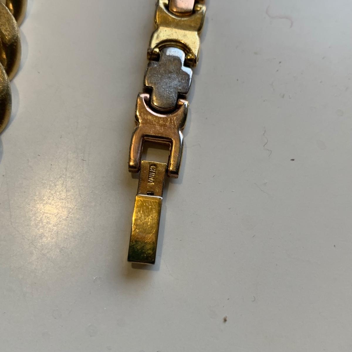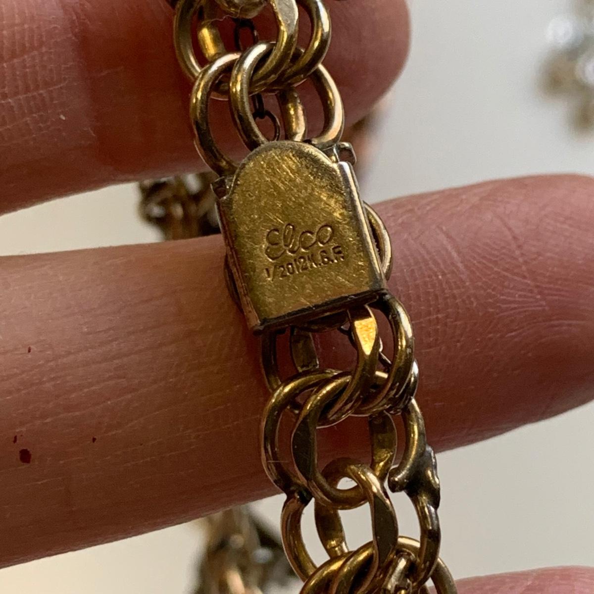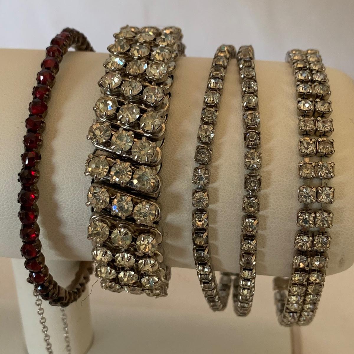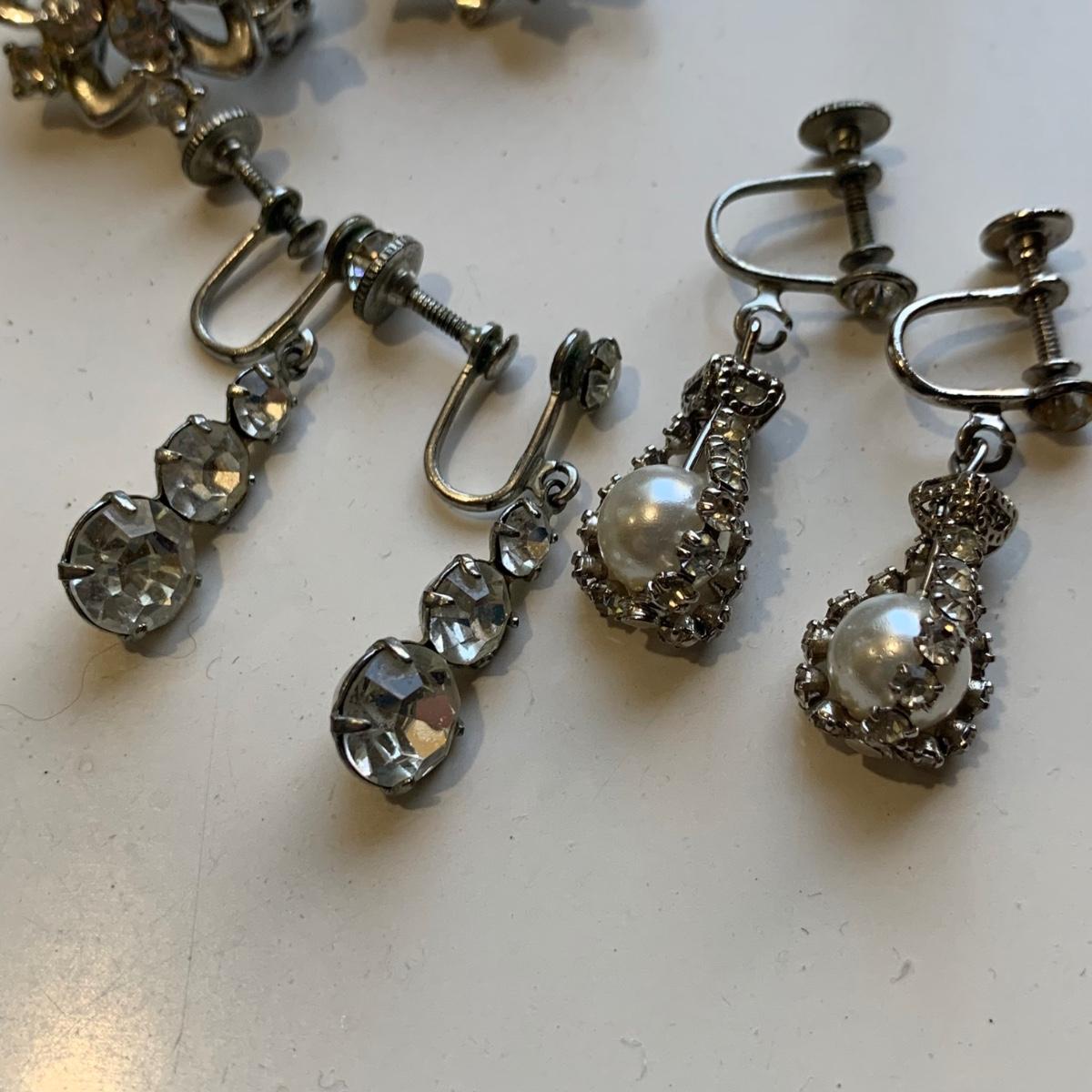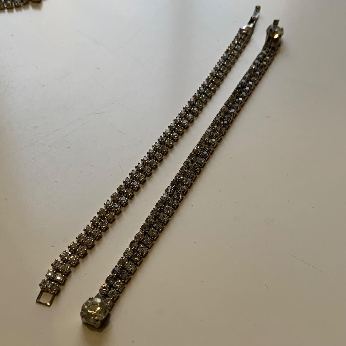 A collection of vintage style jewelry featuring gold and silver metals, Pearl-like beads, sparking stones, and more. There are 11 necklaces, five bracelets, three watches, a variety of hair clips, a locket, 10 pairs of clip/screw earrings, two matching pins, and a vintage Avon compact. The watches are: Jules Jurgensen, Timex, and Avon brands. None are currently ticking. They all have tiny gemstones on the watch face. The necklaces range in length from 14.5” to 60”. Please see photos for inventory. Any found markings are photographed.