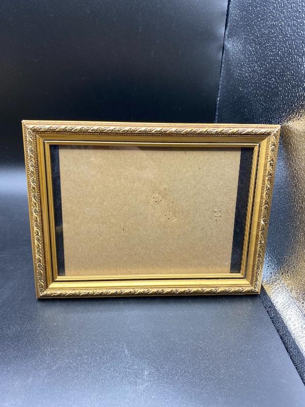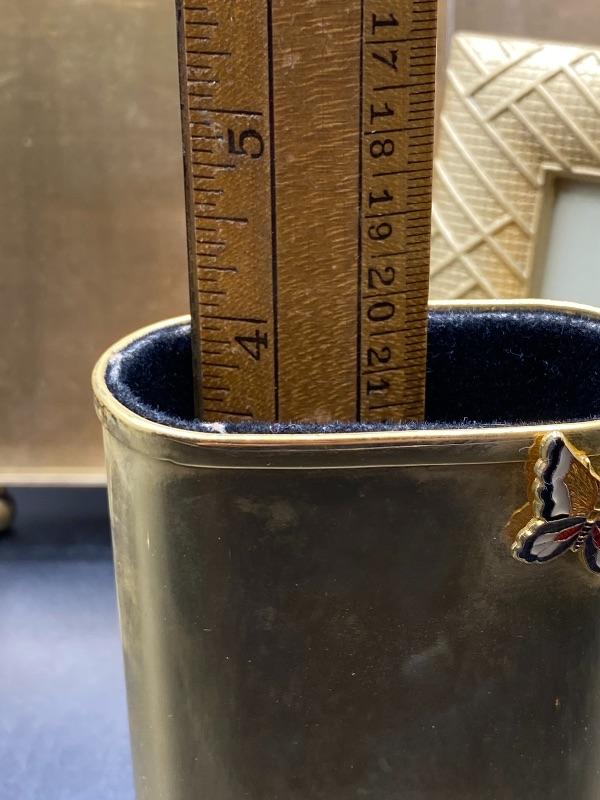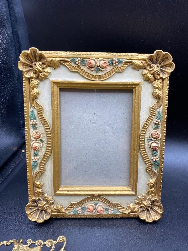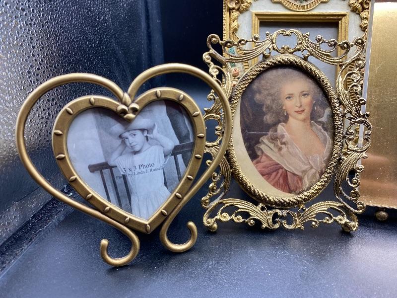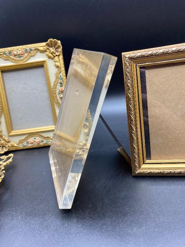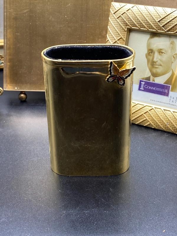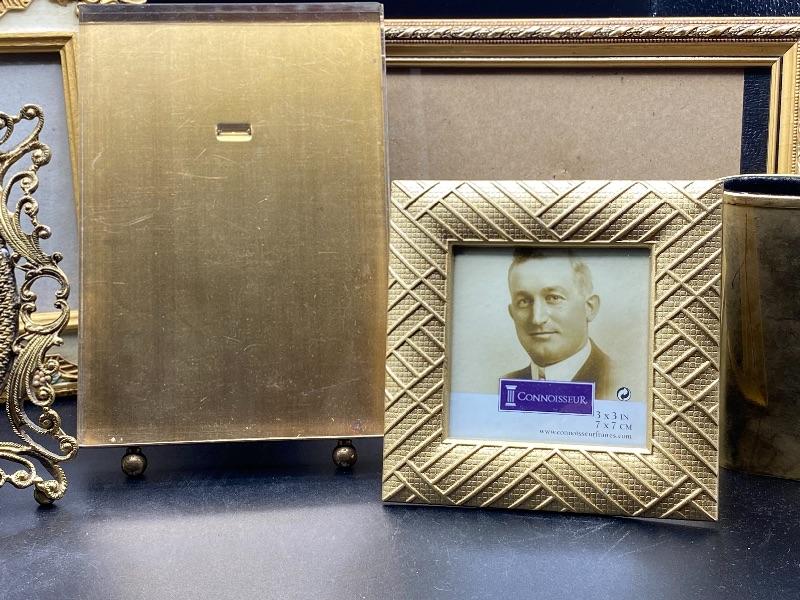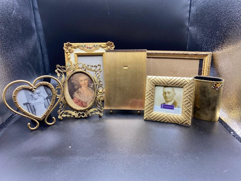 Gold picture frame lot with added gold pen holder. Frames are all different from each other. Pen holder has a butterfly near the top.