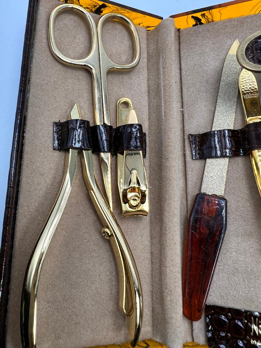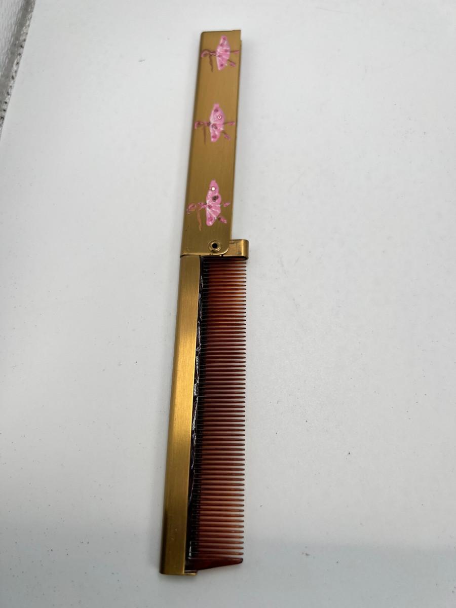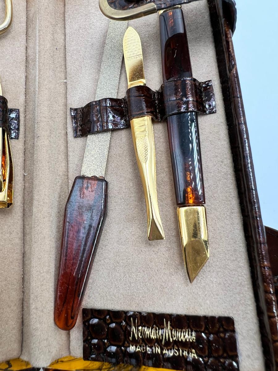 Gold Plated 5" Faux Crocodile leather Neiman Marcus Vintage new vanity set and Vintage ballerina folding comb