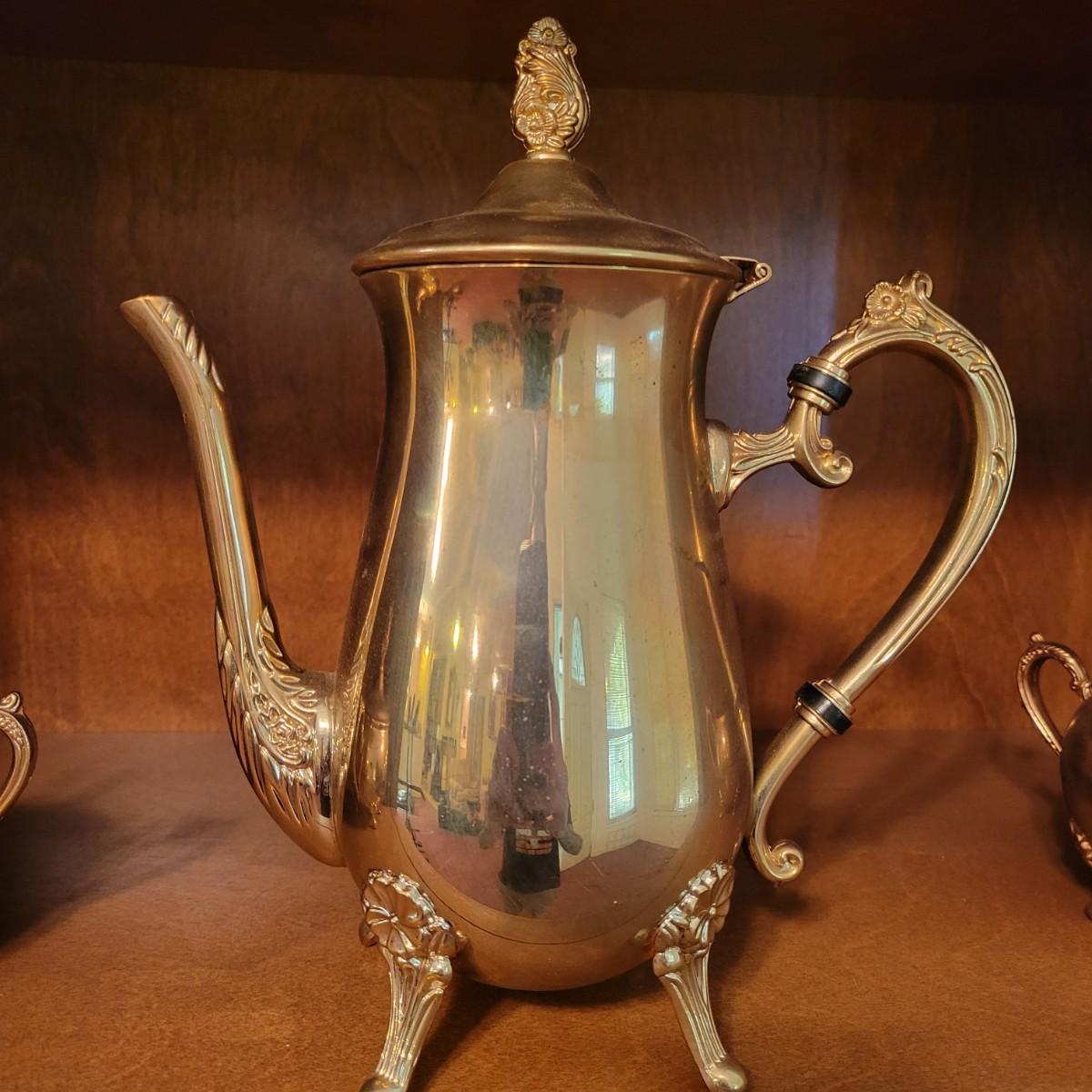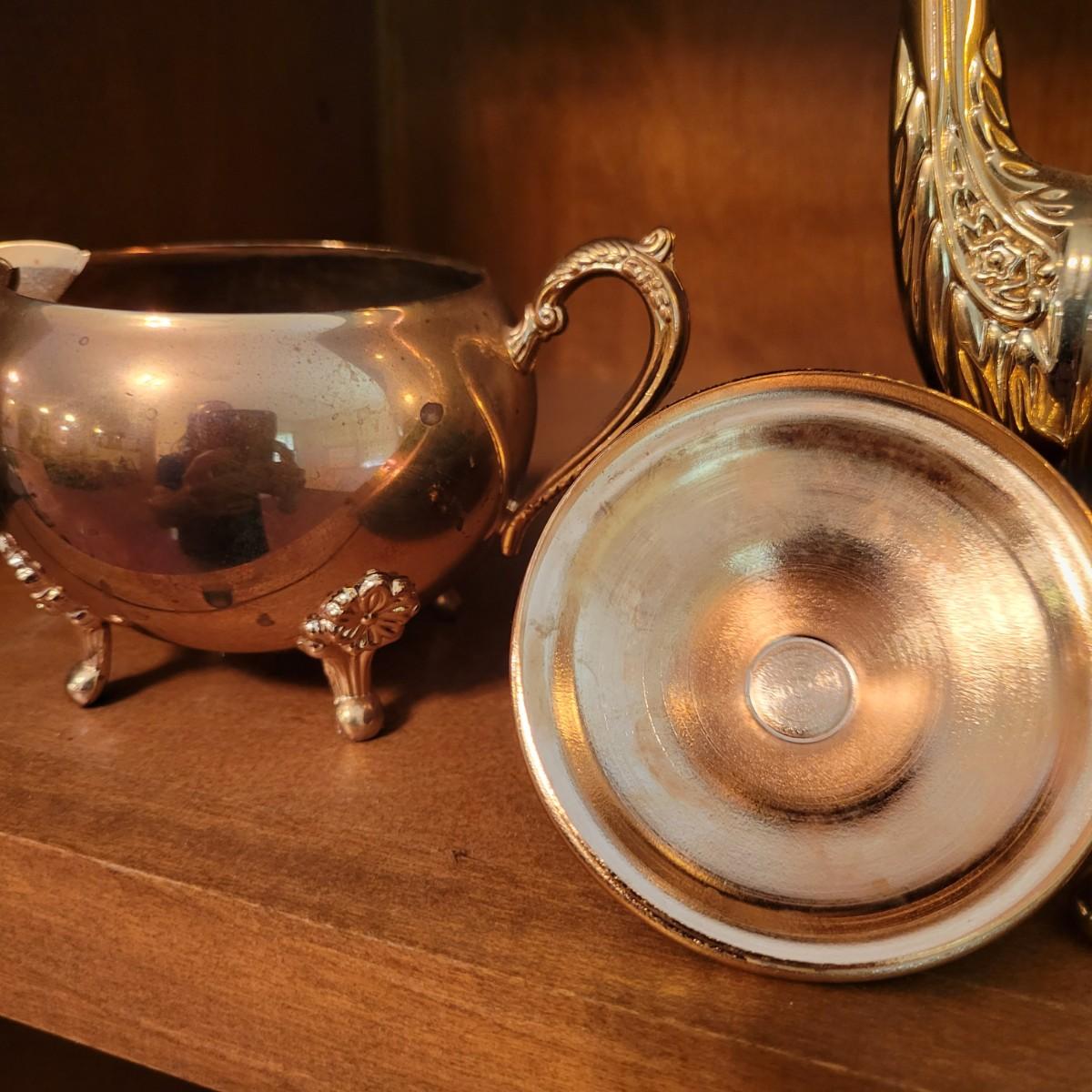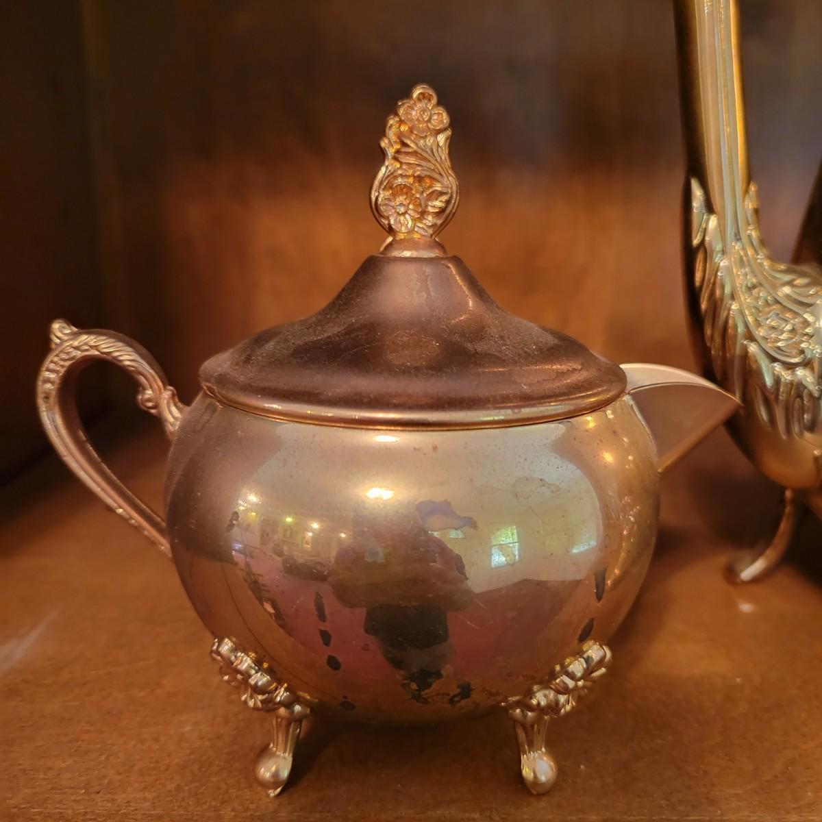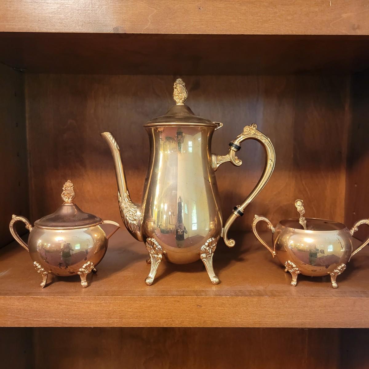 A three piece gold plated tea set in good condition, but there are some spots of tarnish on all pieces. Included is a tea pot, a creamer dish and a sugar dish. Teapot measures approximately 8.5" x 4" x 10". Shipping available