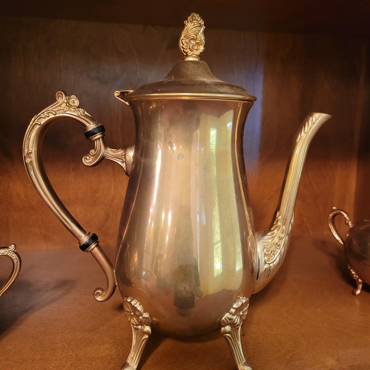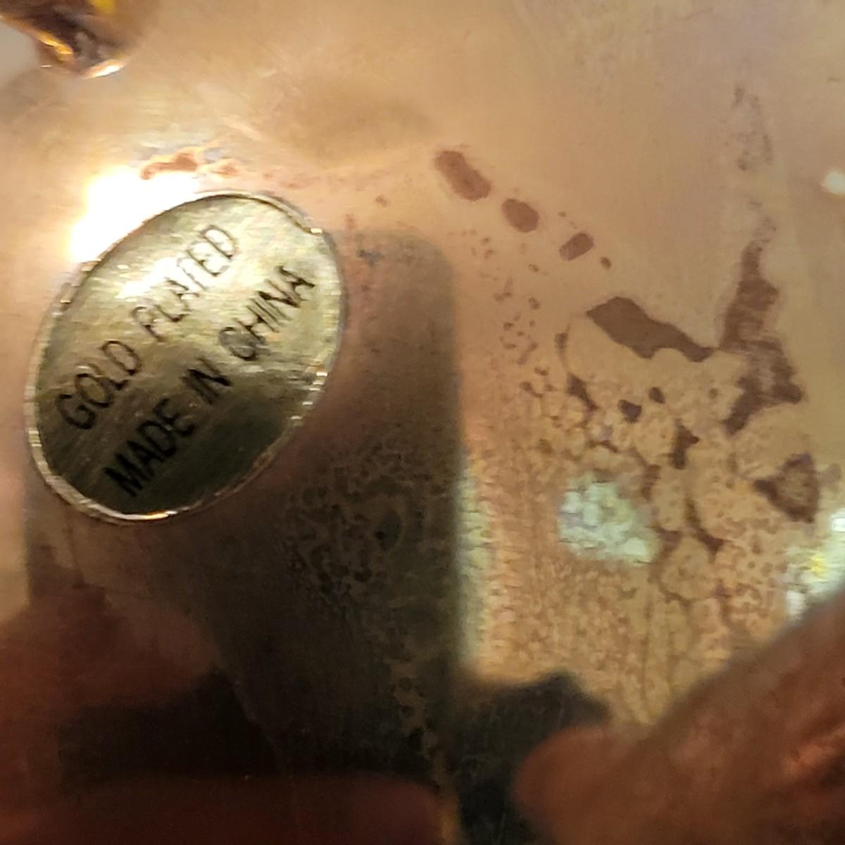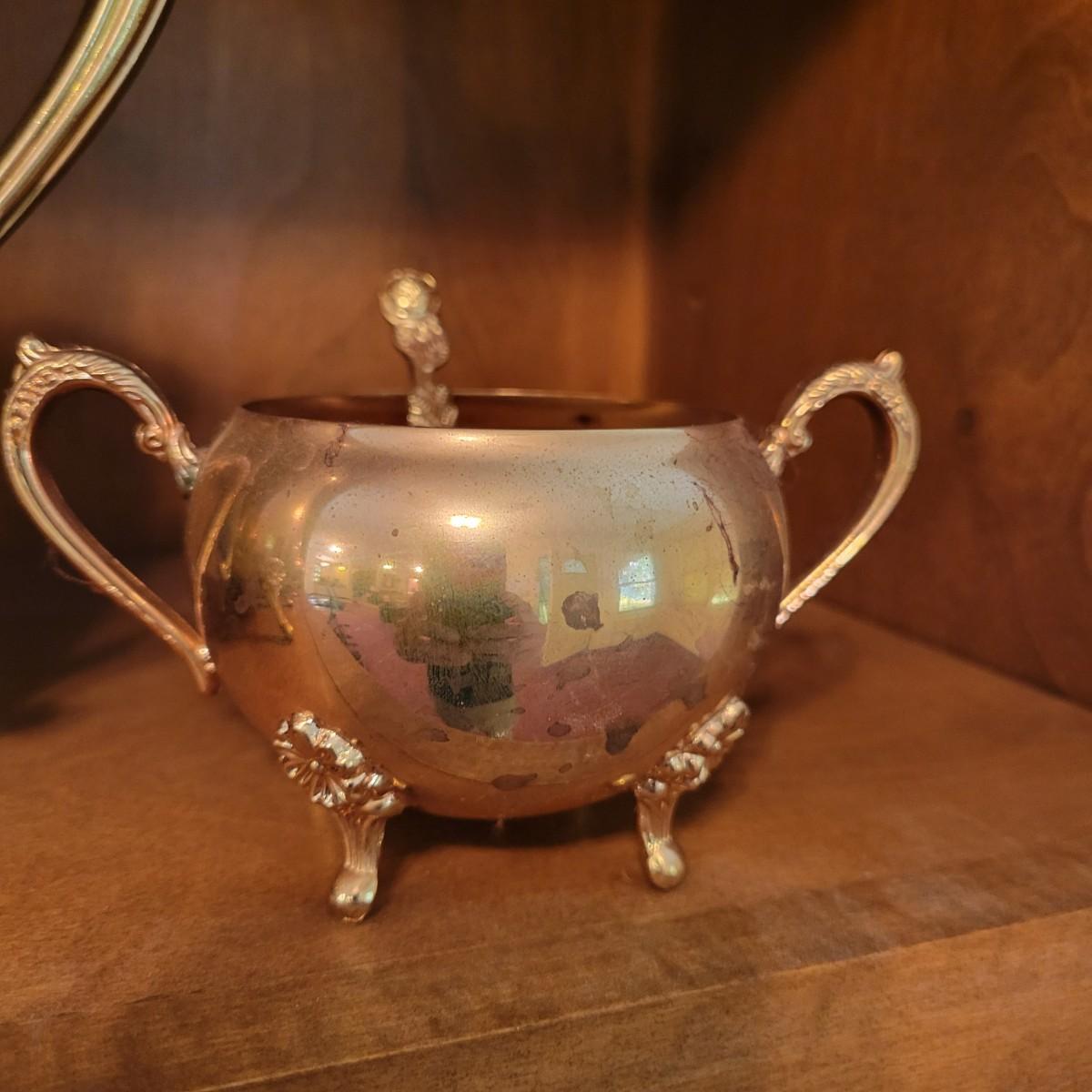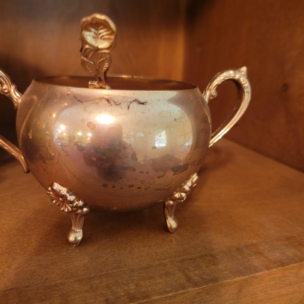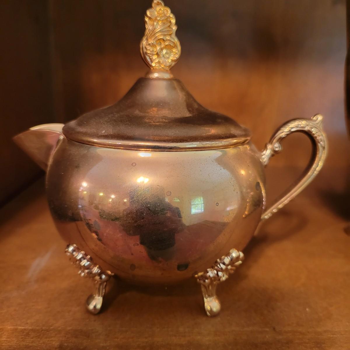 A three piece gold plated tea set in good condition, but there are some spots of tarnish on all pieces. Included is a tea pot, a creamer dish and a sugar dish. Teapot measures approximately 8.5" x 4" x 10". Shipping available