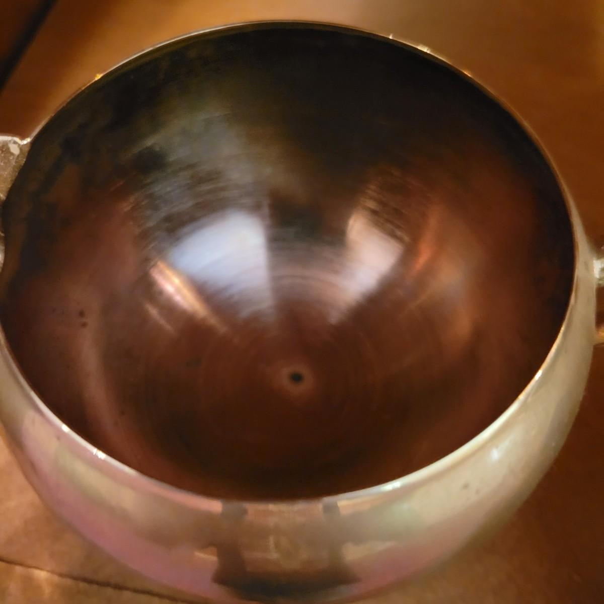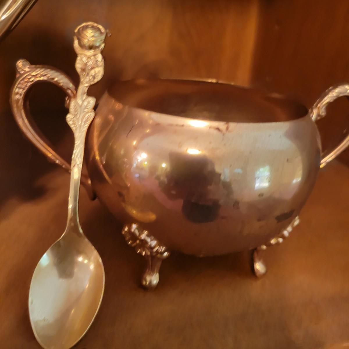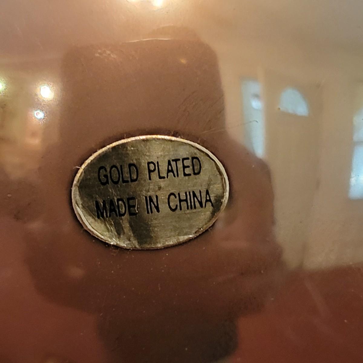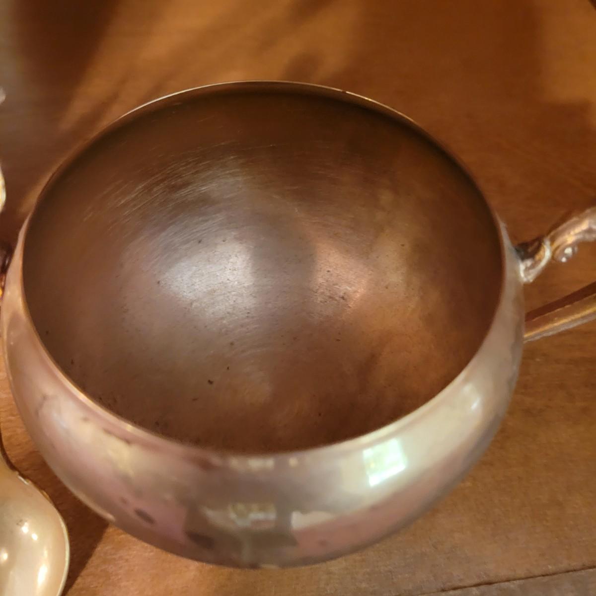 A three piece gold plated tea set in good condition, but there are some spots of tarnish on all pieces. Included is a tea pot, a creamer dish and a sugar dish. Teapot measures approximately 8.5" x 4" x 10". Shipping available
