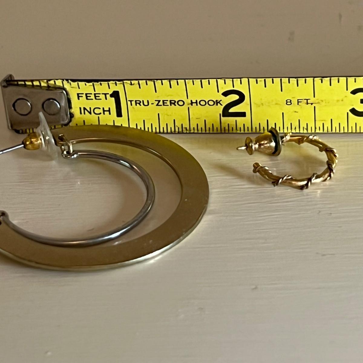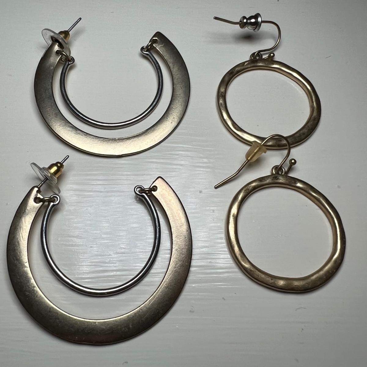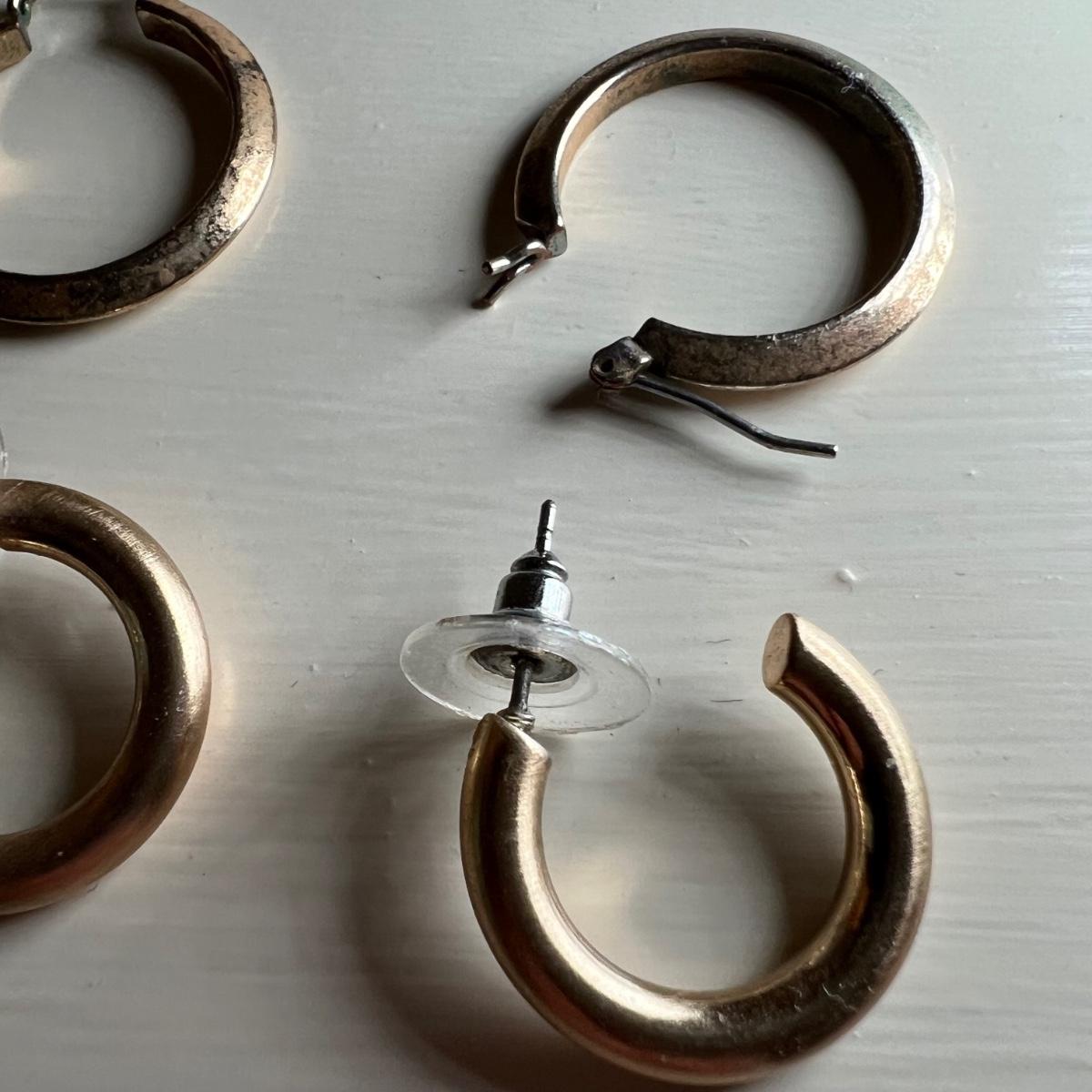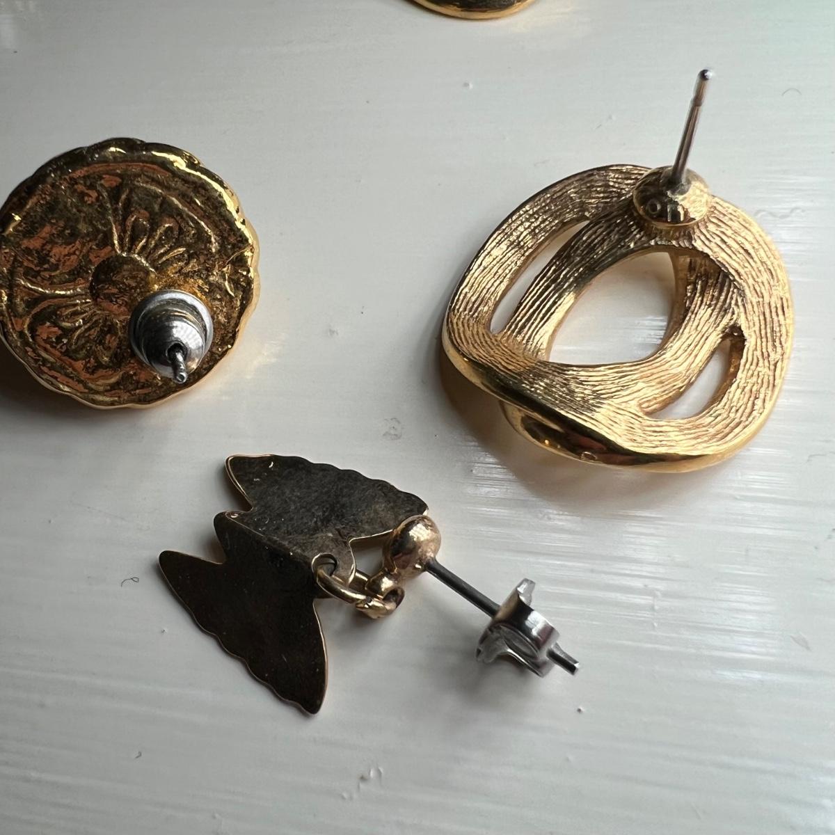 Fifteen plus pairs of earrings in this assortment of gold colored metal earrings. Three pairs are clip-on, all the rest are for pierced ears.