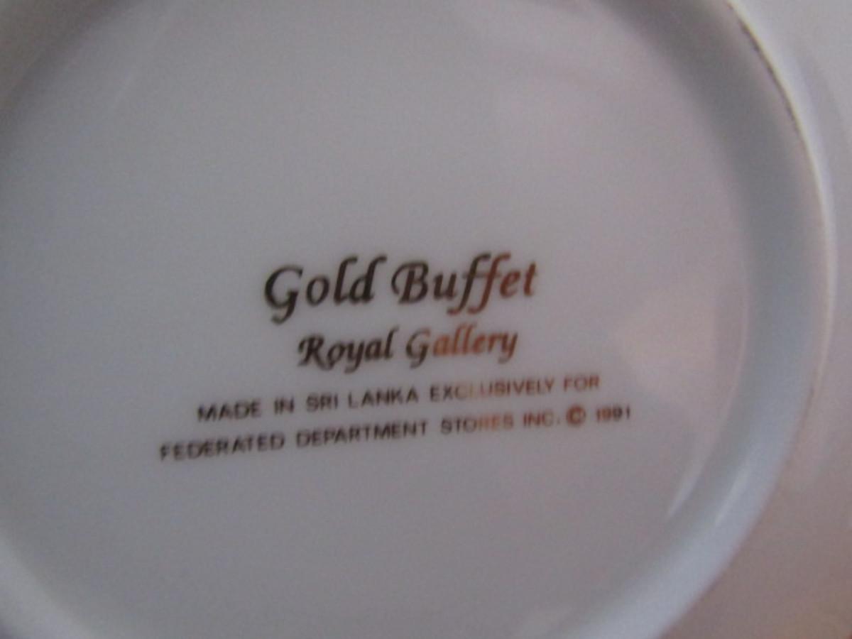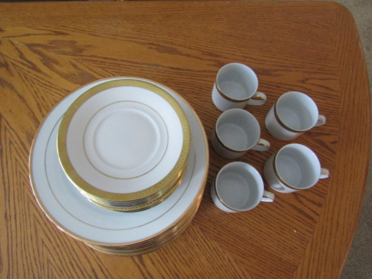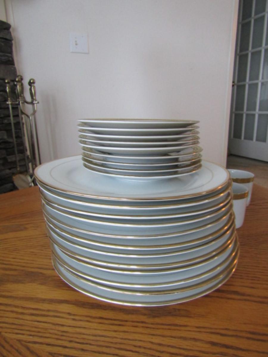 Gold Rimmed China: Dinner Plates (10 inch)- 12 pieces, Bread Plates (6 1/2")- 9 pieces, Cups- 5 pieces