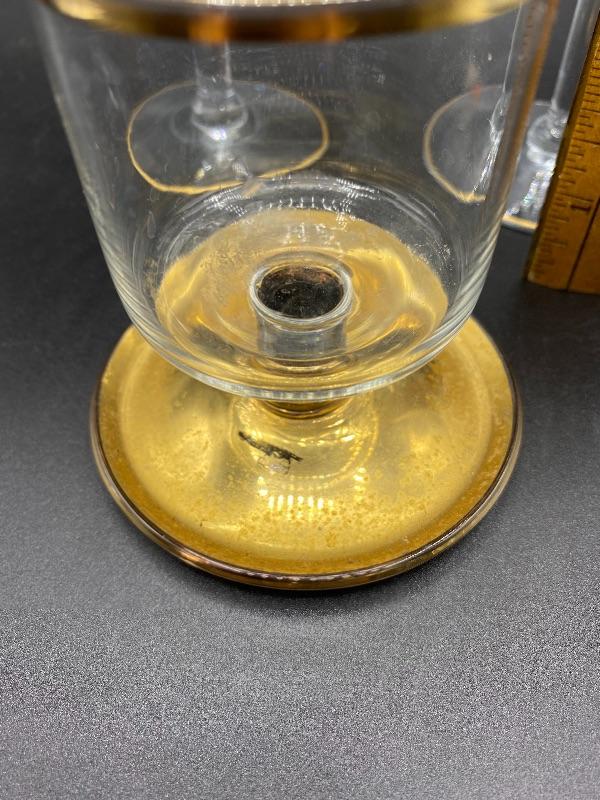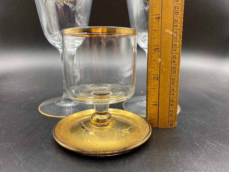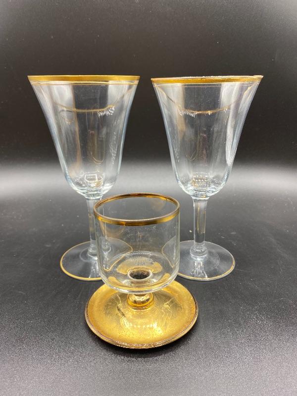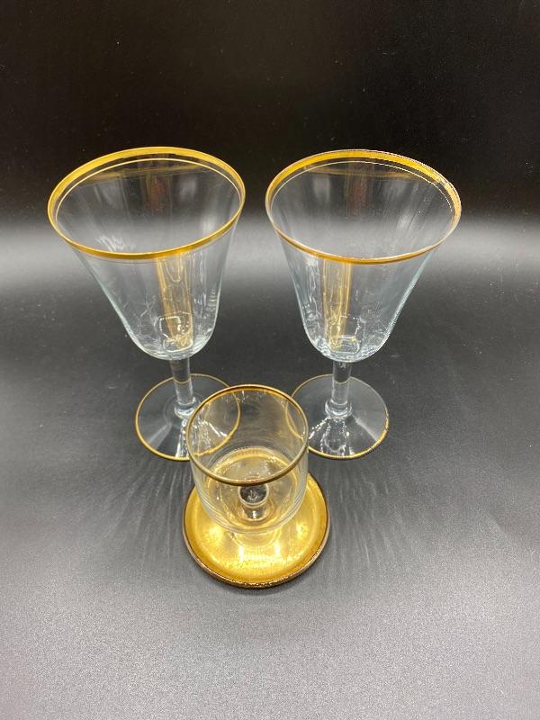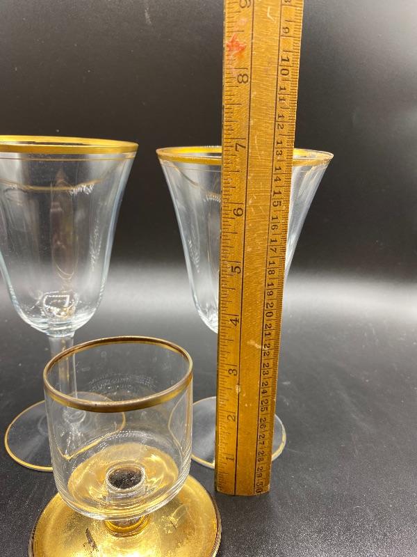 3 gold rimmed pieces of glassware. Two wine 7" wine goblets and a 3.5" cordial glass. Light wear and scratches to gold. Very wide bottom on the cordial glass.