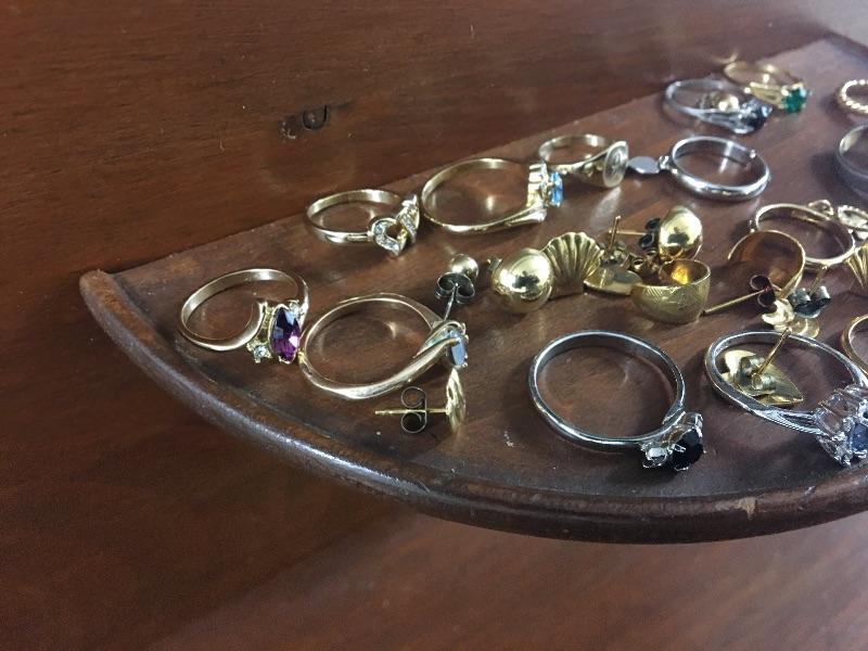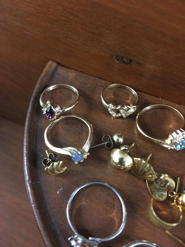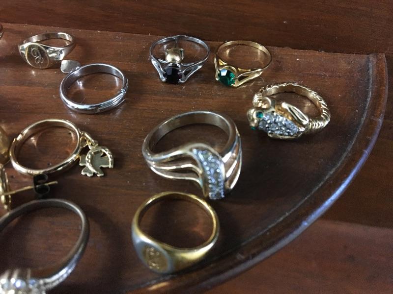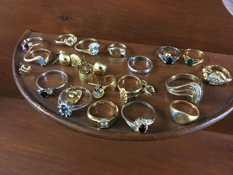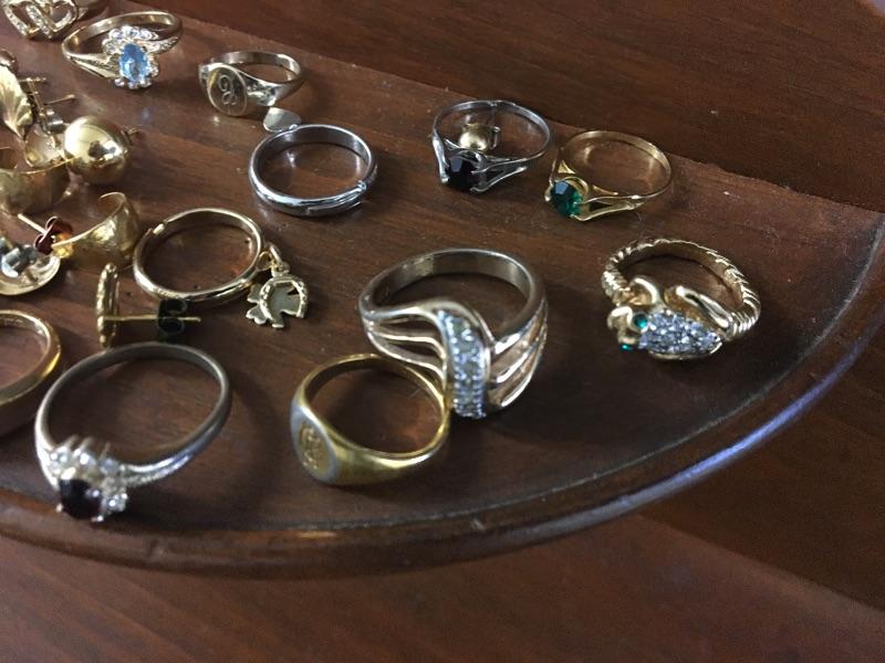 Looks like over 15 rings and several pairs of earrings in this lot. I believe they are gold plated but have not had them tested. Most are unmarked or you cannot read the markings.
