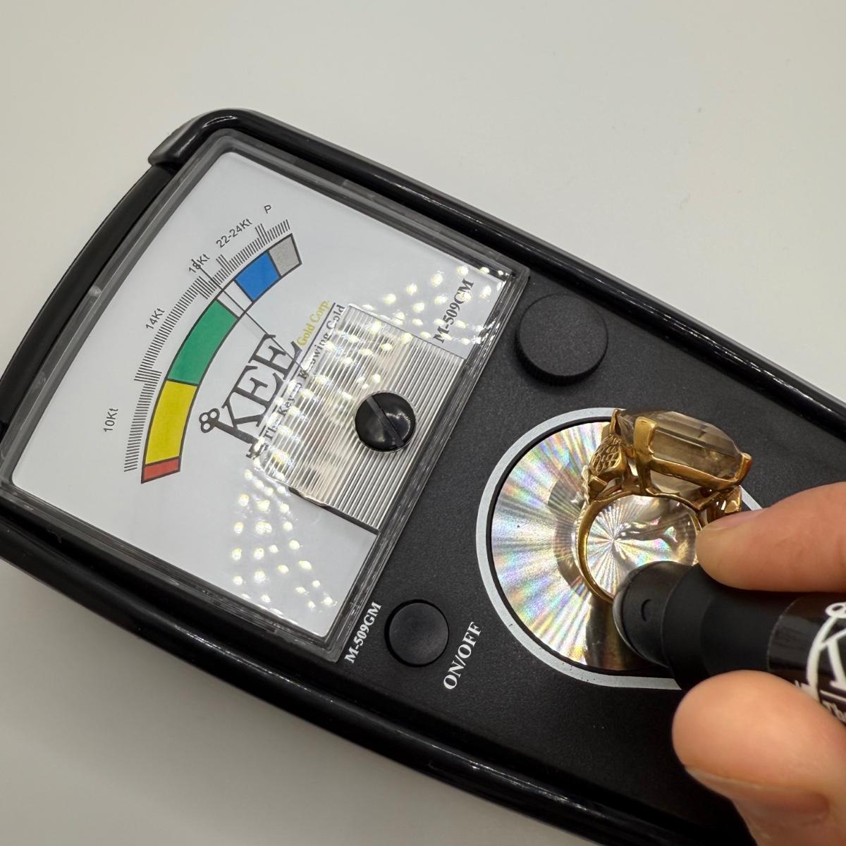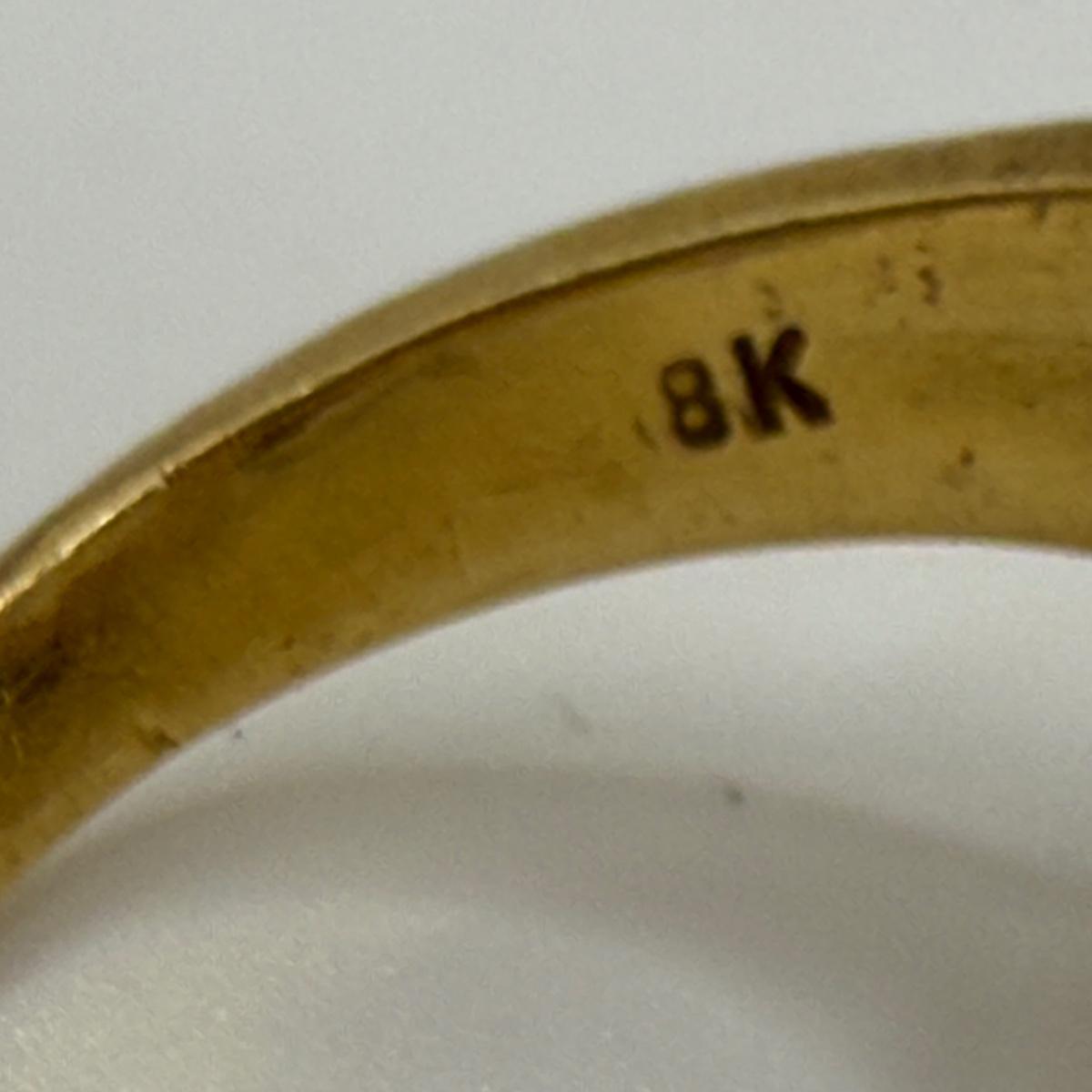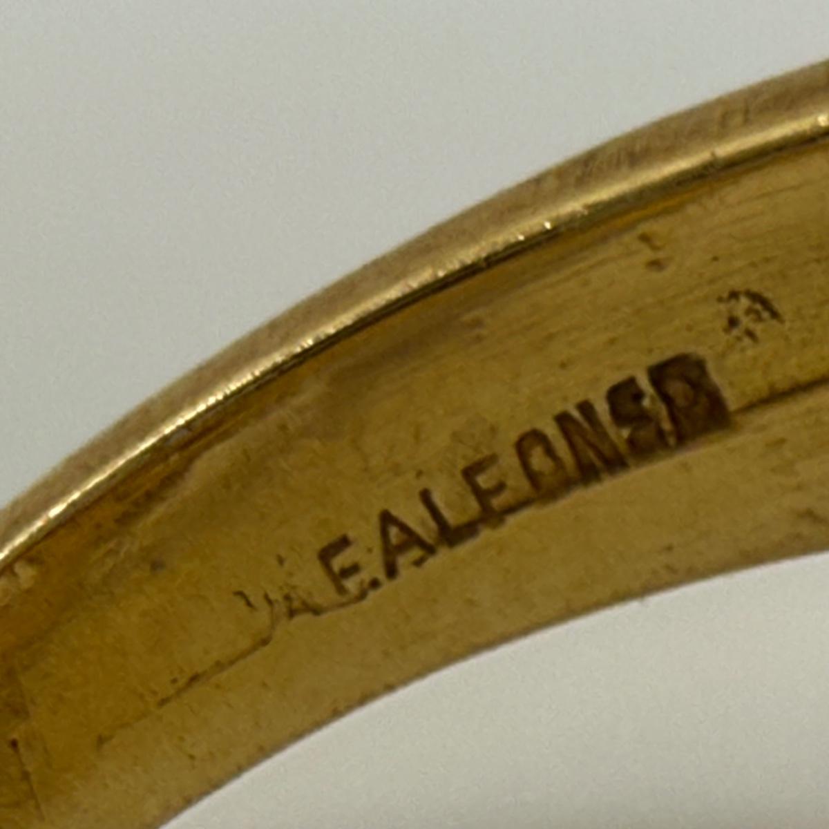 This ring features a large gemstone that is the color of a citrine gemstone (stone type not verified). The gemstone is set in a gold band. It is slightly loose in its setting. Inside of the band is stamped “E. Alfonso” and “8K” is legible, though the band registered as 18K on our gold tester. The ring appears to be size 8.