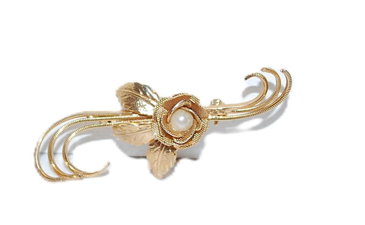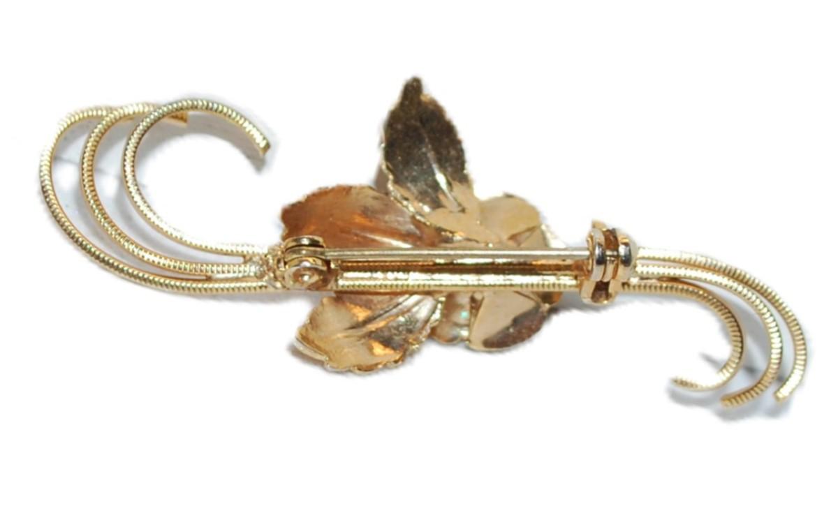 "GOLD ROSE & LEAVES" BROOCH (2¼" x ¾") with Swirled Rope Accents on a Gold Tone Setting