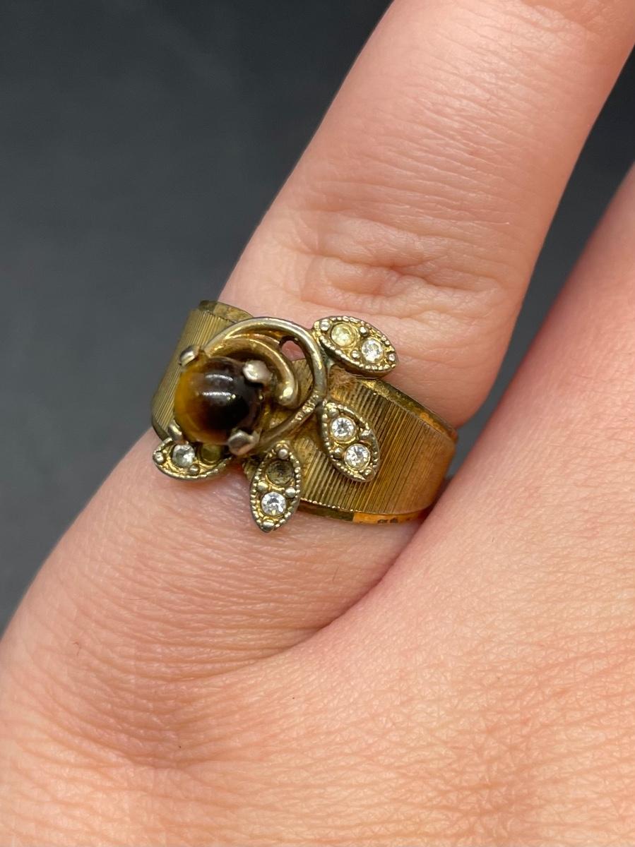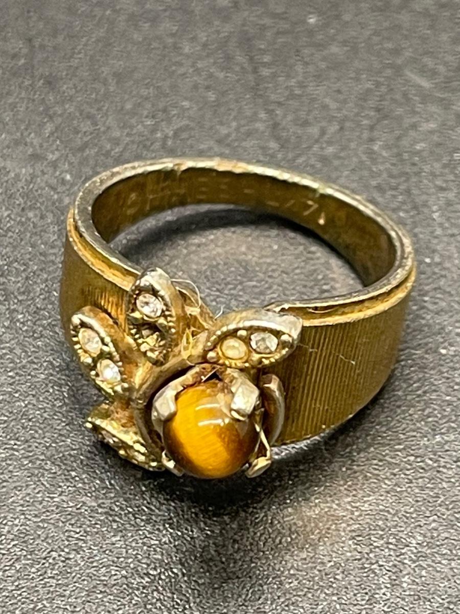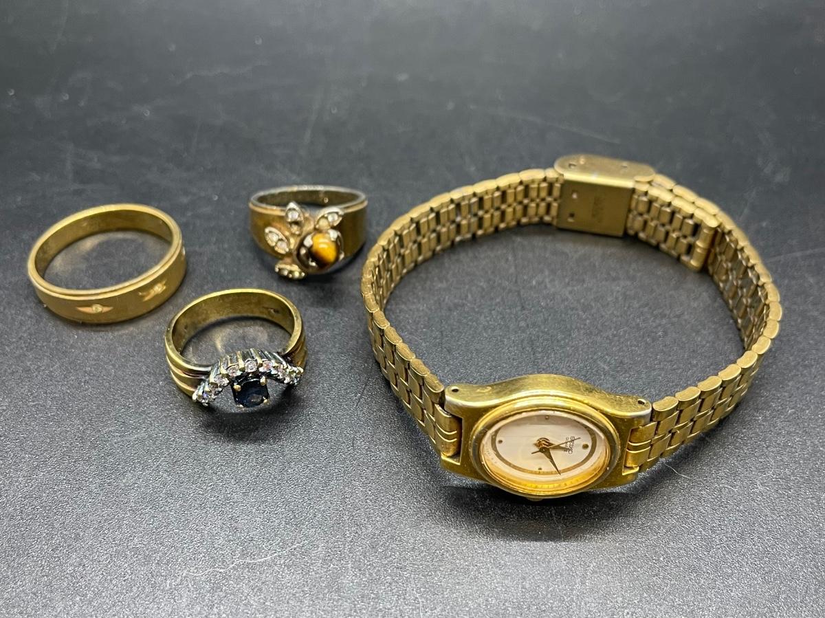 All items are in good condition. The watch doesn’t work but it is easy to get repaired. The back of the watch is stainless steel. The rings come in different sizes. The first ring pictures is most likely a size 6/7, the second ring pictured is probably a size ten, and the last ring pictured would most likely be a size 4/5.