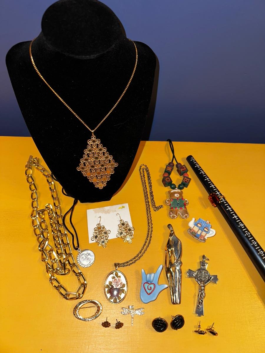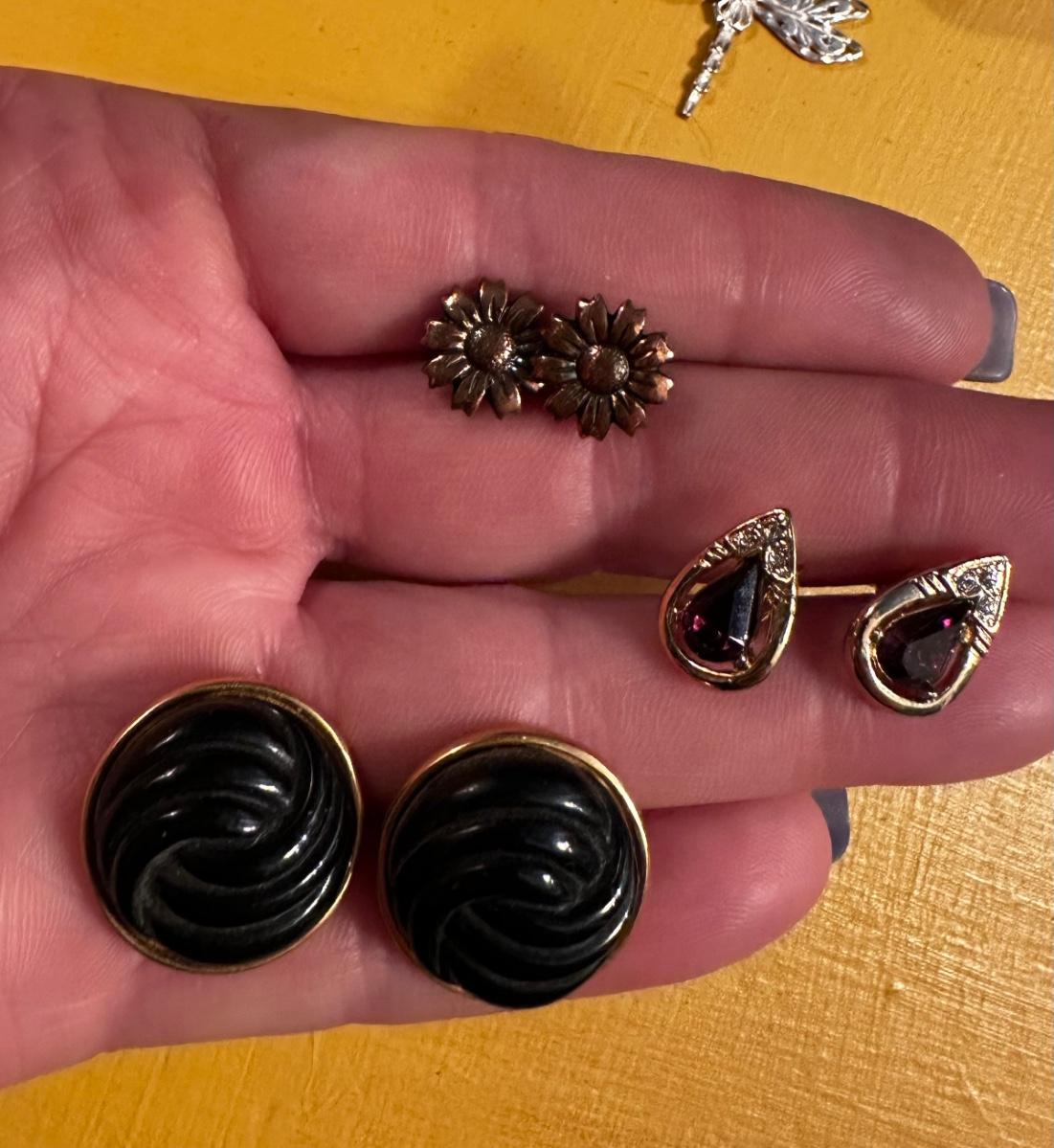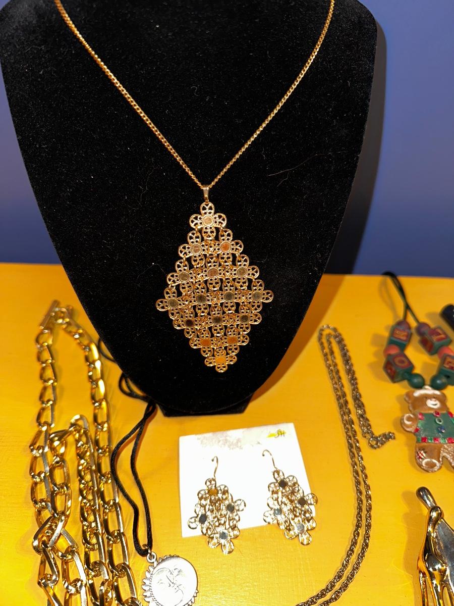 Beautiful gold tone Sarah Coventry necklace and earring set, among other great items. Some great vintage earrings in this lot!