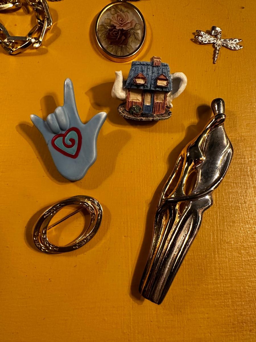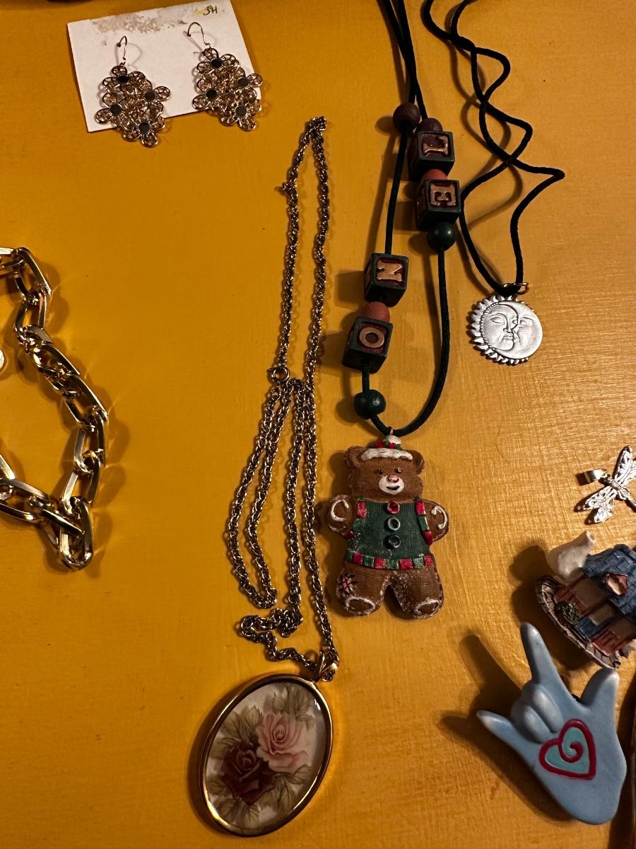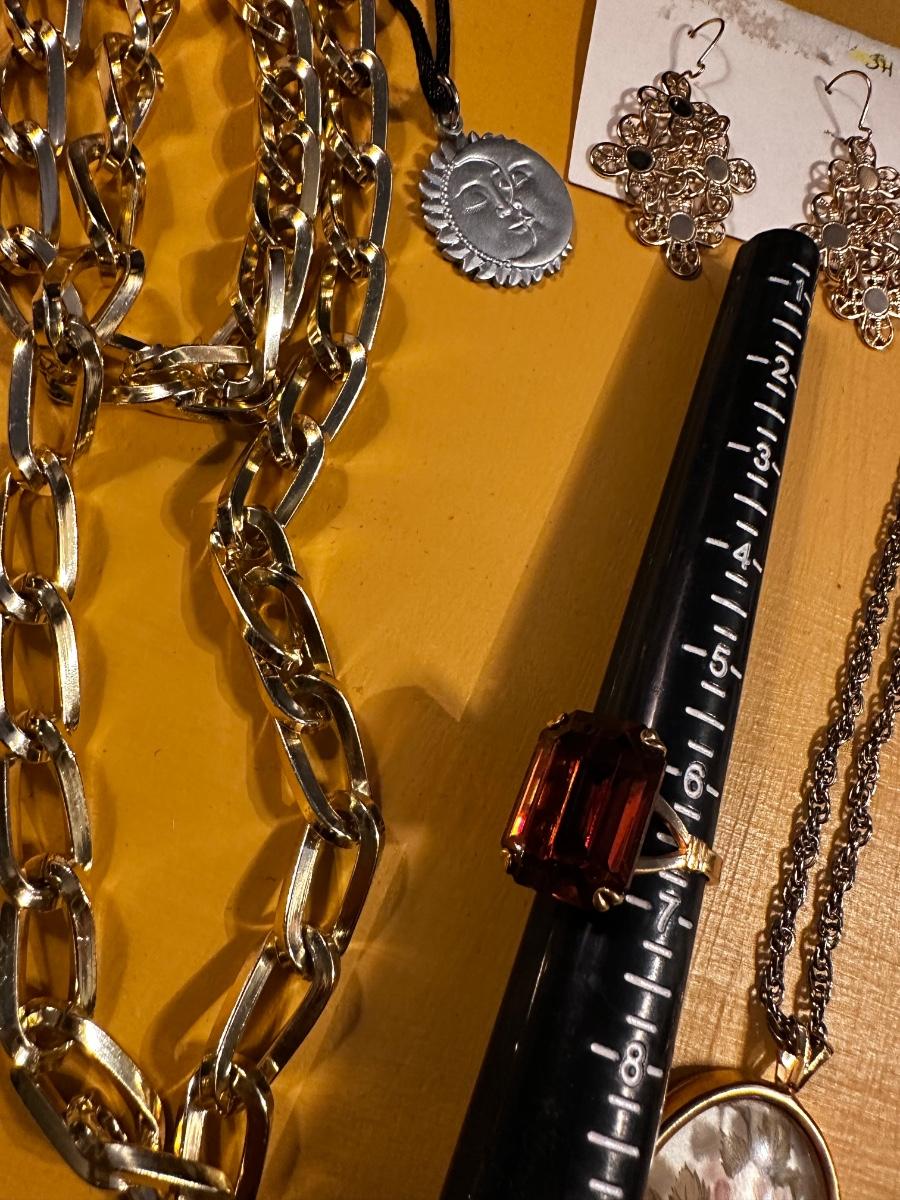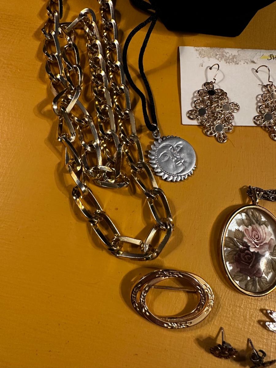 Beautiful gold tone Sarah Coventry necklace and earring set, among other great items. Some great vintage earrings in this lot!