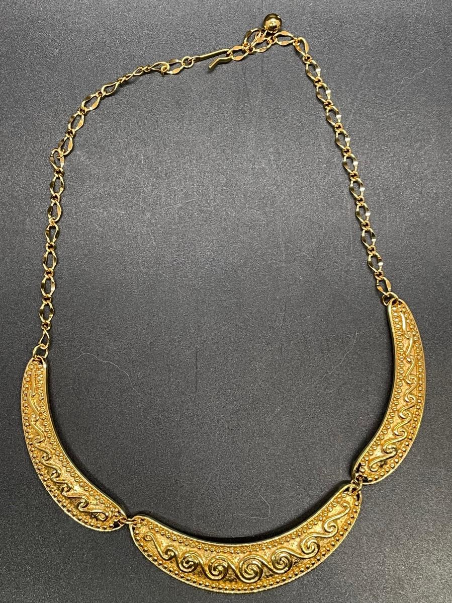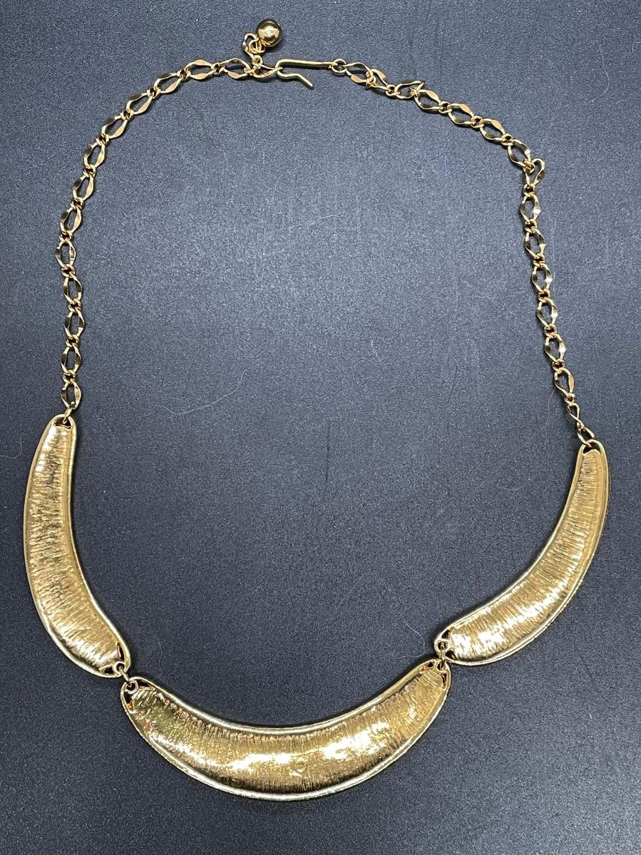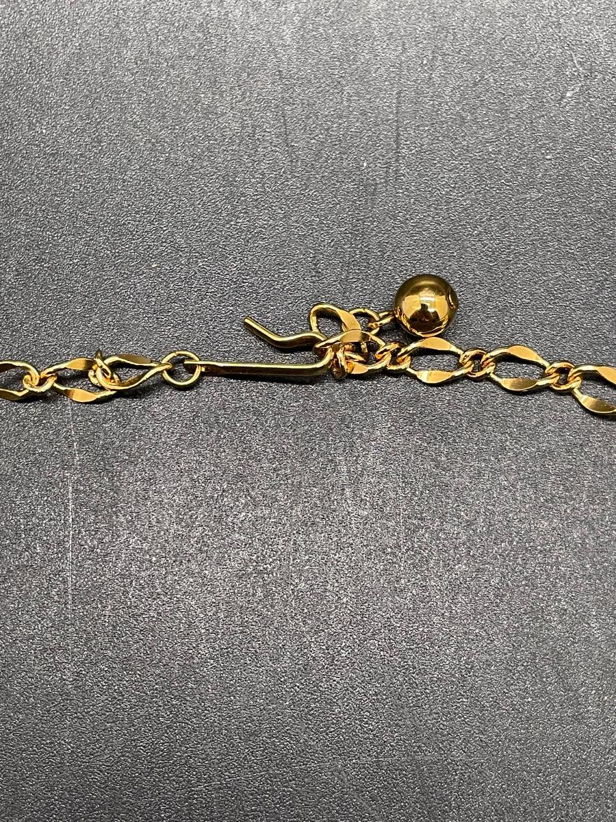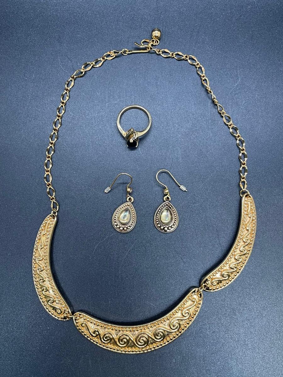 This set includes: one gold necklace, a ring, and a pair of dangling earrings. All items are in great condition. The backing of the necklace looks as if it would be easy to unhook. The ring seems to fit a size 7 or 8.