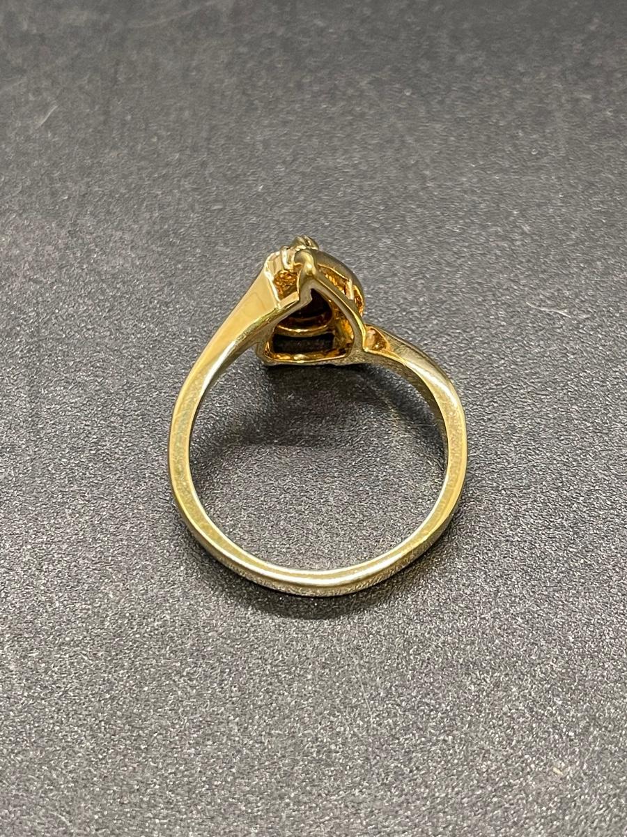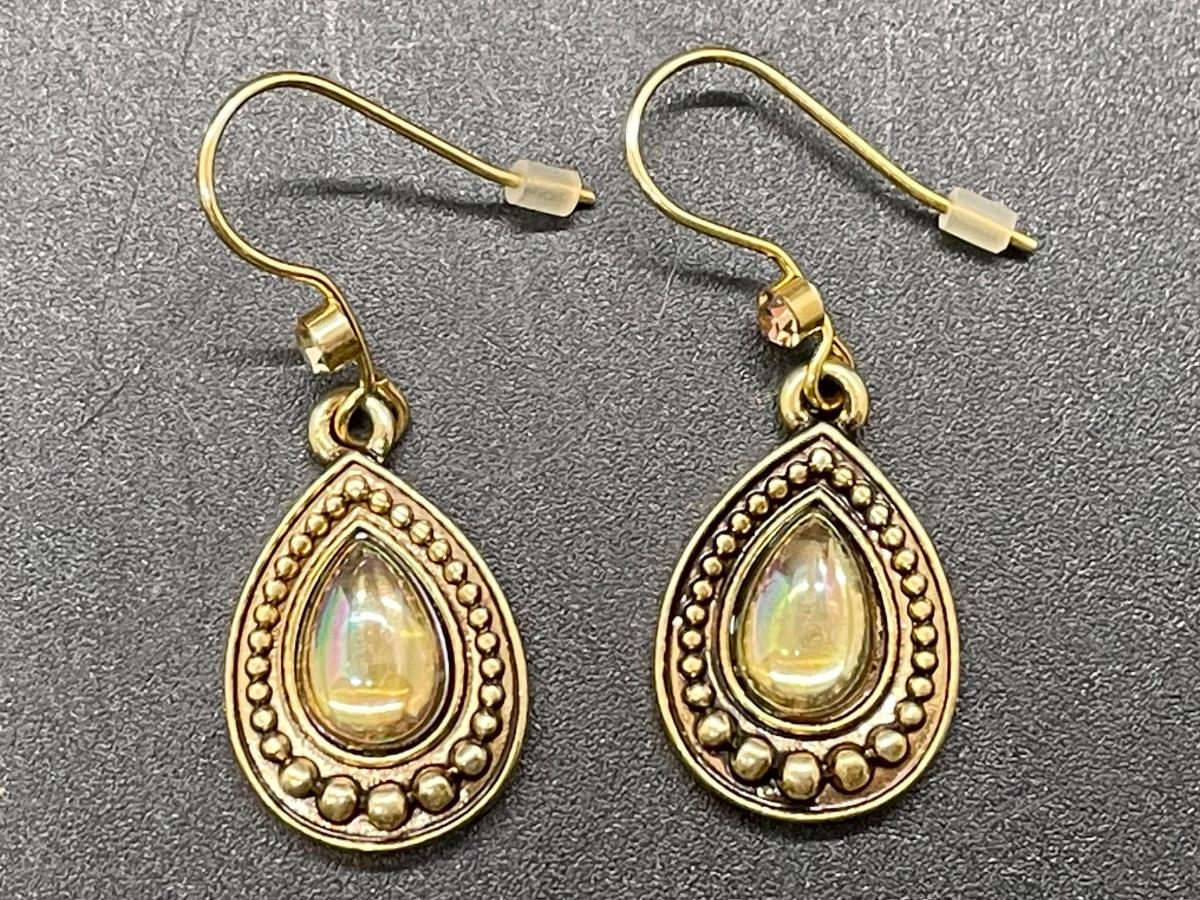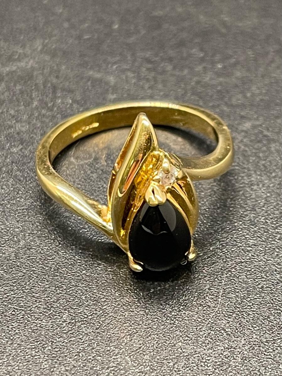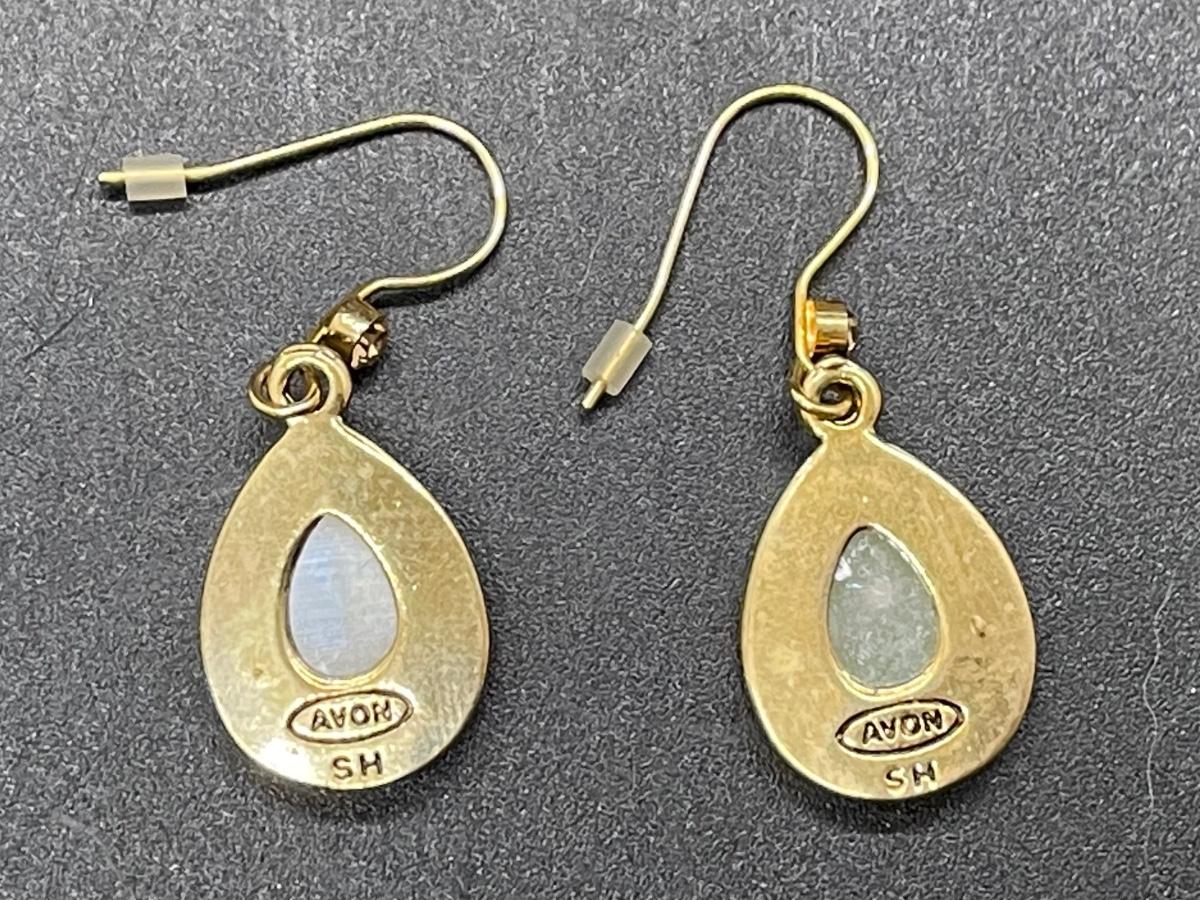 This set includes: one gold necklace, a ring, and a pair of dangling earrings. All items are in great condition. The backing of the necklace looks as if it would be easy to unhook. The ring seems to fit a size 7 or 8.