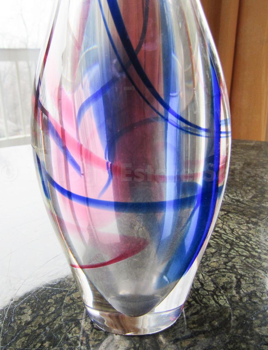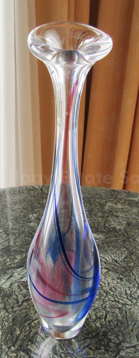 Swirled pink and blue glass vase 11.75” x 3” w