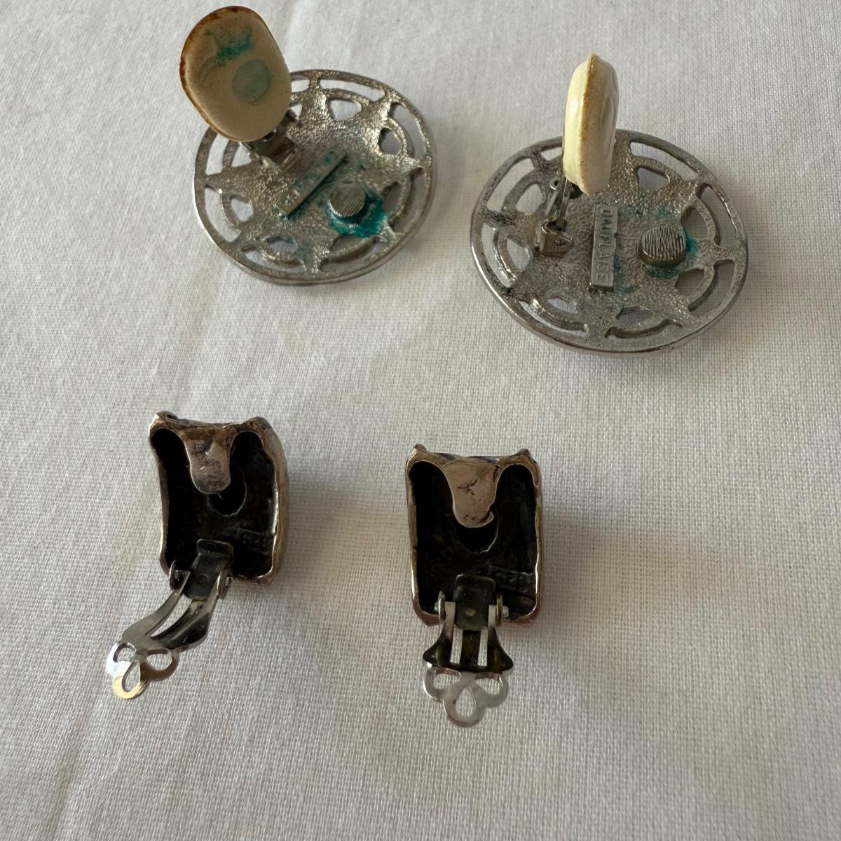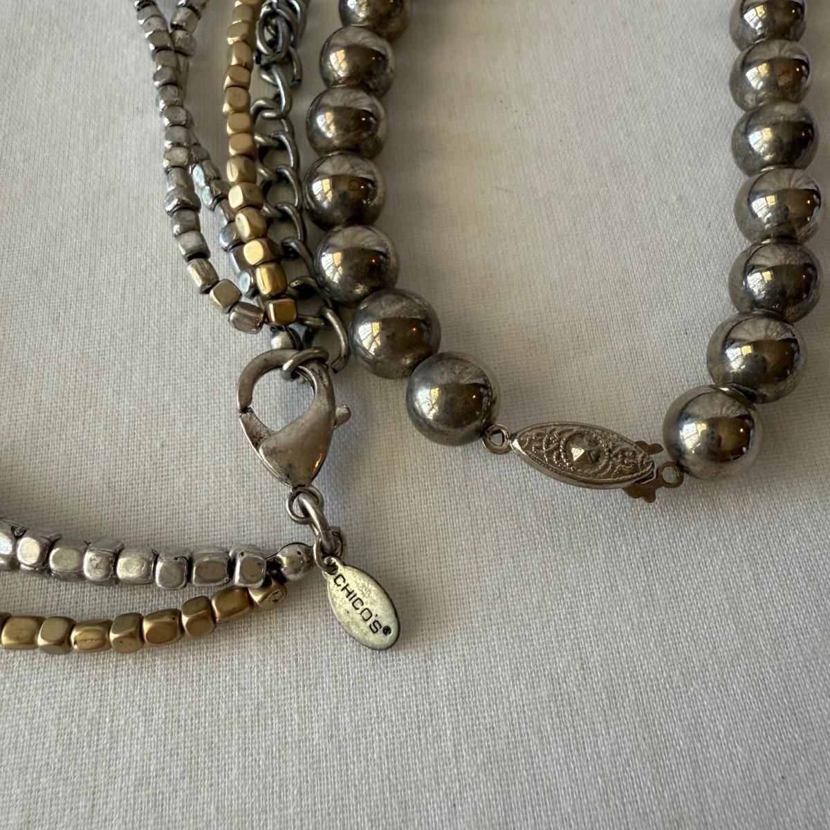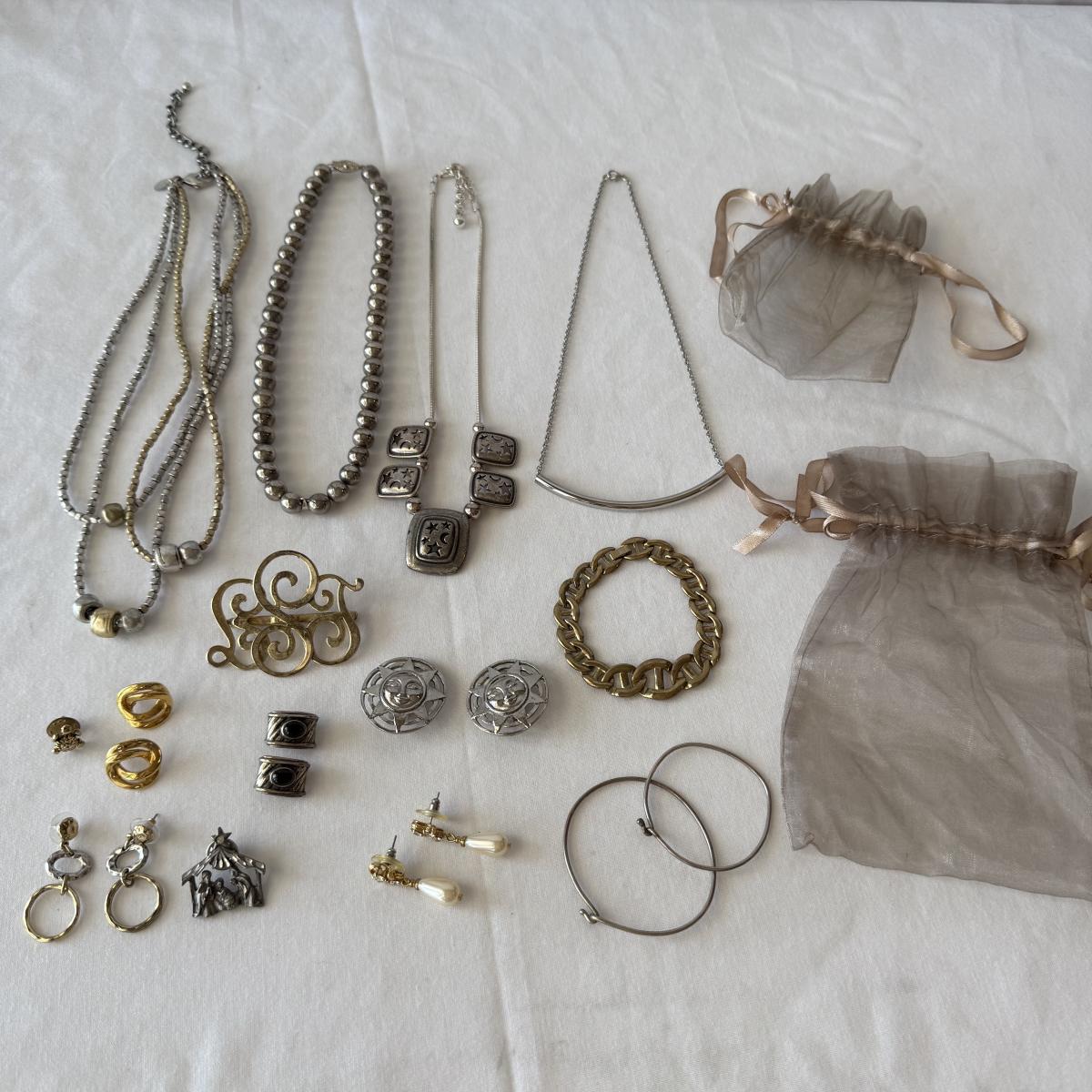Four necklaces, three bracelets, a brooch, a nativity pin, a turtle pin, and five pairs of earrings, both clip-on and pierced. A few items are marked Sterling/925. The three-stranded beaded necklace is adjustable from 18-23”. Two organza bags are included as well.