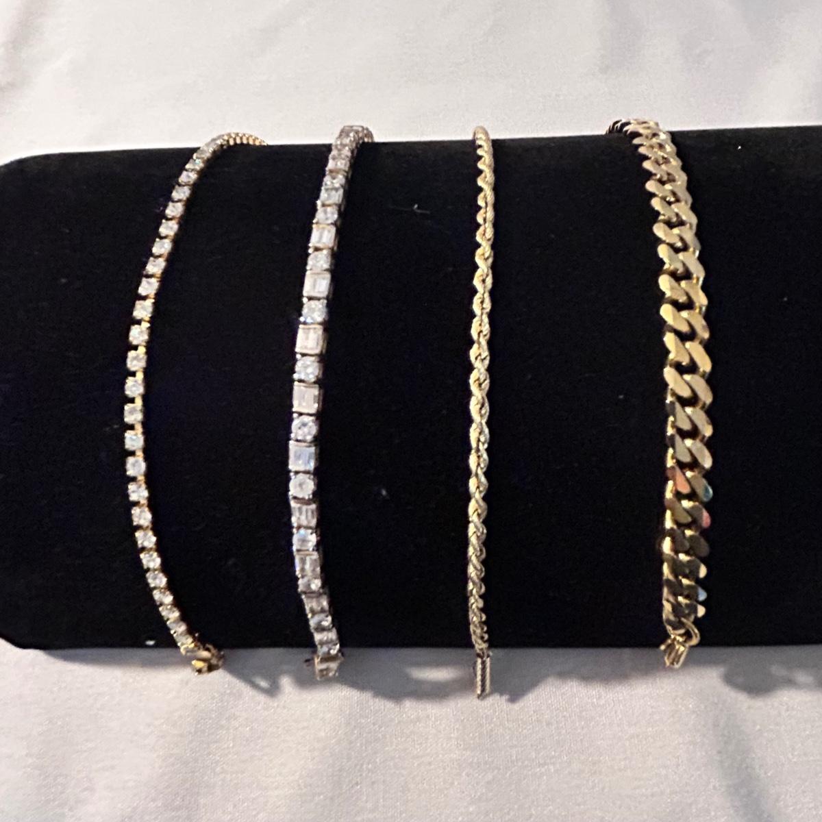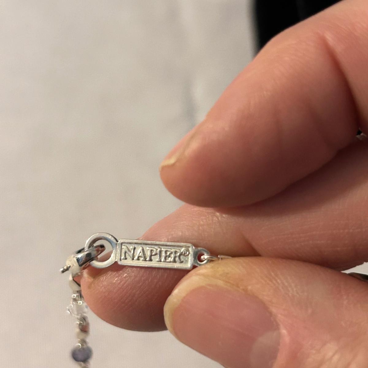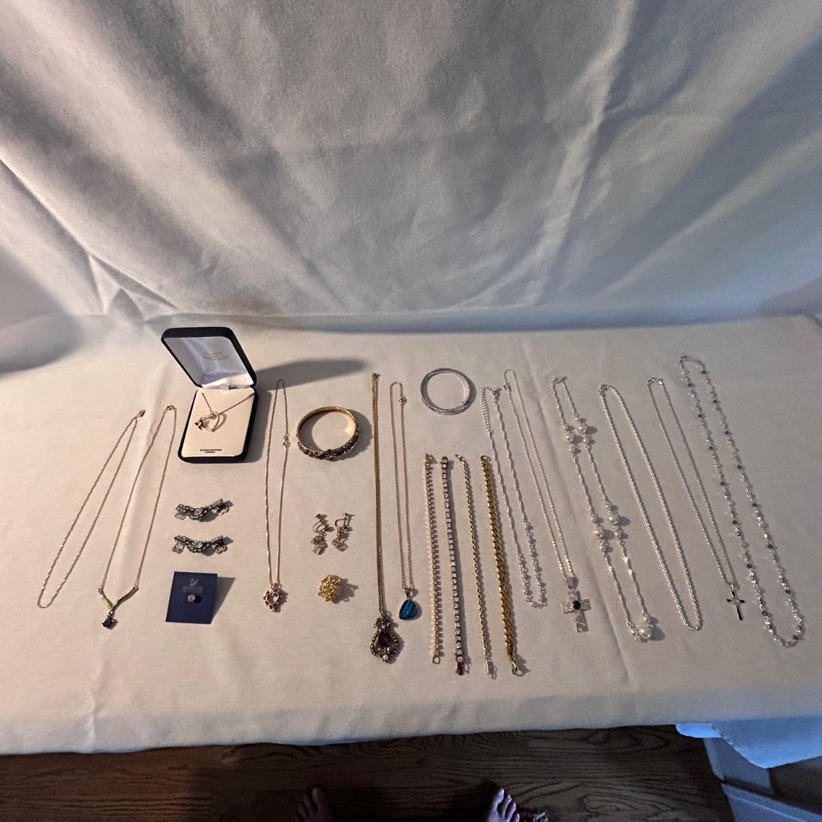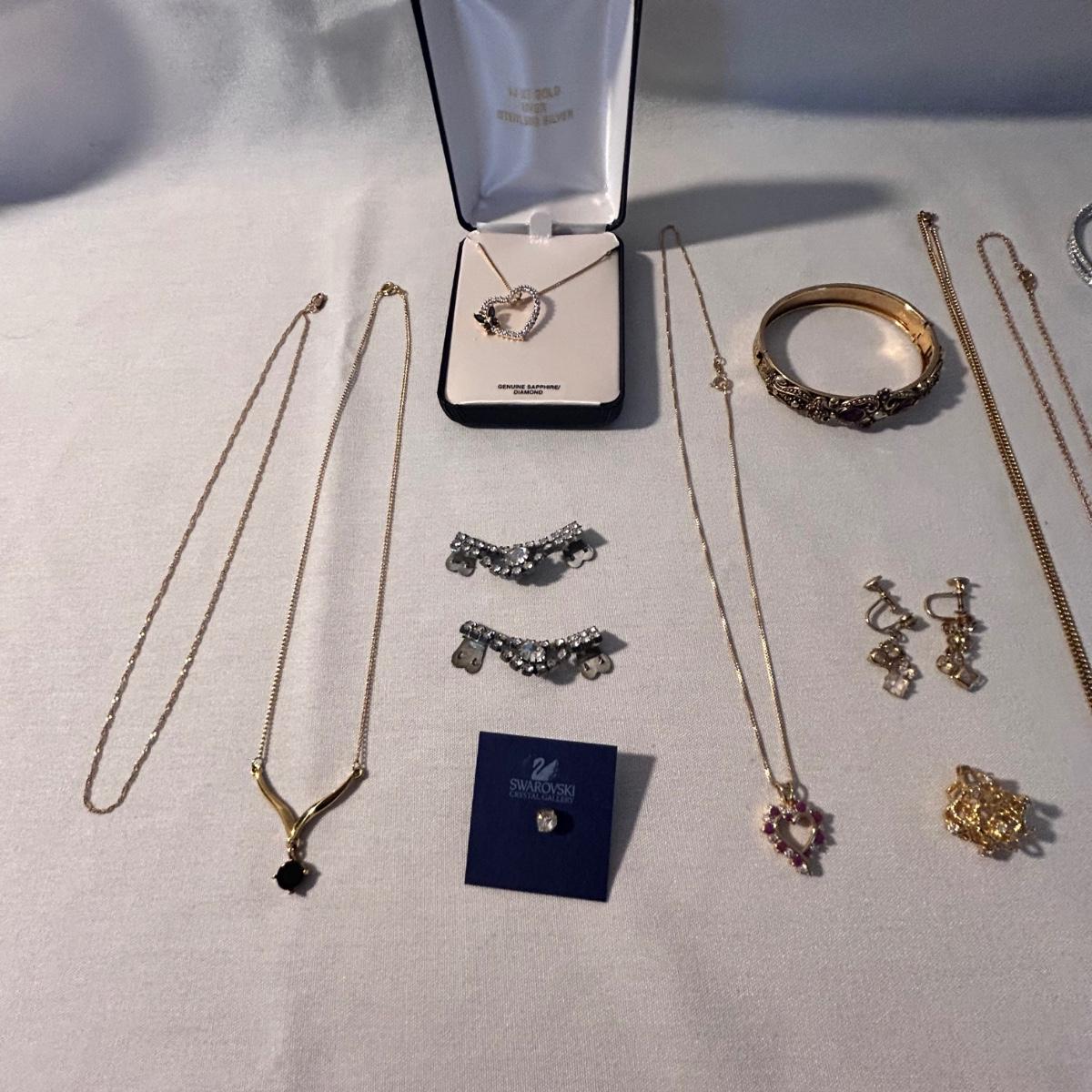 Lot includes gold and silver colored necklaces and bracelets mostly with some 925 notes in pix. Total of twelve necklaces with Napier and Avon brands, six bracelets with the smallest gold rope marked 14k. The shoe clips, Swarovski crystal pin are all very sparkly. One pair of clip earrings. Longest necklace is 12” long. Shipping available. All sales are final. No returns or refunds. Please bid accordingly.
