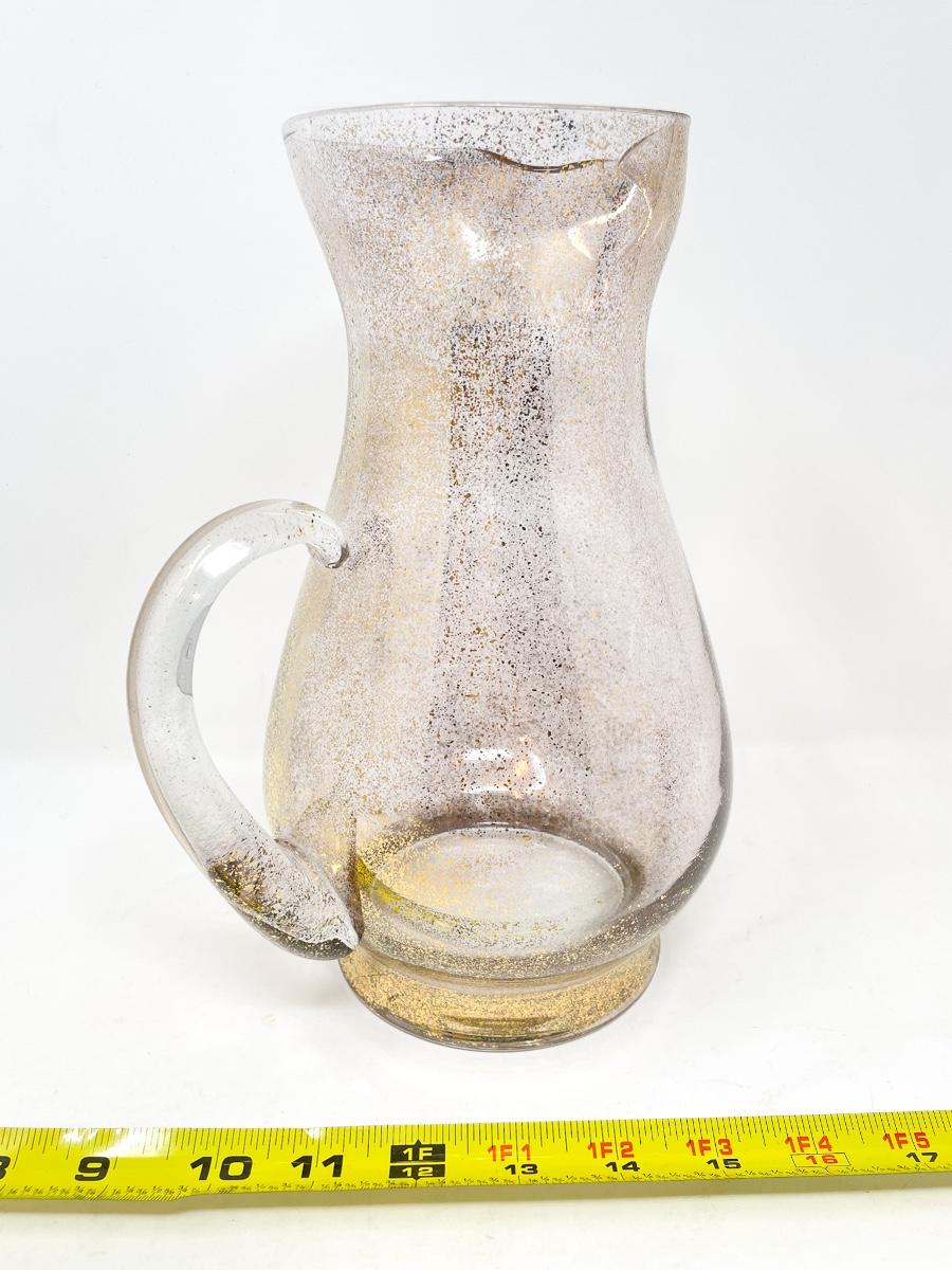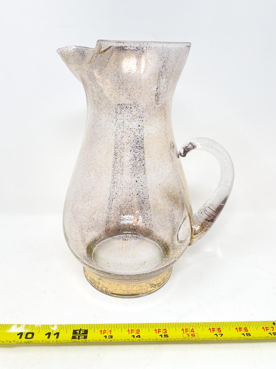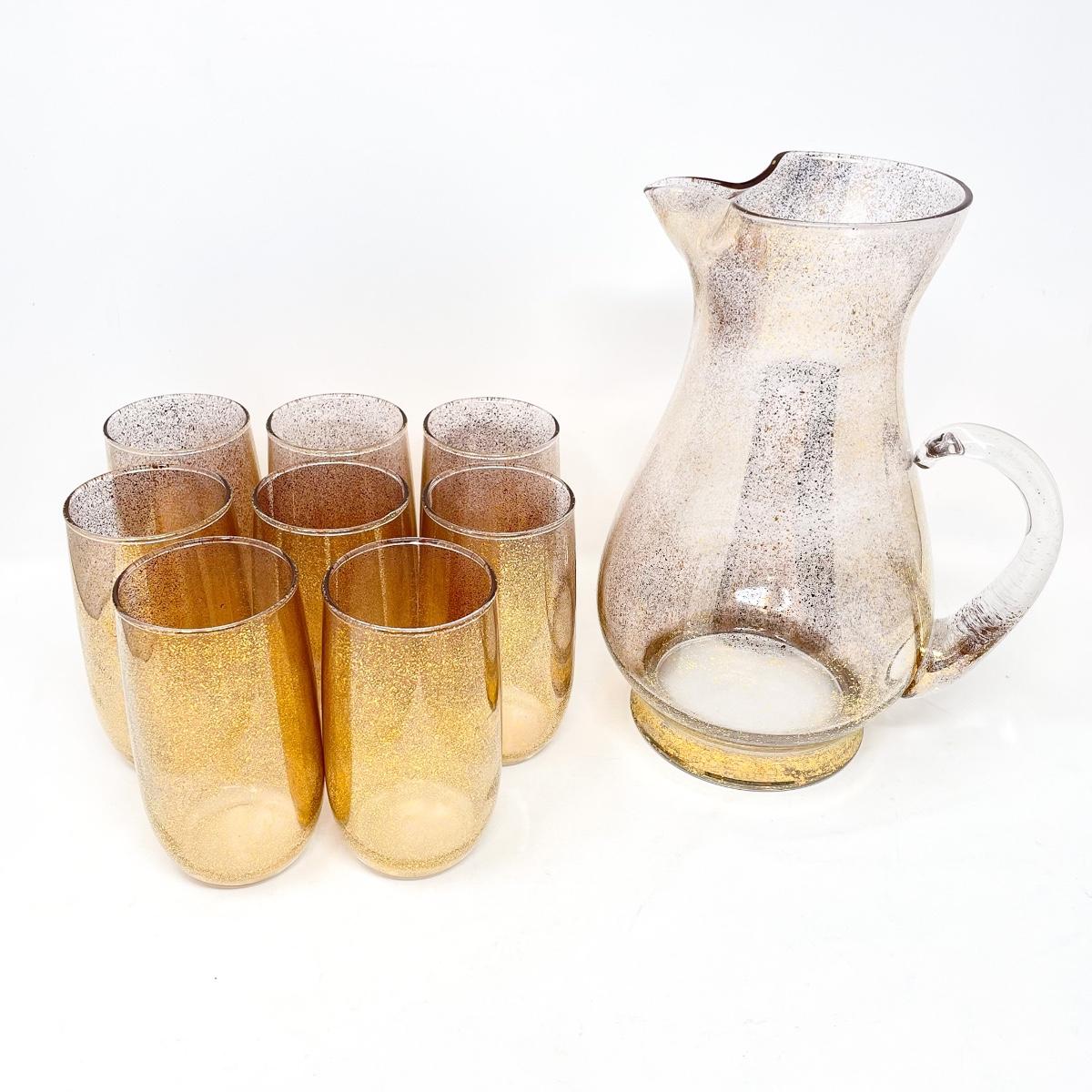 VINTAGE GOLD SPECKLED GLASS PITCHER AND 8 GLASSES
