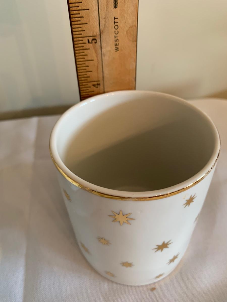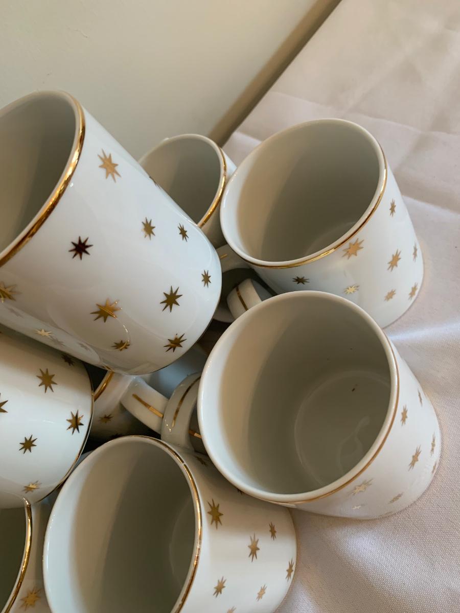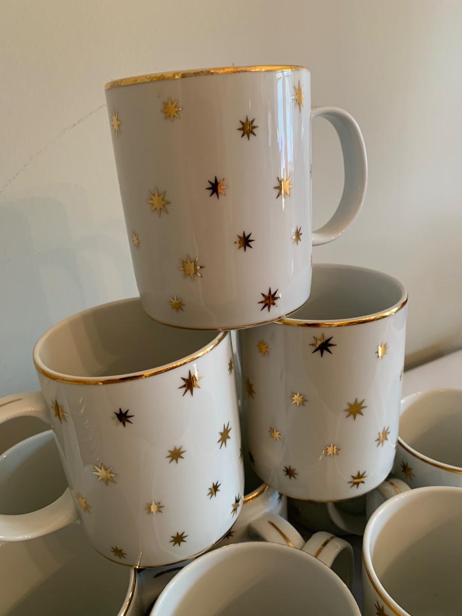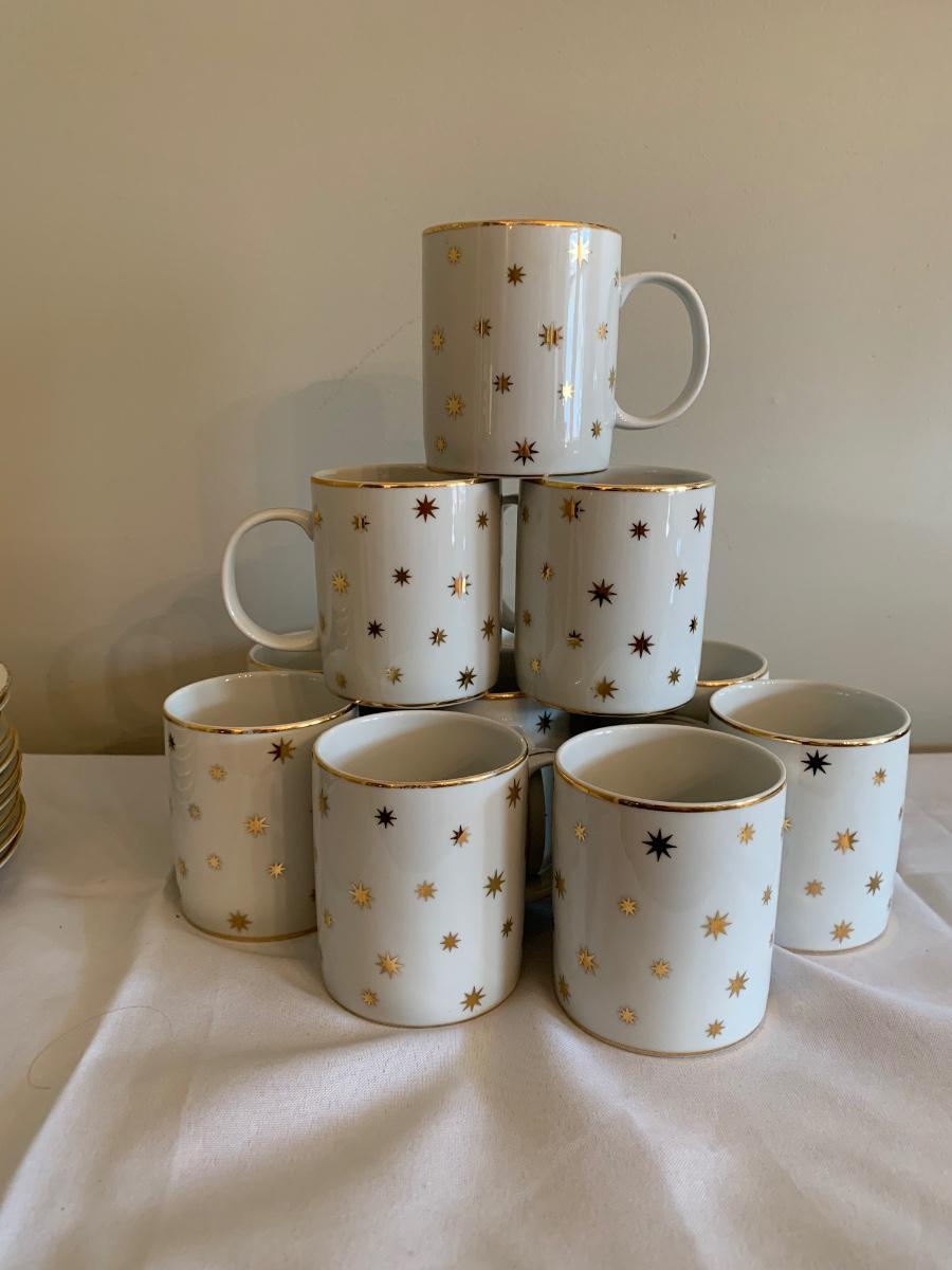 Set of 11 holiday/ festive gold Star ceramic mugs by Lillian Vernon