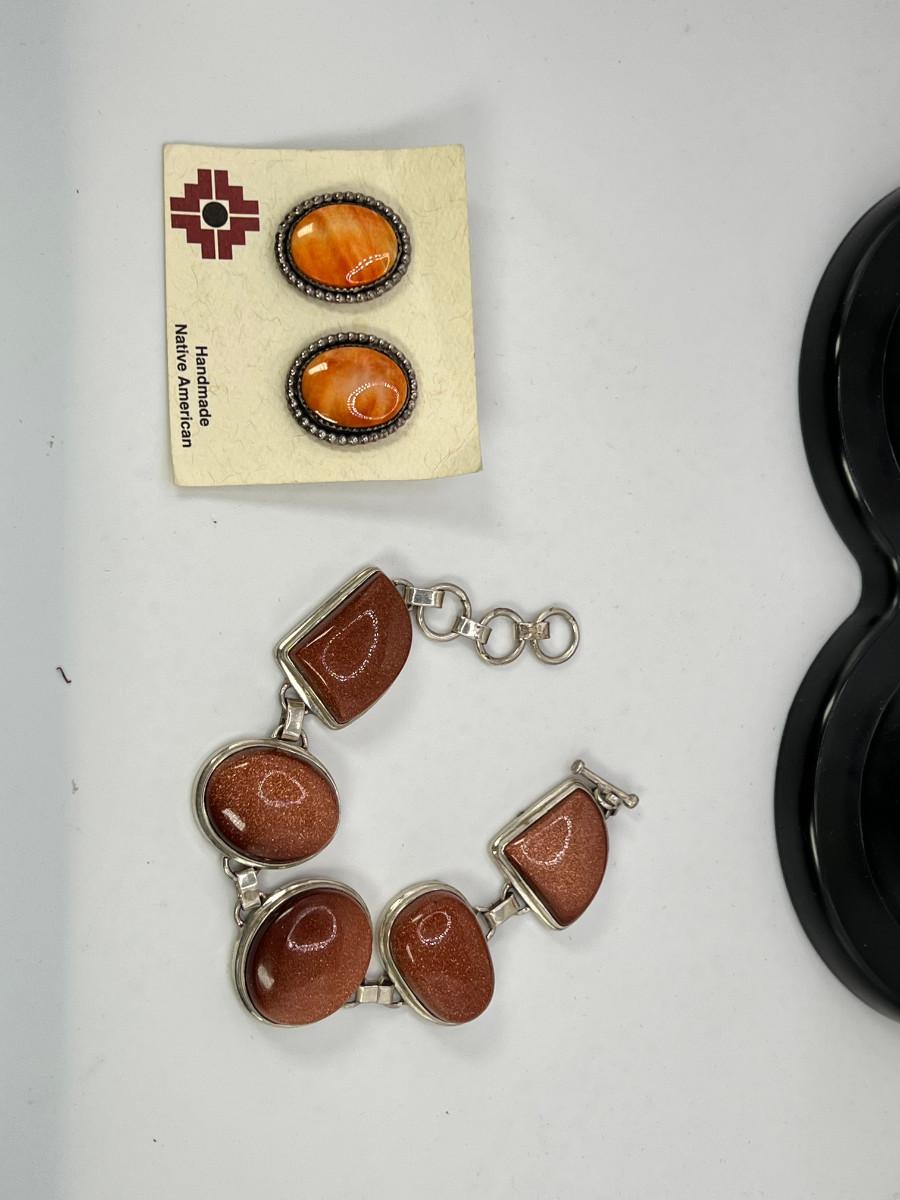 Gold Stone bracelet and Orange spiney oyster shell  clip on earrings