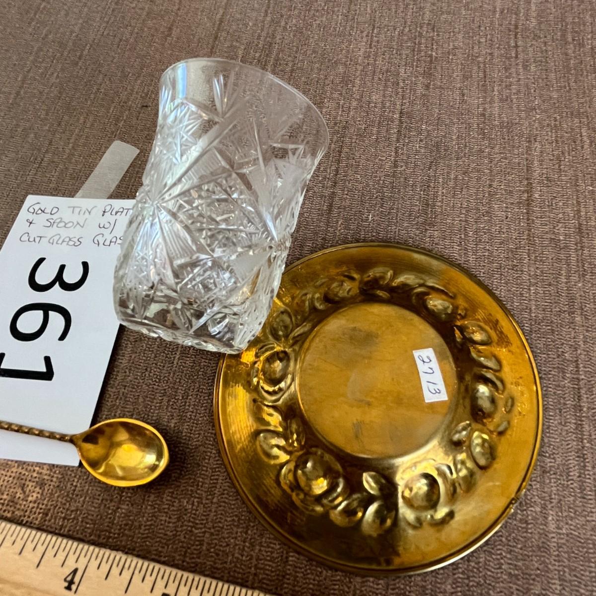 Gold Tin Plate & Spoon w/ Cut Glass Glass