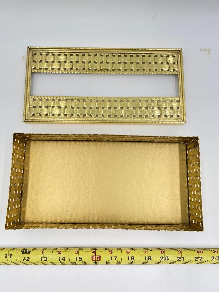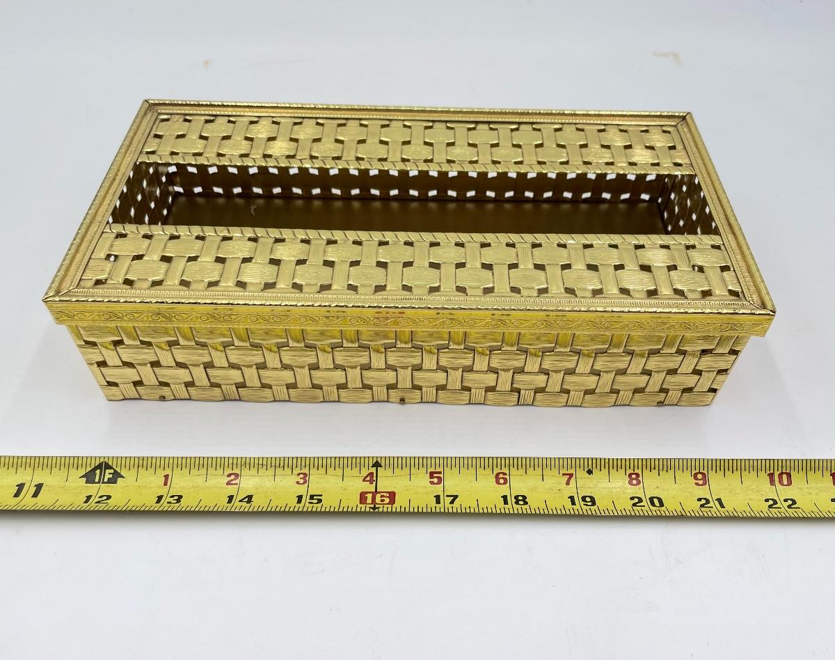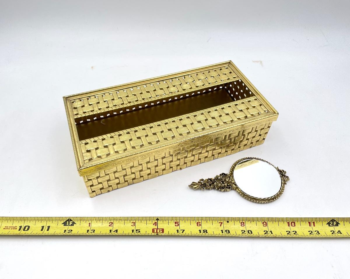 Mirror measure approx 5” long, tissue box approx 10” long. Both in good condition.