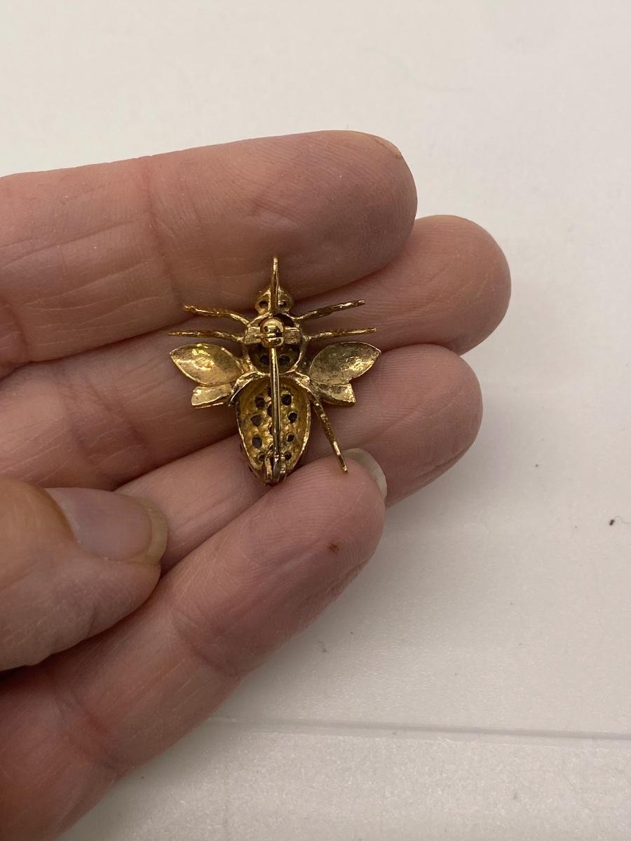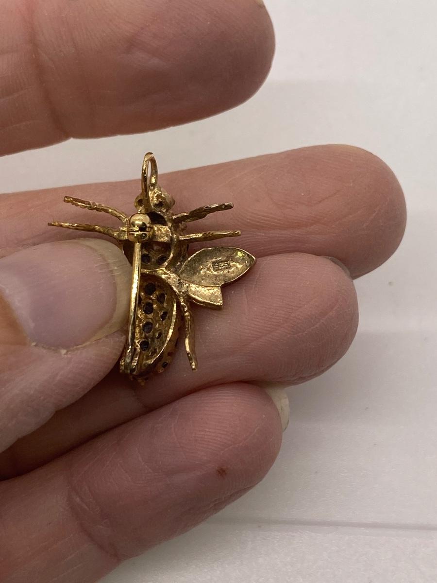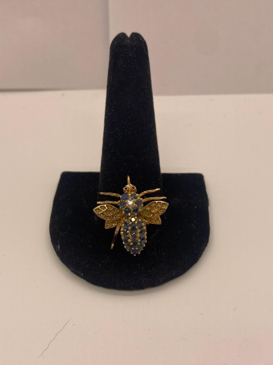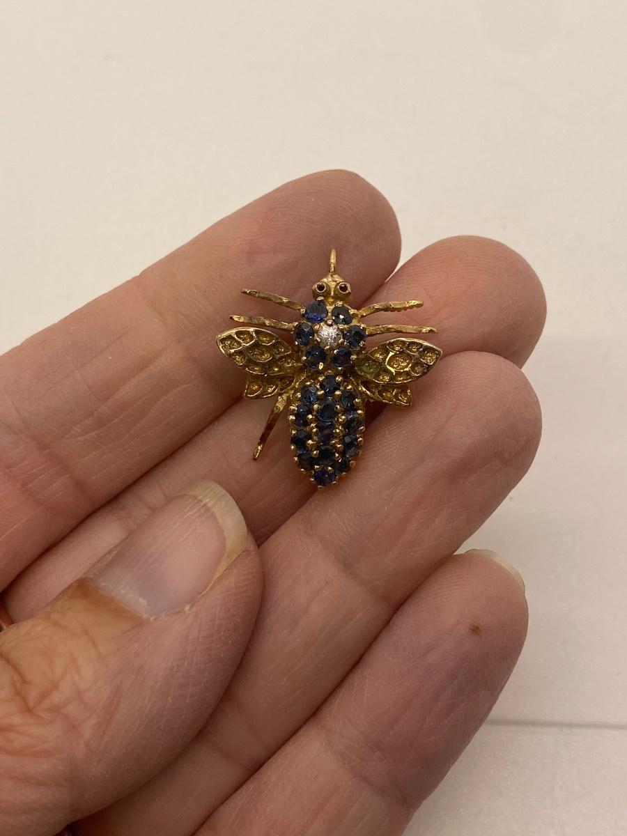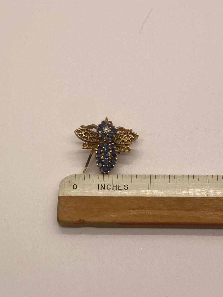 Gold Tone 925 Sterling Silver Bee Pendant Pin with Blue Sapphire Like Stones. Marked 925 on wing. Missing one leg but would still wear nicely. Stones look like sapphire but may be lab created.