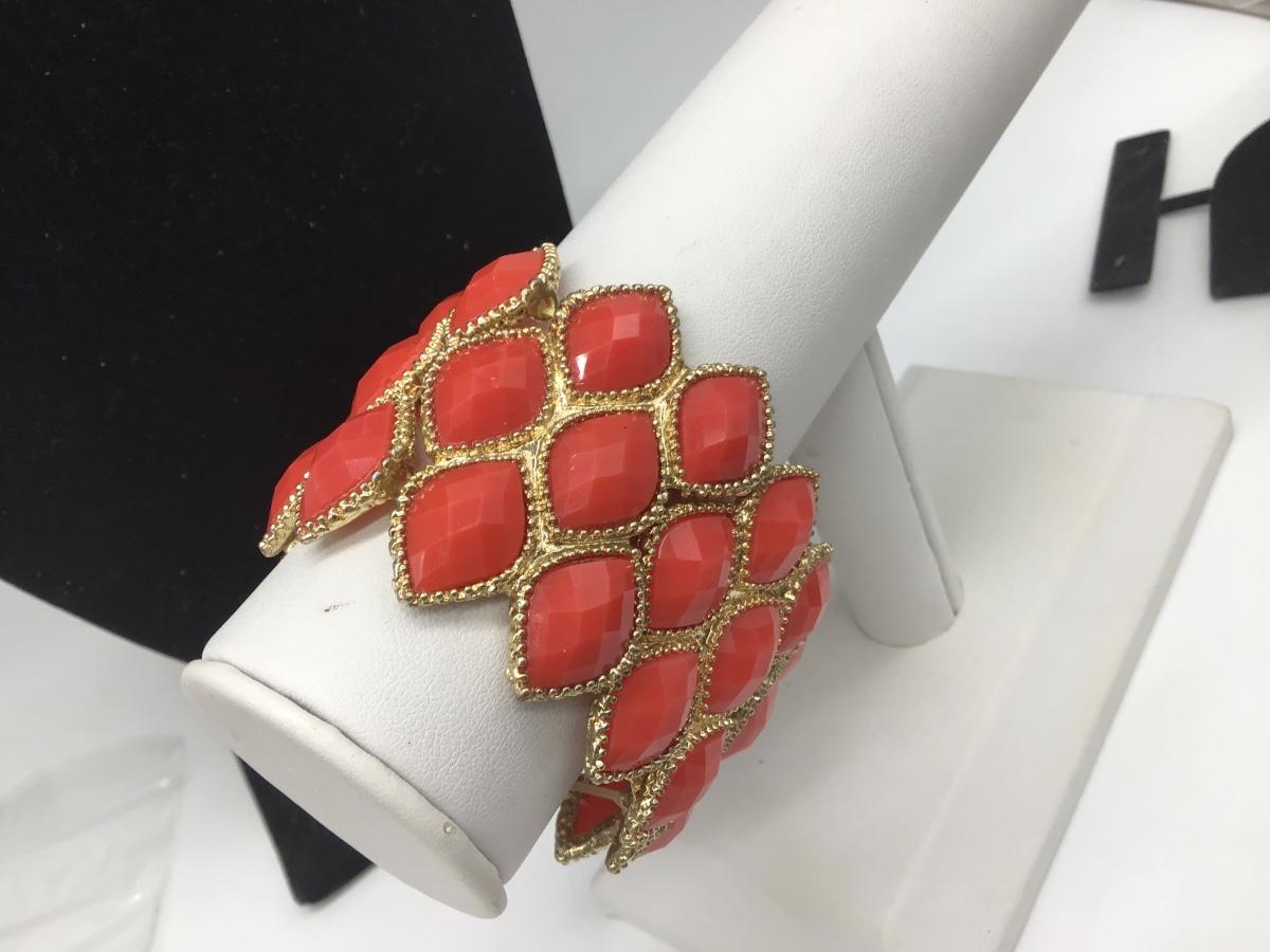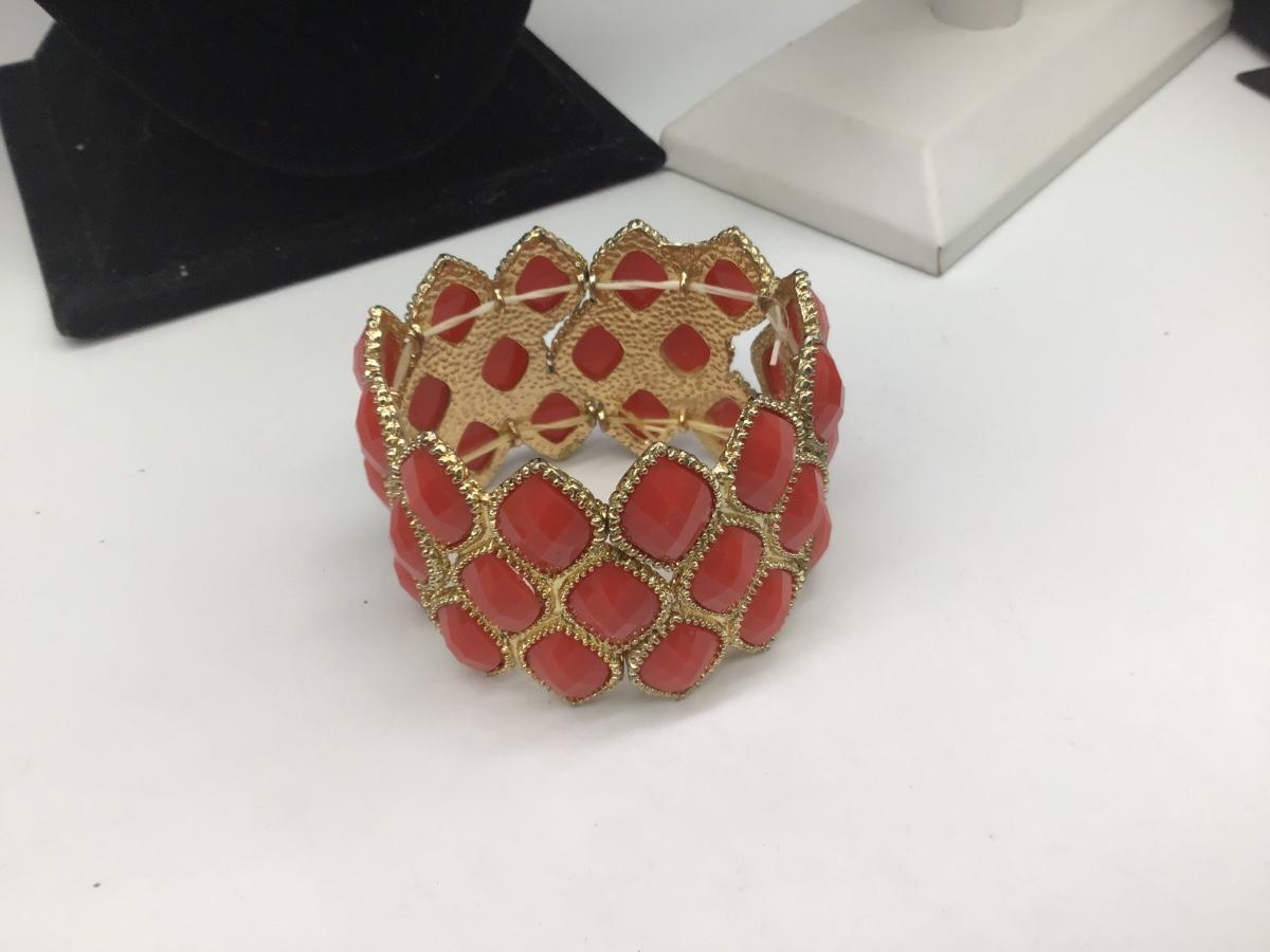 Gold Tone and Bright Coral Teardrop Faceted Beads Stretch Bracelet