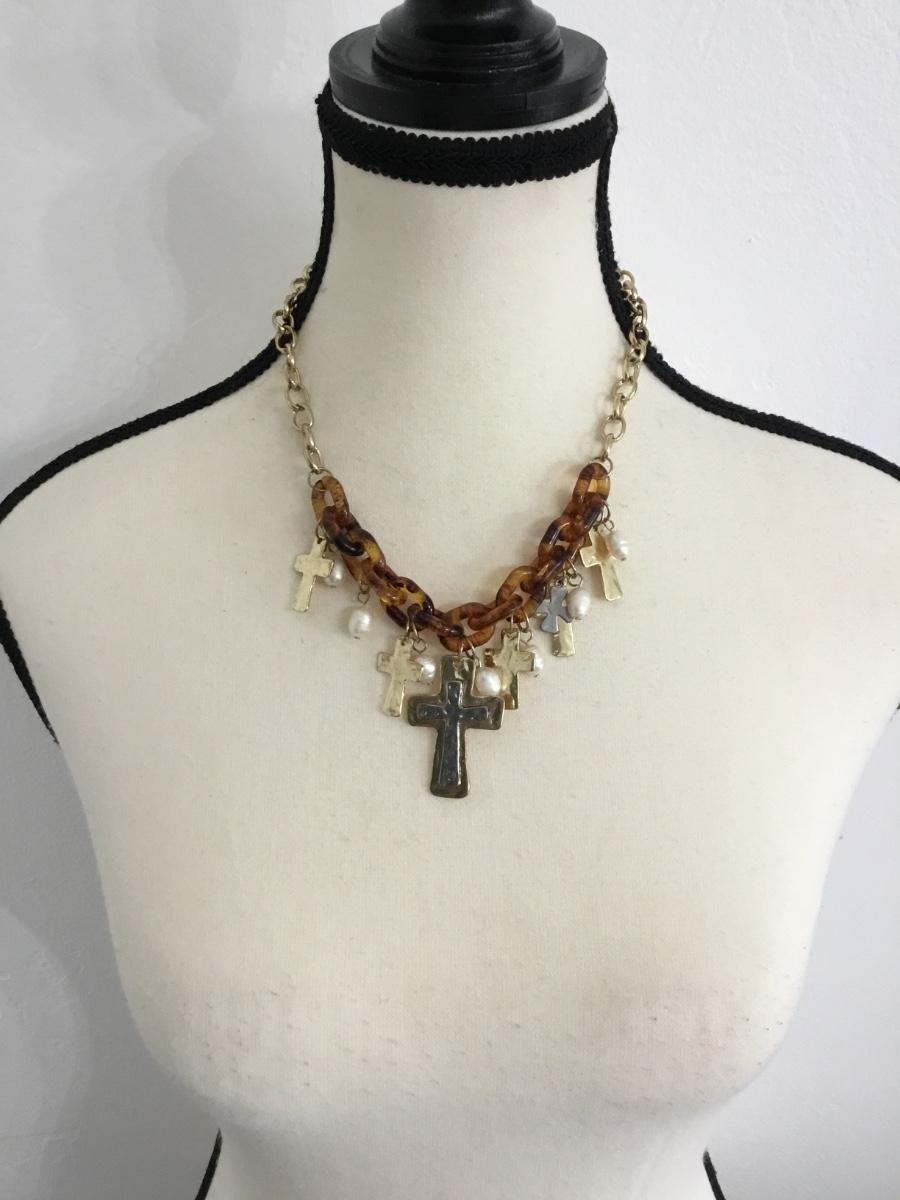 Gold tone and faux tortoise shell, plastic and cross charm statement necklace