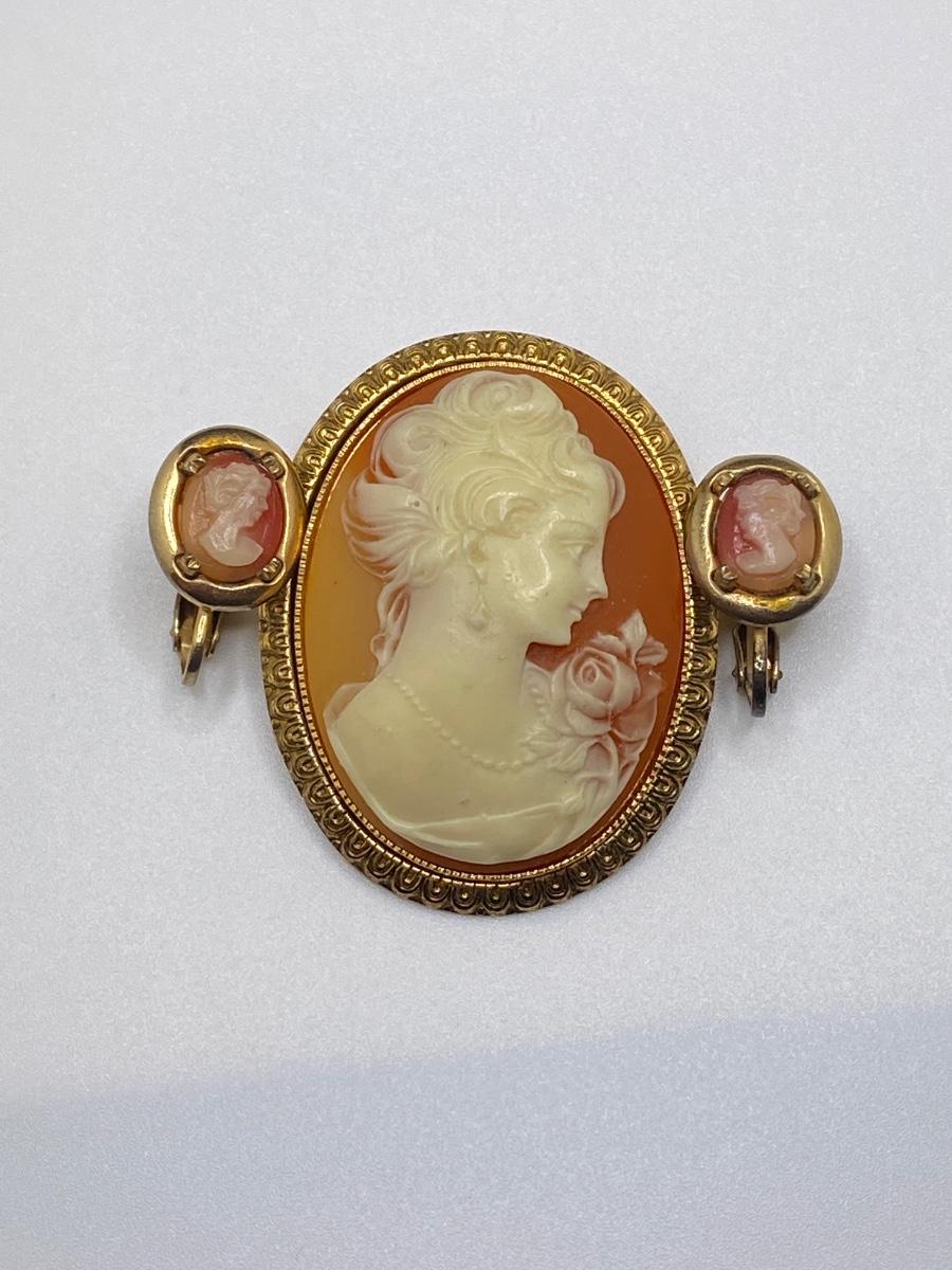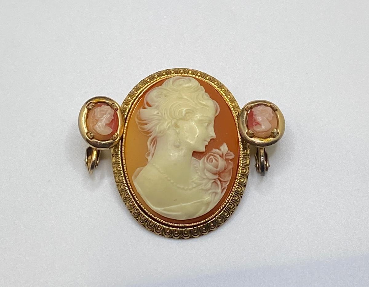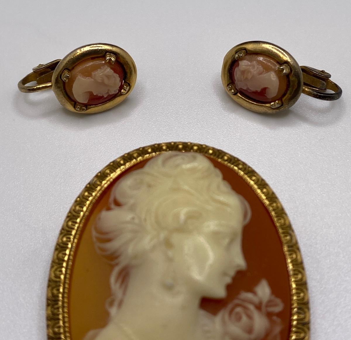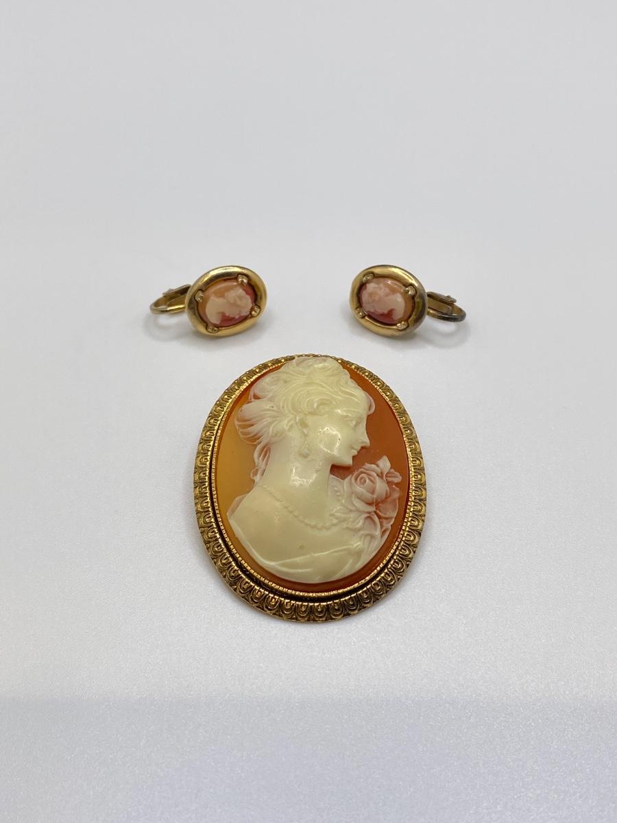 Gold Tone and Red Orange Cameo Pin or Pendant and Earring Set