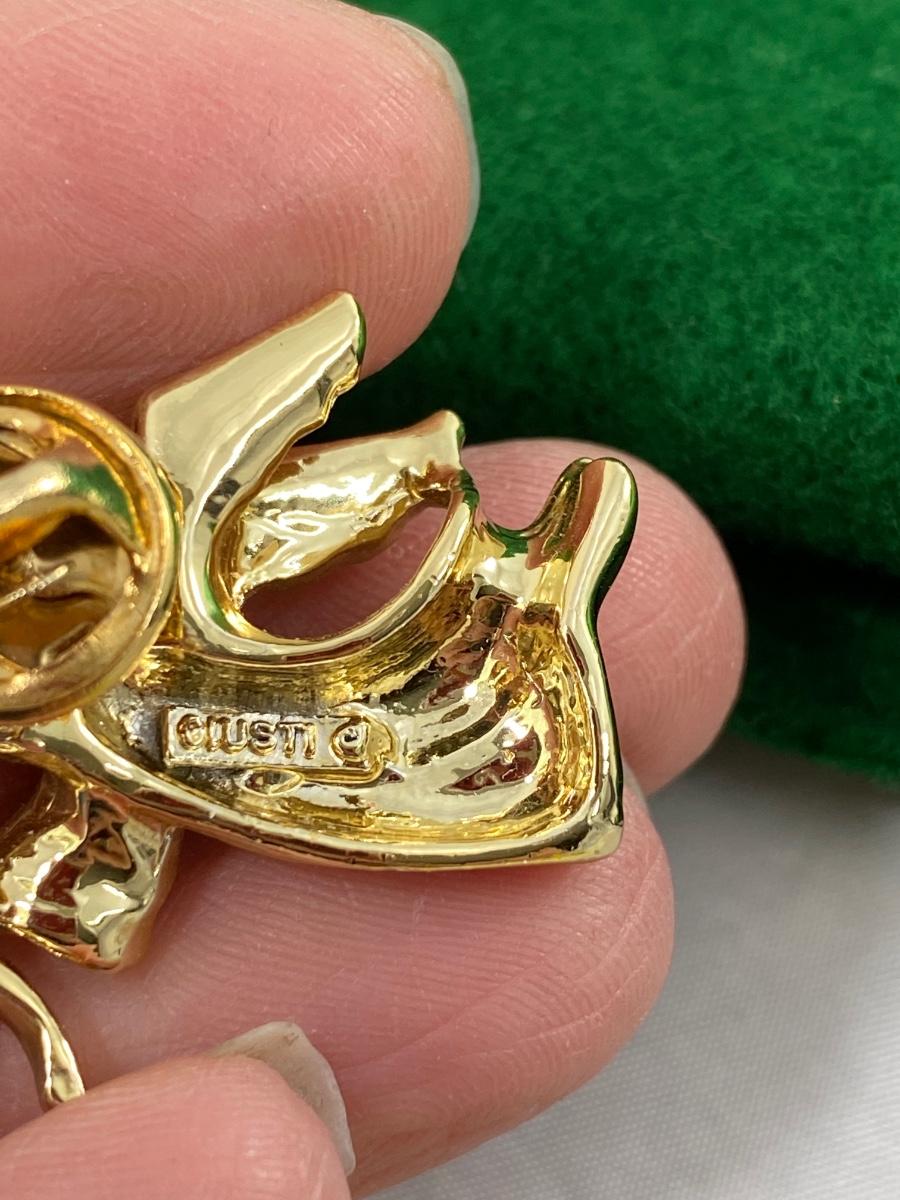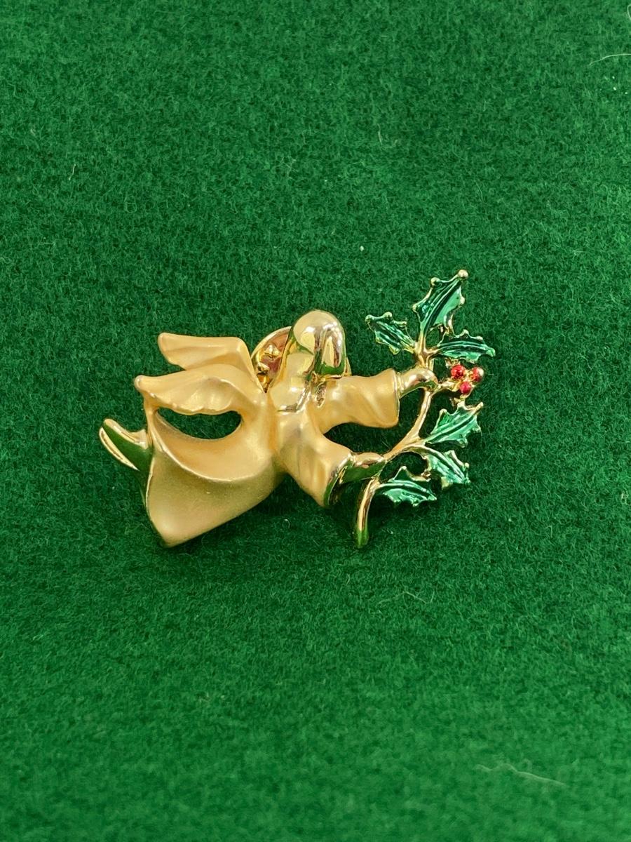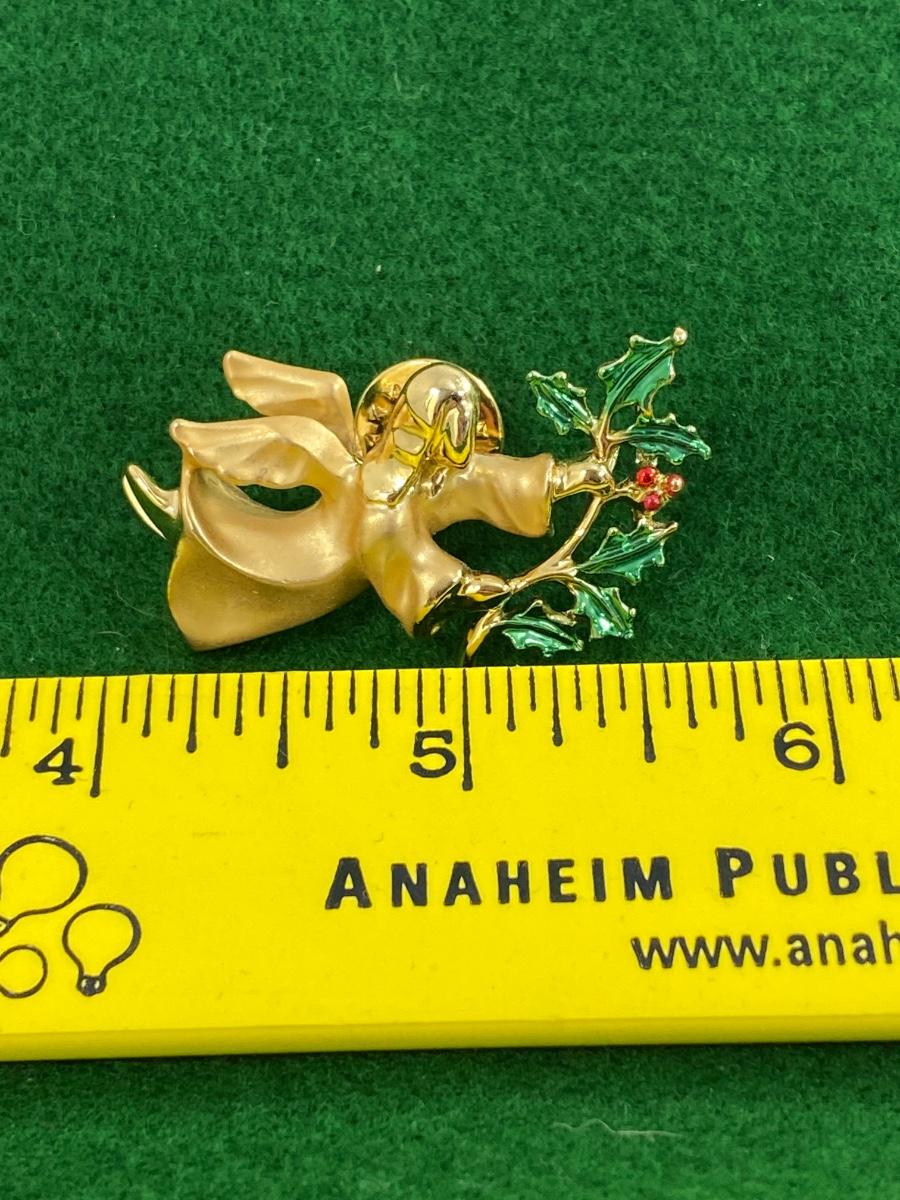 Gold Tone Angel Holding Enamel Painted Holly Lapel Pin. Holly is painted green and red. About 1.5" size and is branded on the back.