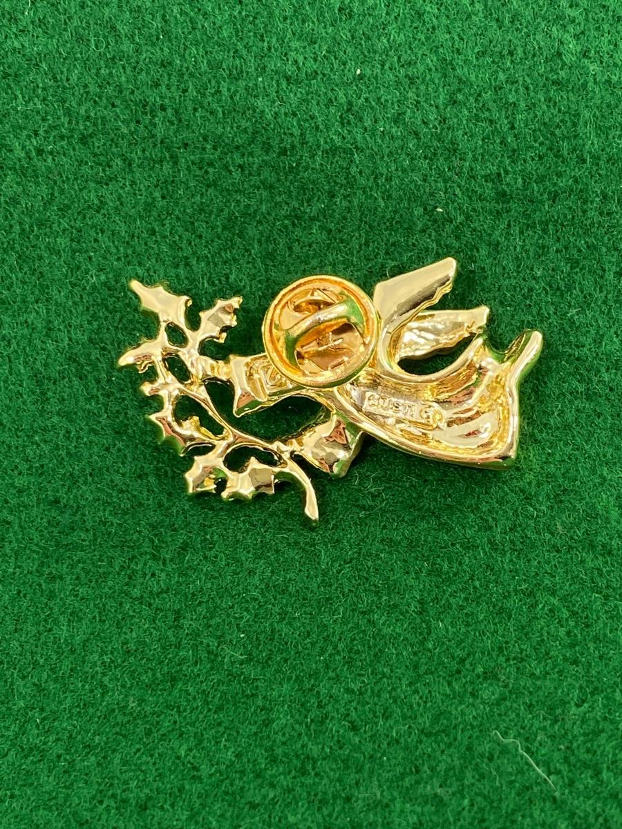 Gold Tone Angel Holding Enamel Painted Holly Lapel Pin
