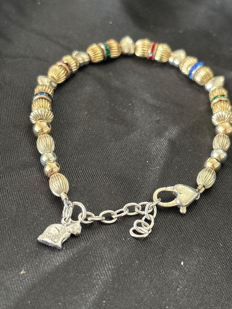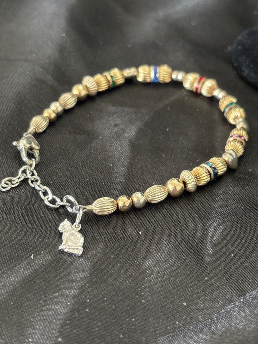 Gold tone beaded bracelet with silver tone cat charm
