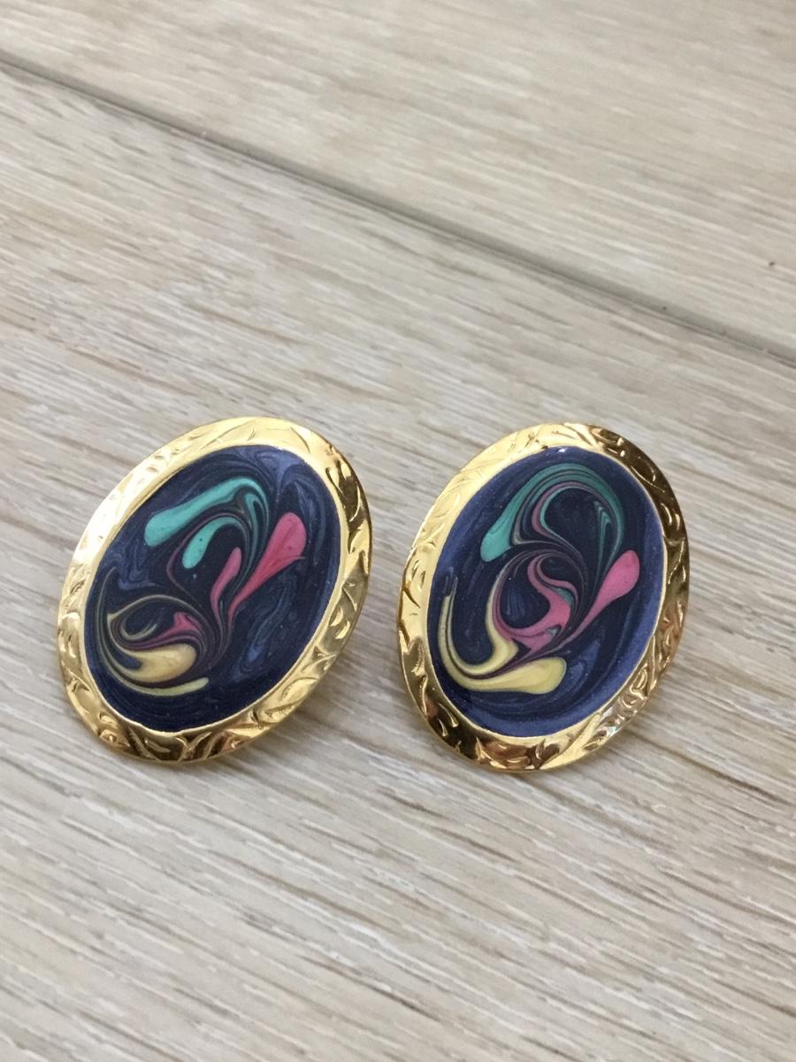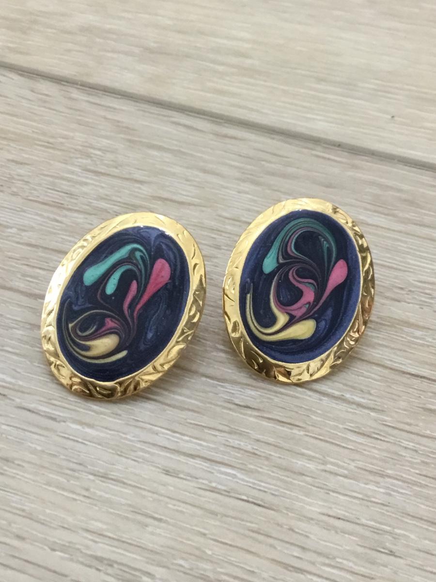 Gold tone black pink and green fashion earrings